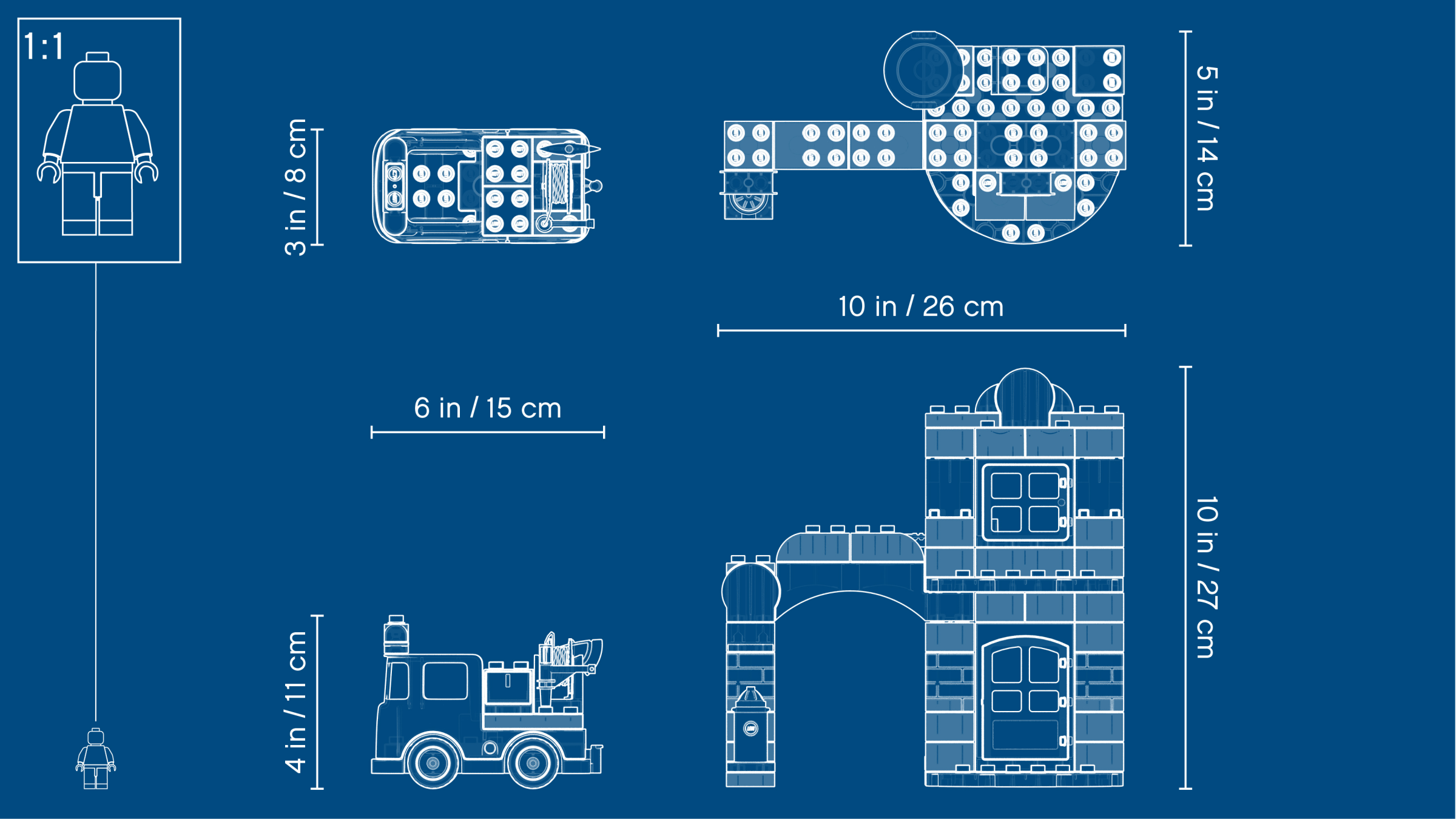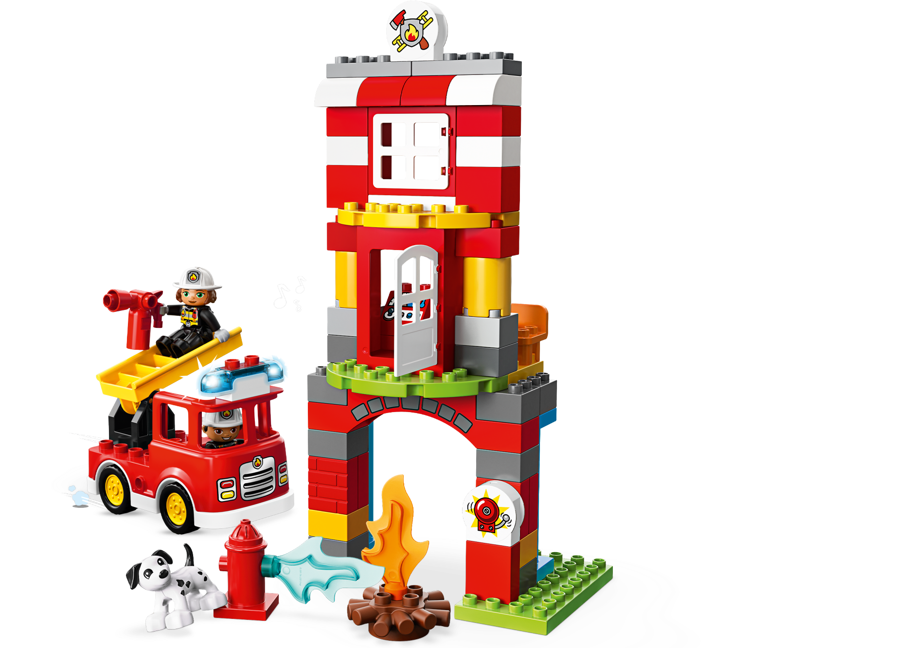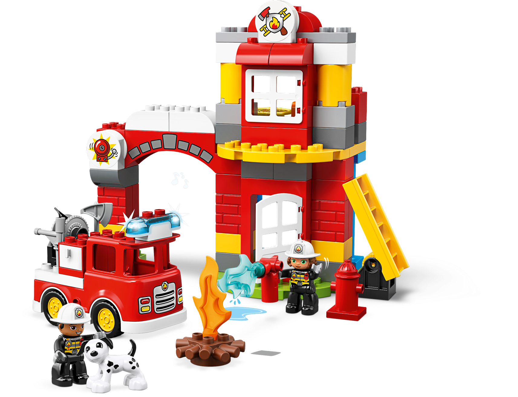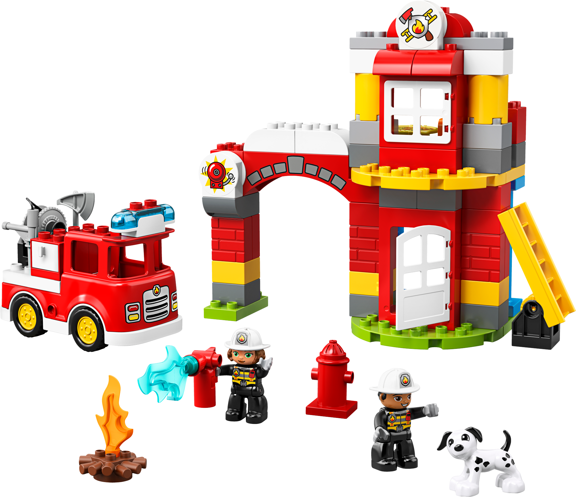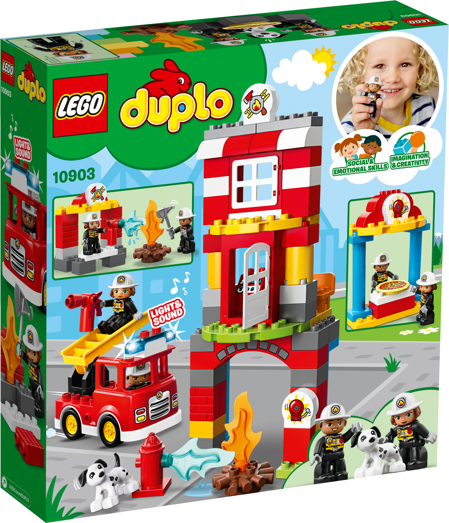 Play out real-life scenarios in LEGO® DUPLO® Town: a recognizable world with modern DUPLO figures. Visit the easy-to-build 10903 Fire Station and enjoy pretend play, helping the firefighters as they practice putting out the campfire and climbing the ladder to rescue the station dog in the tower. When the call comes in, help your toddler jump the firefighters into the fire truck, turn on the flashing light and siren, and head off on another daring rescue! Includes 2 DUPLO figures plus a dog figure. Includes 2 LEGO® DUPLO® firefighter figures plus a dog figure. Features an easy-to-build fire station toy with tower and a fire truck toy for toddlers with lights and siren sound. Accessory elements include a ladder, hose, fire extinguisher, axe and a campfire. Press the button on the kids' fire truck toy to activate the siren and lights. Join in with firefighter training at the station, then rush to the rescue in the red fire truck toy! Use the modern characters, accessories and decorated bricks to have fun while helping your toddler learn about everything firefighters do for us. Help your child develop fine motor skills as they build this toy fire station playset. This firefighter toy for kids makes an ideal gift for preschool children. LEGO® DUPLO® products are specially designed to be fun and easy for little hands. There are lots of LEGO® DUPLO® Town products to collect and play out your child's everyday life in a recognizable DUPLO world. Combine with the 10901 Fire Truck for even more firefighter-themed fun. Fire station measures over 10” (26cm) high, 9” (25cm) wide and 4” (12cm) deep. Fire truck measures over 3” (10cm) high, 5” (14cm) long and 2” (7cm) wide.