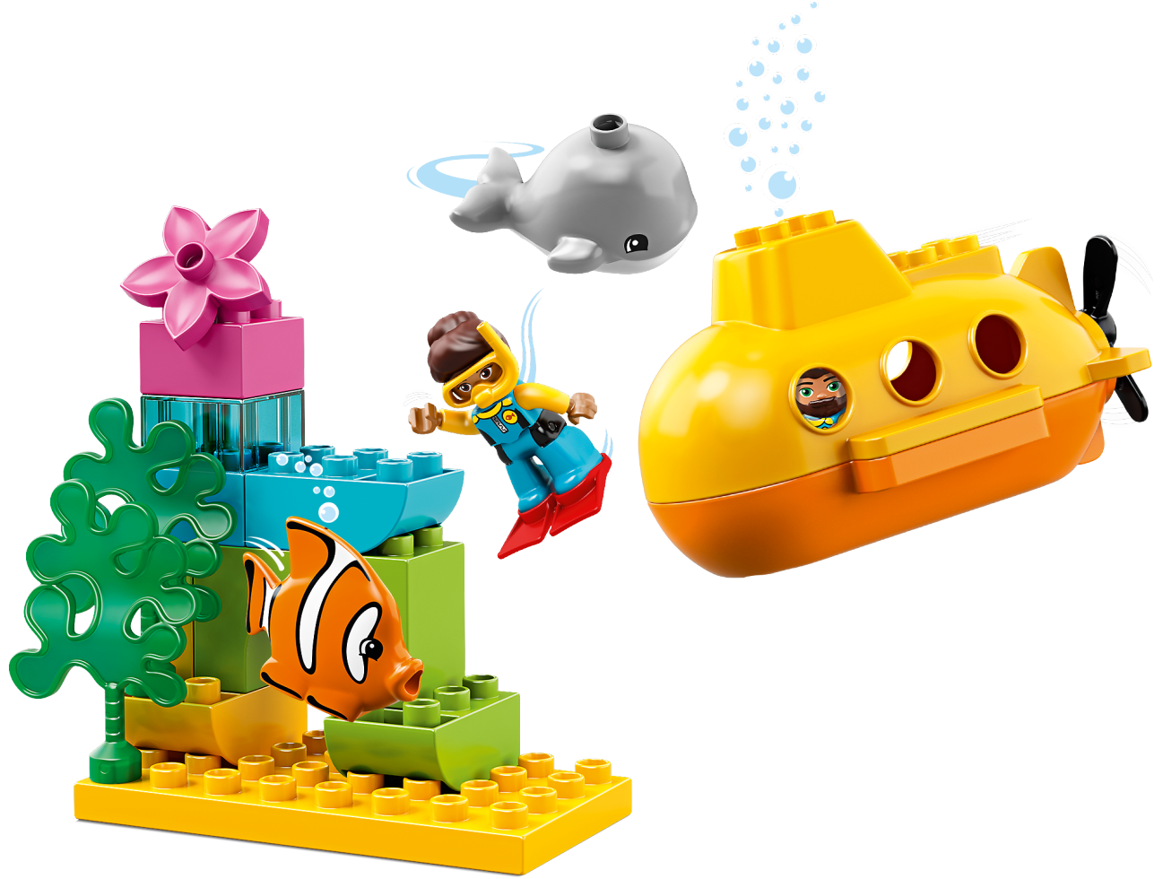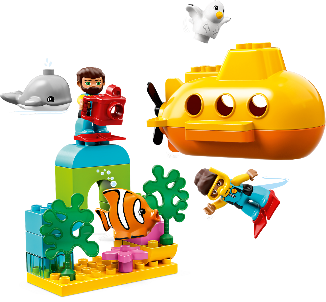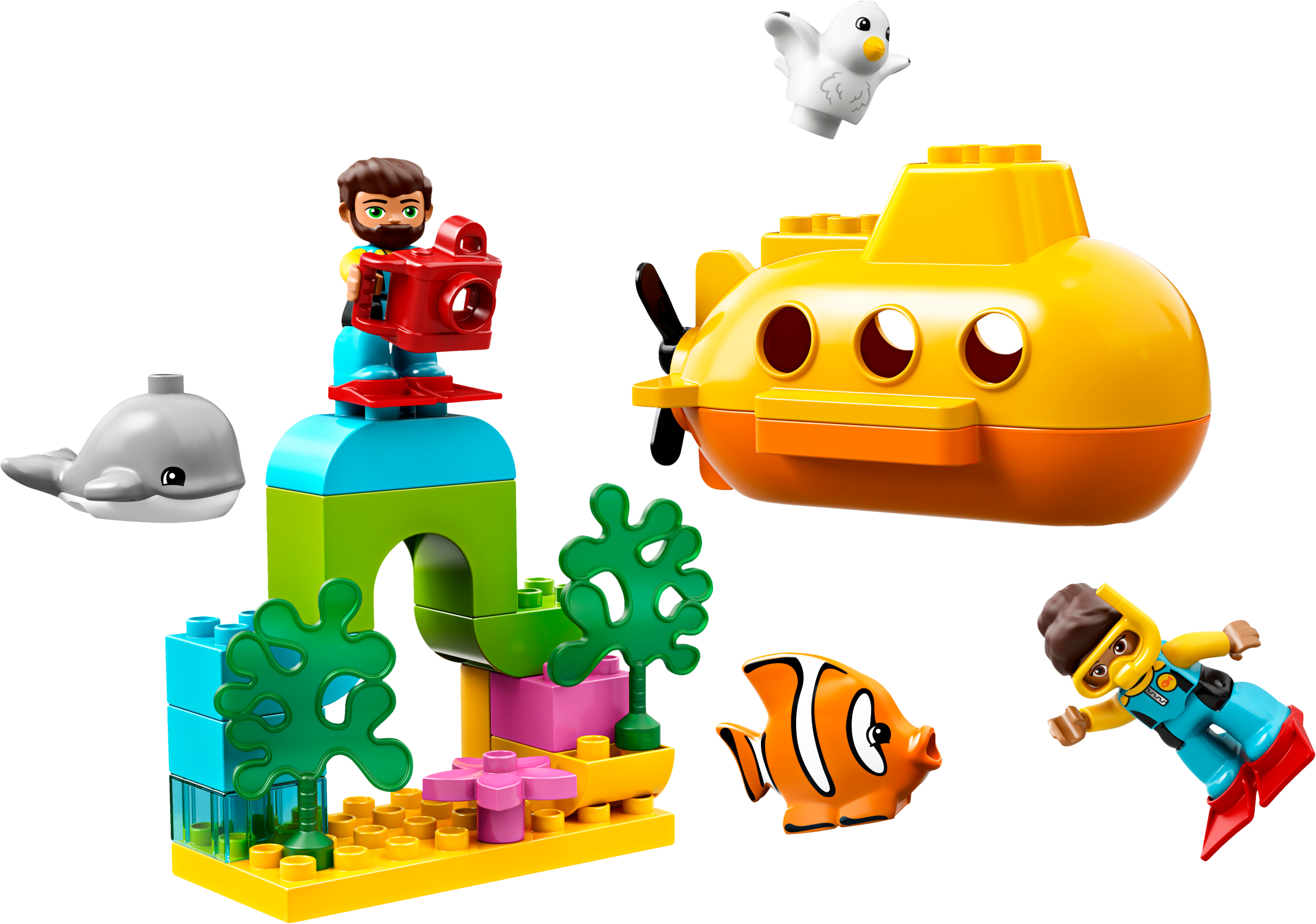Enjoy imaginative play with your toddler and help them develop key skills on a LEGO® DUPLO® Town 10910 Submarine Adventure! This educational bath toy for toddlers provides lots to learn and talk about as young children pretend to film the whale and fish with the toy camera. At bathtime, the toy submarine floats and bubbles on the surface as the whale glides by and the fish blows bubbles below. With 2 diver figures to share the fun… who knows where your next underwater adventure will take you and your little submariner. This educational bath toy for toddlers includes 2 LEGO® DUPLO® diver figures, plus clown fish, whale and seagull figures. LEGO® DUPLO® Submarine Adventure features a brightly colored toy submarine and a fish, both of which produce bubbles when immersed underwater, and a buildable arch with seaweed. Accessory elements include swim fins, snorkel mask and underwater camera for the divers. The set can be used in water and on dry land. Toy submarine measures over 3” (10cm) high, 6” (17cm) long and 3” (10cm) wide. Buildable arch and seaweed feature measures over 5” (13cm) high, 5” (15cm) wide and 3” (8cm) deep.