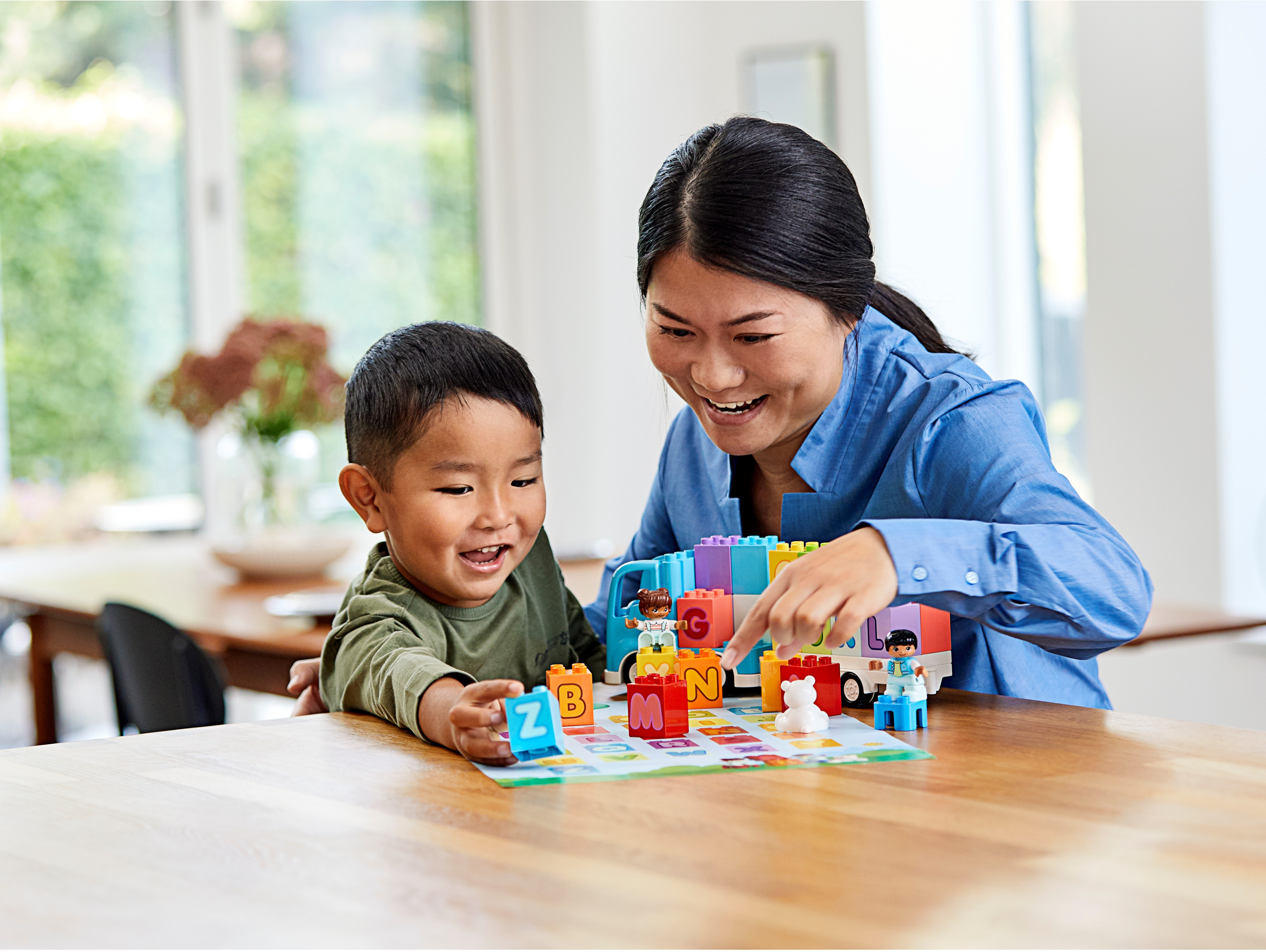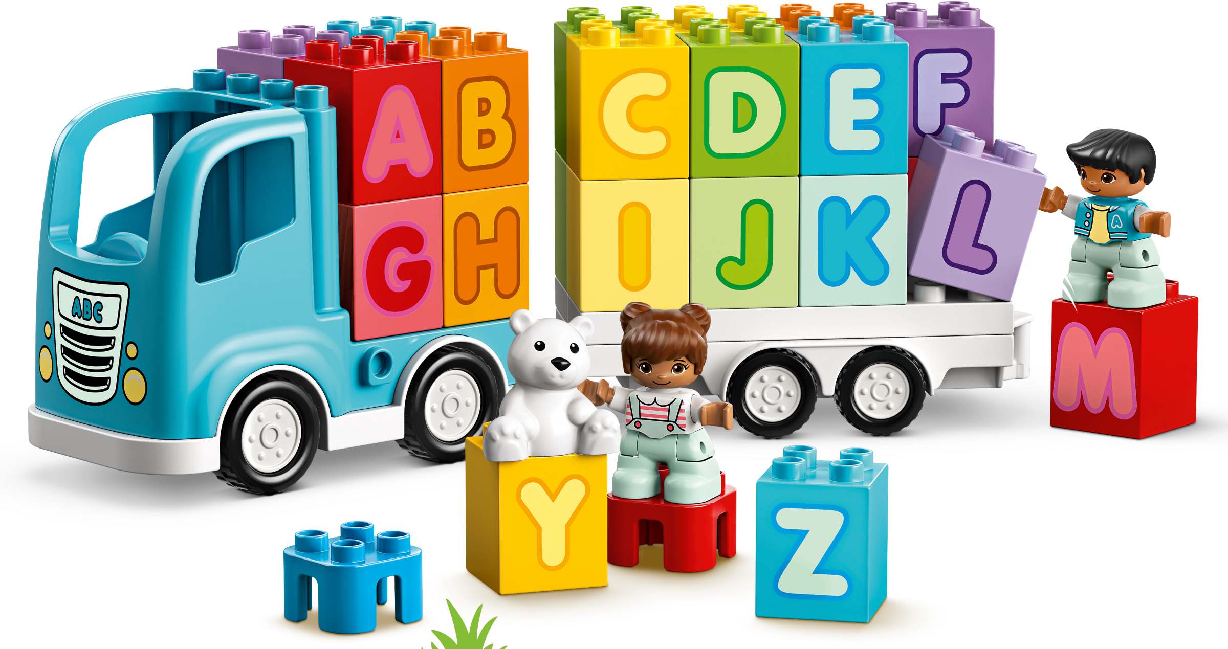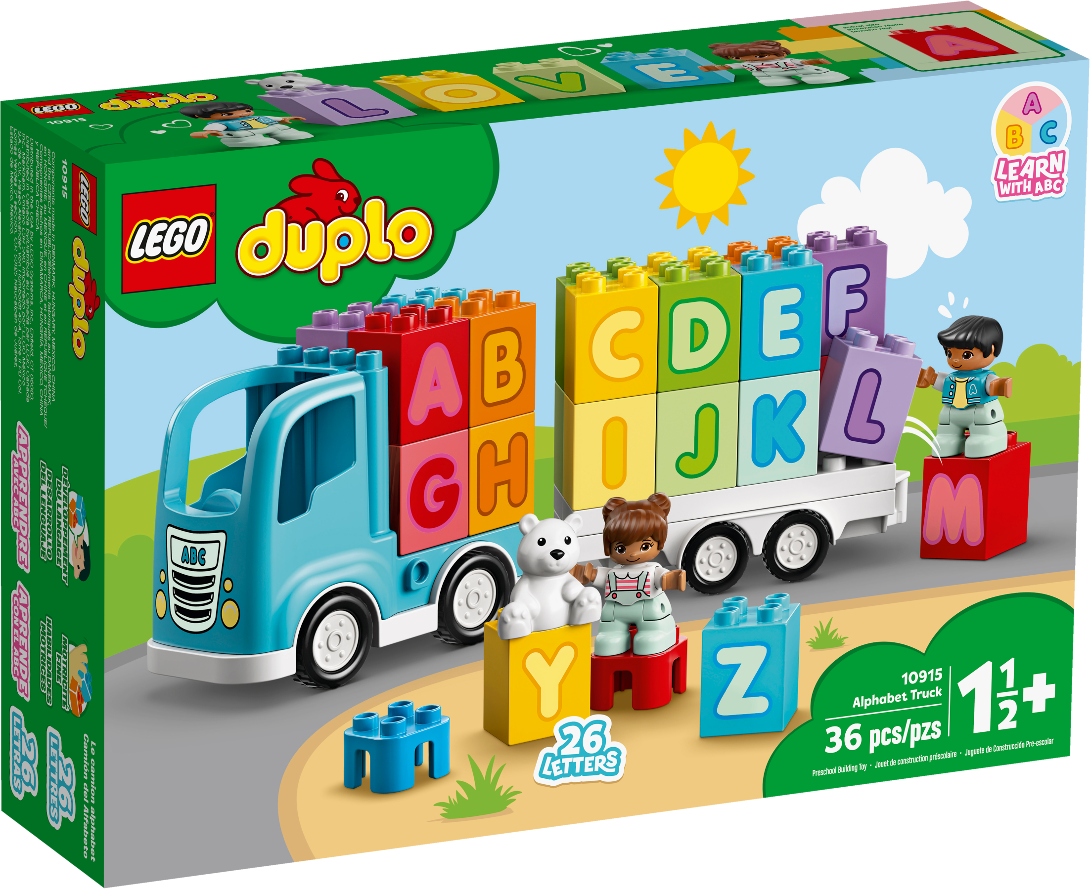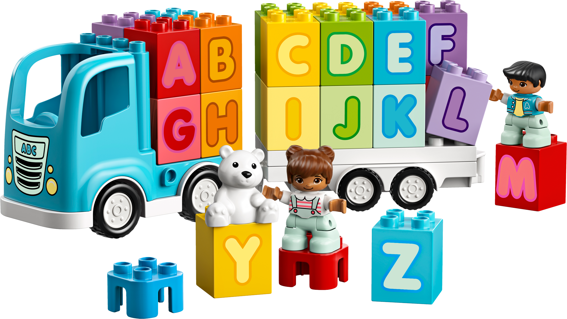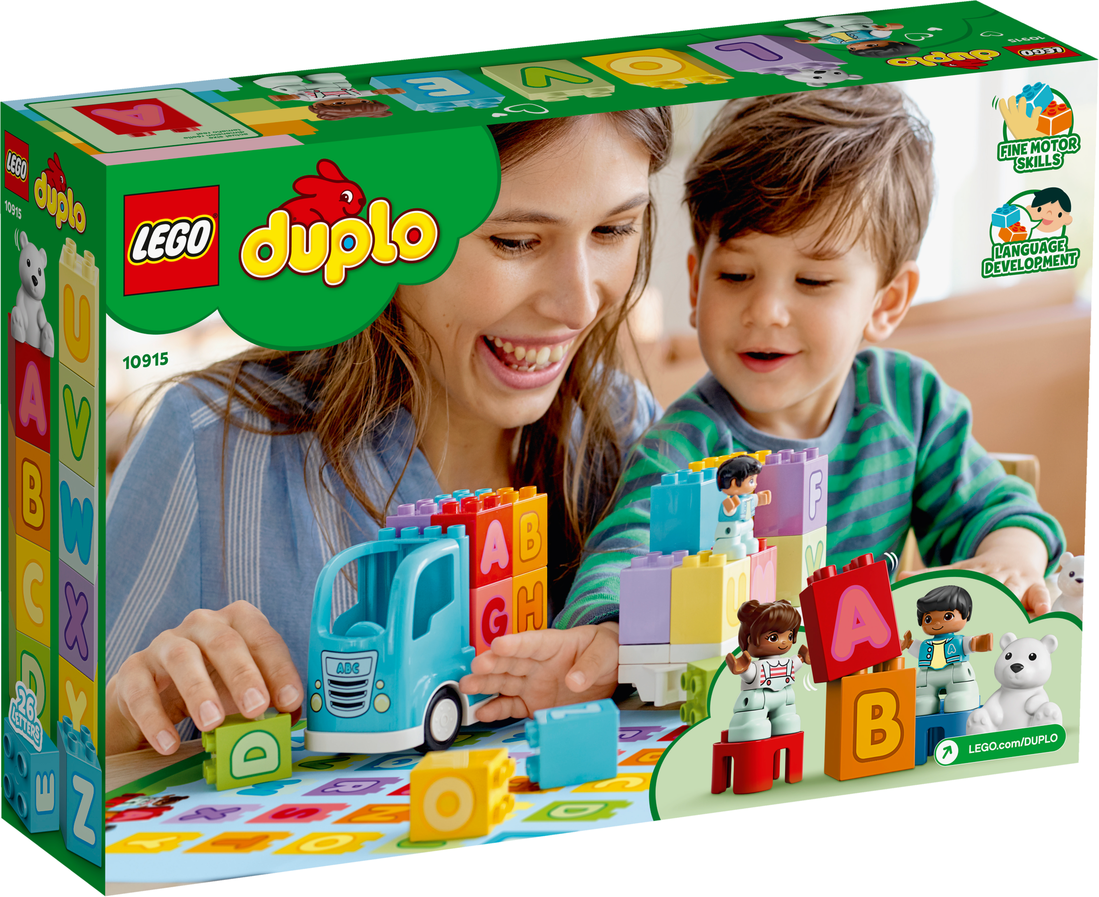 With the LEGO® DUPLO® Alphabet Truck, preschoolers can combine creative building, imaginative play and learning the alphabet. It’s the ultimate playful learning toy for toddlers!Kids’ alphabet learning toyToddlers improve their fine motor skills as they stack the letter bricks onto the back of the truck. When they role-play imaginative adventures with the boy, girl and bear, they develop their visual-spatial awareness. The 26 letter bricks provide lots of opportunities to become familiar with the letters of the alphabet and improve language skills. And as parents and carers join in the fun, they share precious developmental milestones with their little builder.Irresistible educational building toys for toddlersLEGO DUPLO playsets put open-ended play, self-expression and learning into toddlers' hands. They're designed to be the best toys for preschoolers' needs – so little hands can't wait to get hold of the toddler-friendly bricks and start building!Introduce toddlers to their ABC with this alphabet bricks learning toy. This versatile gift for kids inspires creative building, imaginative play and alphabet learning – all in one truck full of imaginative fun!As well as loading and unloading the truck with 26 toddler-friendly bricks – displaying all the letters of the English alphabet – a boy, girl and adorable teddy bear are here to share imaginative role-play adventures.Toddlers improve their fine motor skills as they stack letterbricks onto the truck. As they do that, they become familiar with the letters of the alphabet and soon learn to spell basic words (F-U-N!).With its cute characters and colorful, easy-to-handle bricks, this educational toddlers’ toy makes a great Christmas, birthday or any-other-day gift for boys and girls aged 18 months and up.The truck measures over 4” (12cm) high and 2” (7cm) long, providing an A-to-Z of playful learning on a generous scale. Combine with other LEGO® DUPLO® sets for even more fun.You don’t need batteries to fuel the LEGO® DUPLO® Alphabet Truck – just kids’ imaginations. Hands-on, battery-free toys put creative play into kids’ hands, developing their fine motor skills and spatial awareness.Open the playset’s box and the building, playing and learning begins immediately. Simple instructions for parents and toddlers provide ideas and inspiration for instant enjoyment.Introduce preschoolers to learning with open-ended creative play that inspires youngminds. With familiar scenes, fun characters and easy-to-handle pieces, LEGO® DUPLO® playsets are ideal developmental toys for toddlers.LEGO® DUPLO® playsets meet the highest industry standards, which ensures they are easy for little fingers to pick up, place and pull apart – it's been that way since 1969.At the LEGO Group, we drop, squash, twist, heat, bite, bend, scratch and stretch LEGO® DUPLO® bricks and pieces to make sure every building set meets the highest global safety and quality standards.