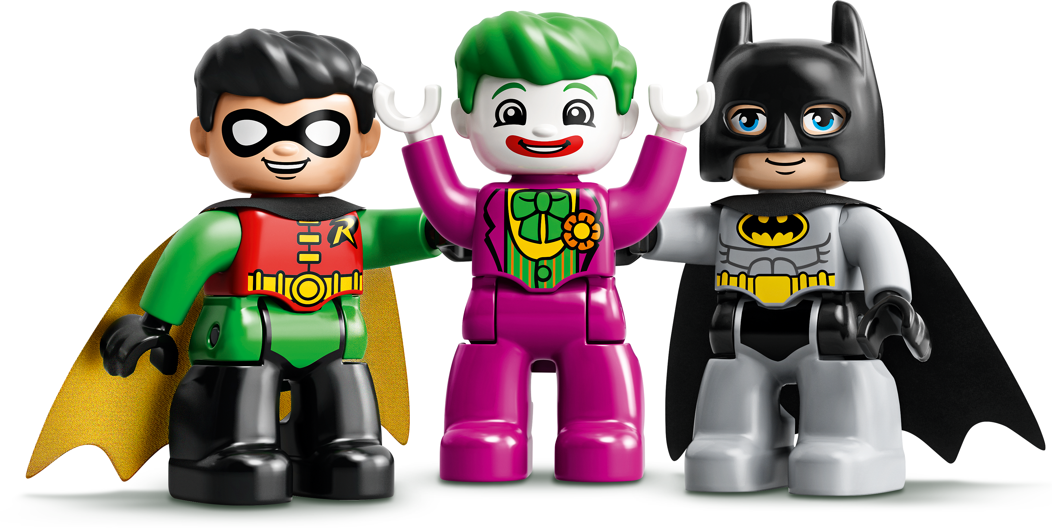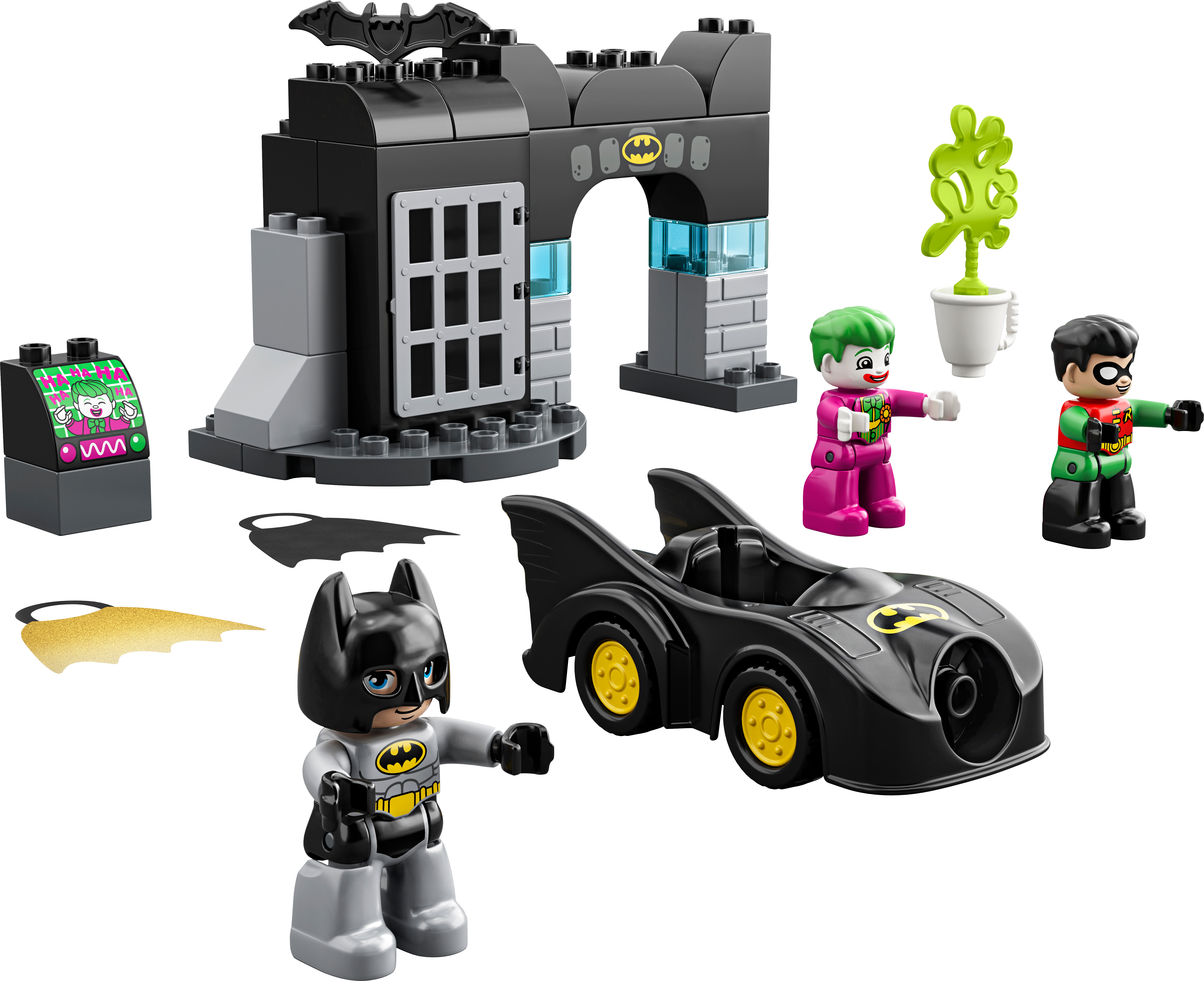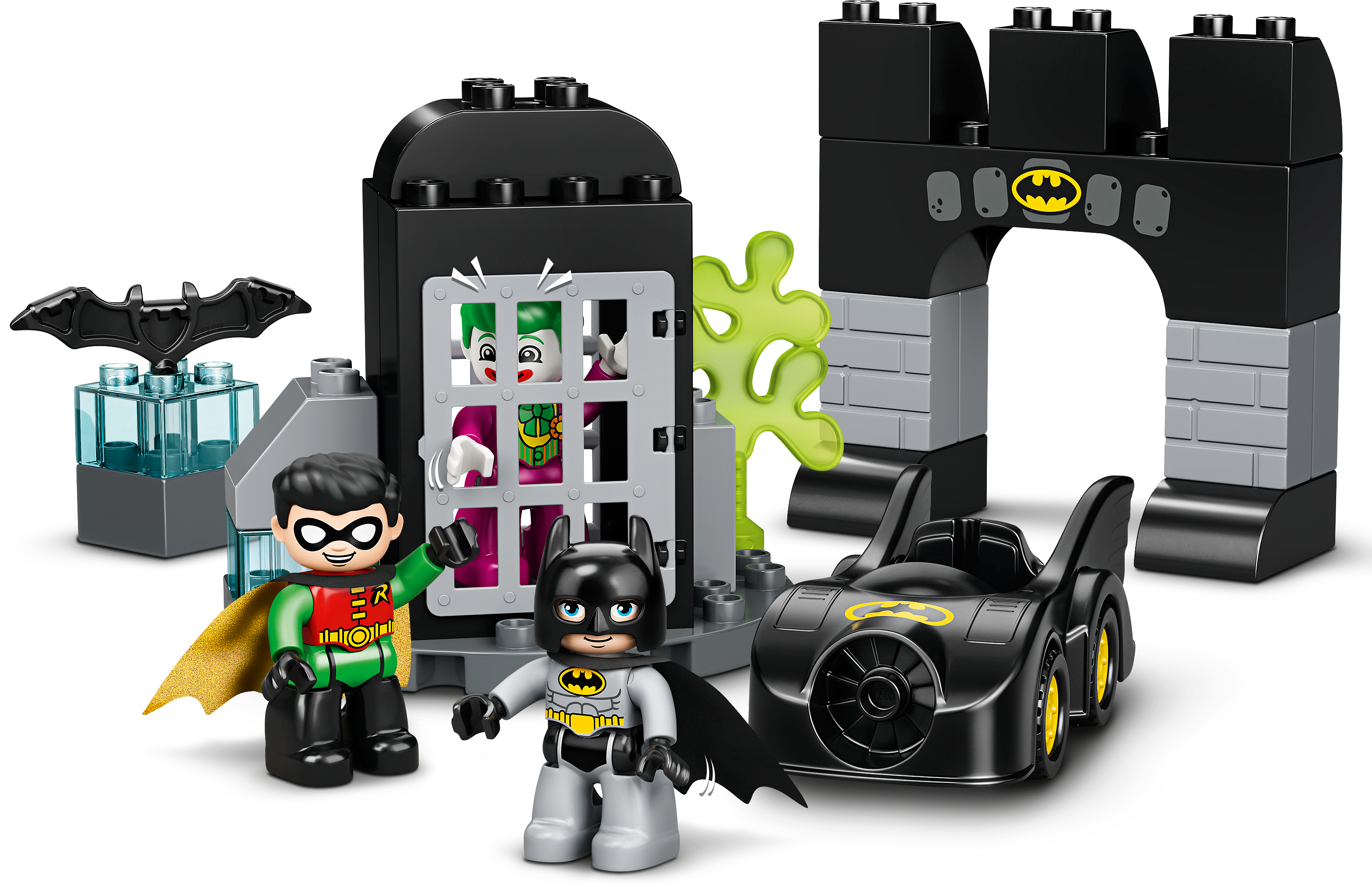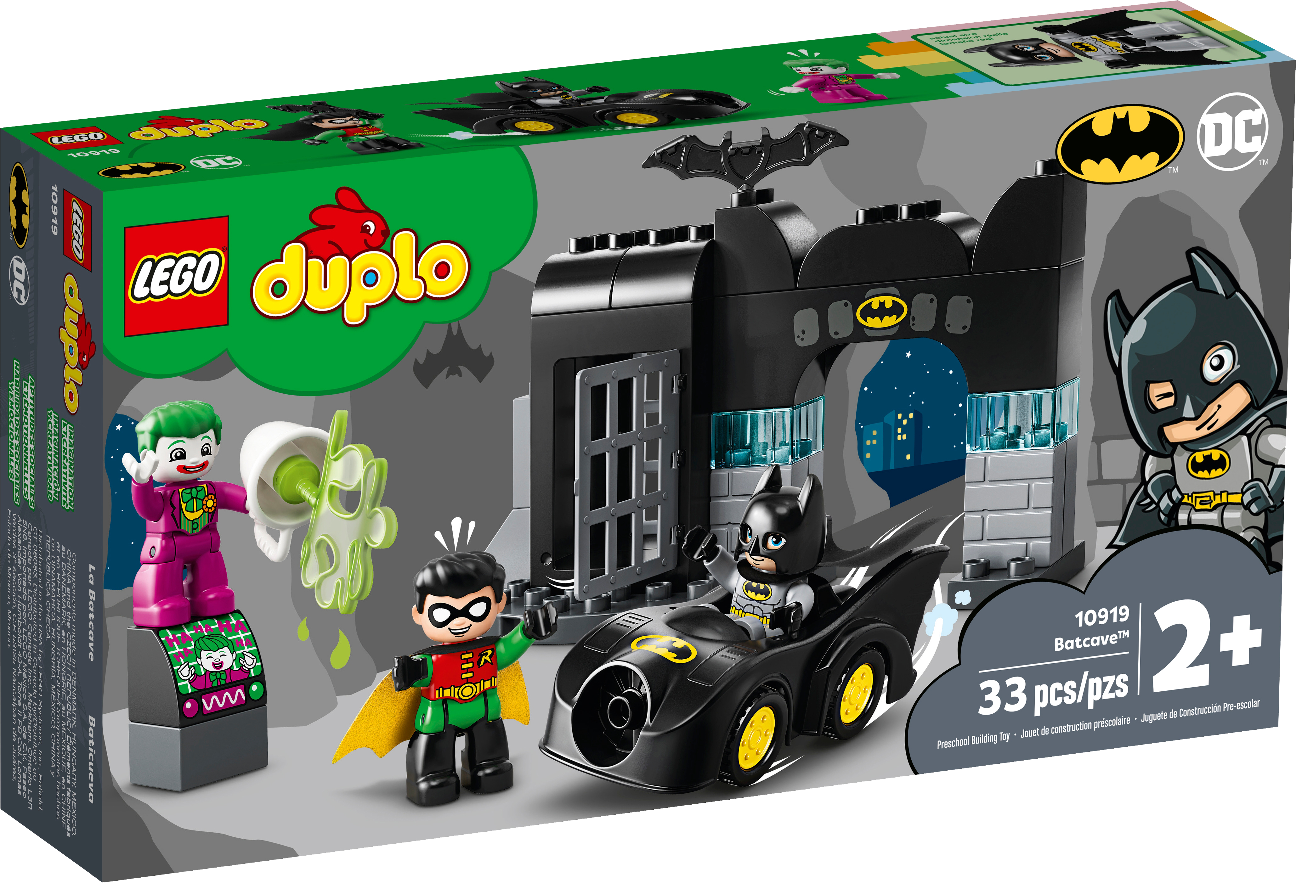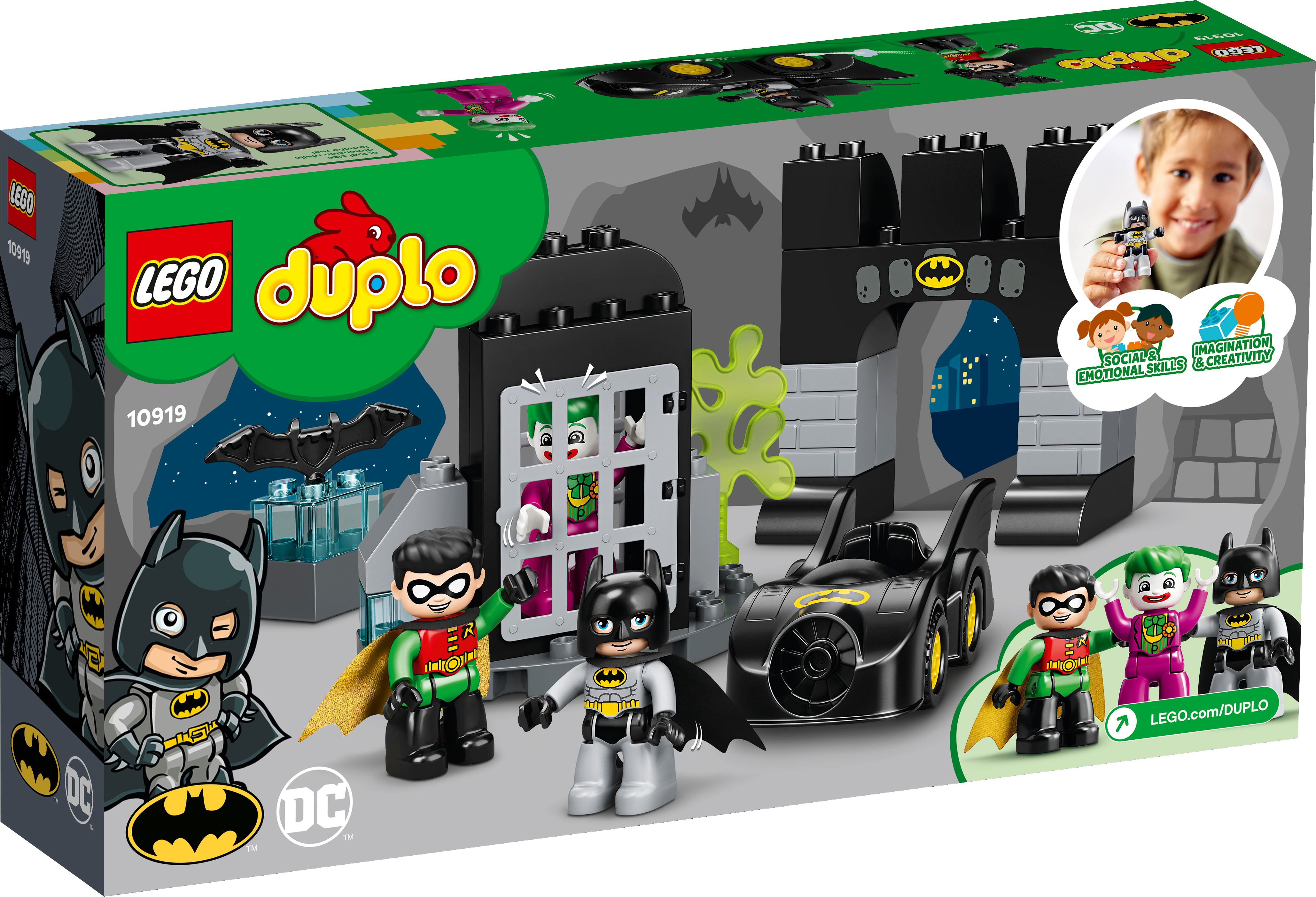 When THE JOKER™ escapes from jail, your little super hero joins Batman™ and Robin™ as they try to capture him and put him back where he belongs. This means lots of fun-packed action, imaginative role play and a chance for toddlers to develop super-power skills!Developmental play with Batman and RobinLEGO® DUPLO® Batman Batcave™ (10919) features Batman, Robin and THE JOKER in a versatile playset designed to encourage creative play and stimulate developmental benefits. Infants build fine motor skills as they maneuver the Batmobile™ toy through the gate and open and close the jail door. Role-playing the interaction between the 3 characters encourages social and emotional development.Iconic characters and endless, pretend-play actionFeaturing favorite super heroes and Super-Villains, cool gadgets and amazing vehicles, LEGO DUPLO Batman starter sets provide toddlers with endless developmental play and give parents an opportunity to share precious moments with their little superhero.LEGO® DUPLO® Batman™ Batcave™ (10919) combines developmental learning with action-packed adventures in a super-fun playset designed to unleash your little super hero’s super powers!The Batcave™ provides the setting for role-play adventures with THE JOKER™, Batman™ and Robin™. There's also a jail with an opening and closing gate, and a cool-looking Batmobile™ toy to inspire stories on the move.Preschoolers use their fine motor skills and problem-solving abilities to catch THE JOKER™ and return him to jail. But, with THE JOKER’s slime shooter and Batman’s high-speed Batmobile™, anything can happen!This exciting infant toy uses elements designed to be easy for small hands to pick up and place. It’s an ideal LEGO® starter set for boys and girls aged 2 and up who enjoy mechanical toys.The Batcave™ measures over 5” (14cm) high, 8” (22cm) wide and 3” (9cm) deep and the Batmobile™ toy is over 4” (12cm) long. To create even more play possibilities, the set combines easily with other LEGO® DUPLO® playsets.No batteries needed. The hands-on fun starts right away, unlocking developmental benefits with play designed to stimulate young minds.The simple instructions included make it easy for parents and caregivers to share the construction fun with their toddler.LEGO® DUPLO® Batman™ playsets use super heroes, Super-Villains, cool gadgets and amazing vehicles from the Batman movies to deliver developmental benefits to preschoolers and precious moments for parents to share.LEGO® DUPLO® building sets are easy for little fingers to pick up, place and pull apart because they meet the very highest industry standards – and it’s been that way since 1969.LEGO® DUPLO® bricks and pieces are stringently tested to make sure every little builder's DUPLO playset meets the highest safety and quality standards on the planet.