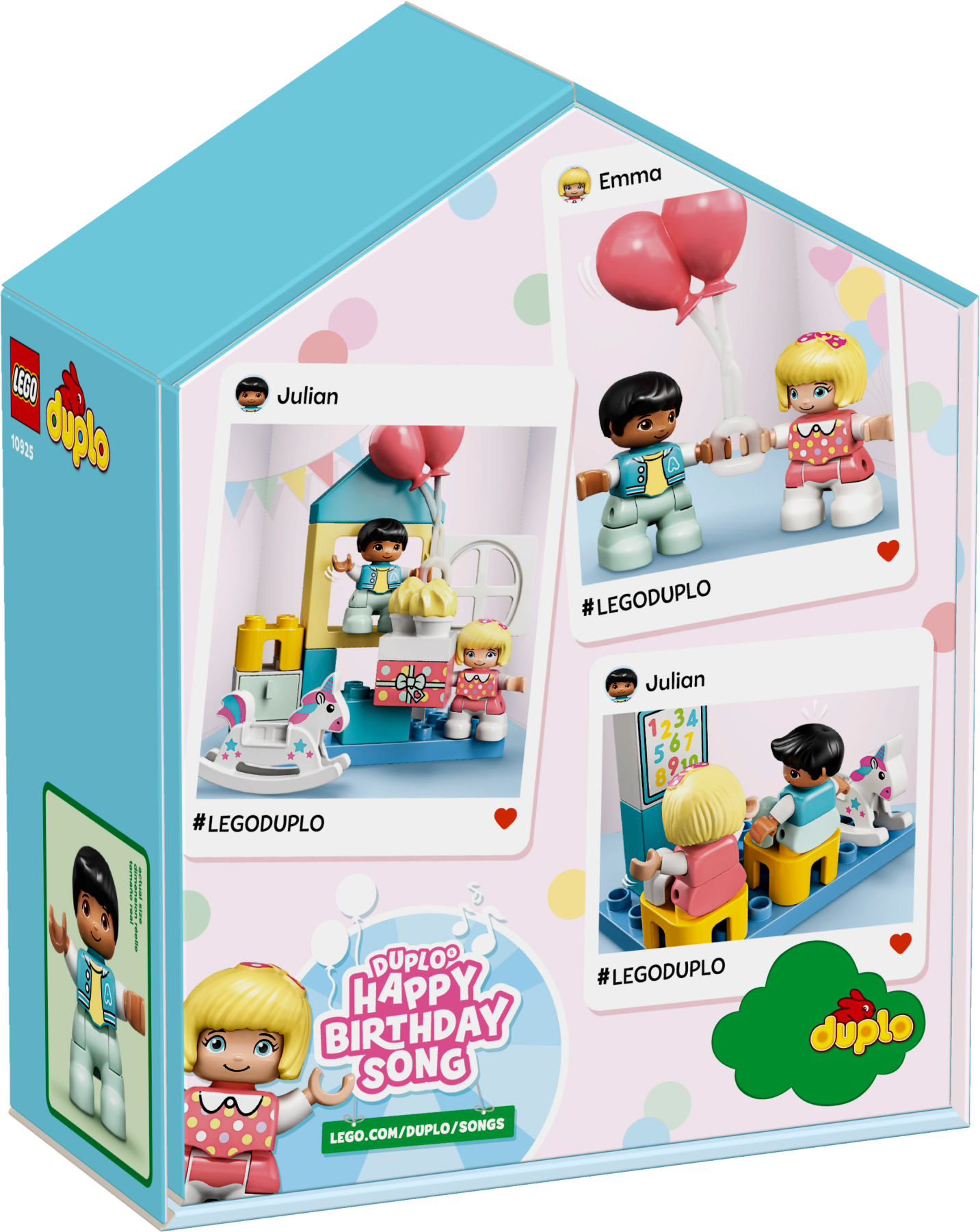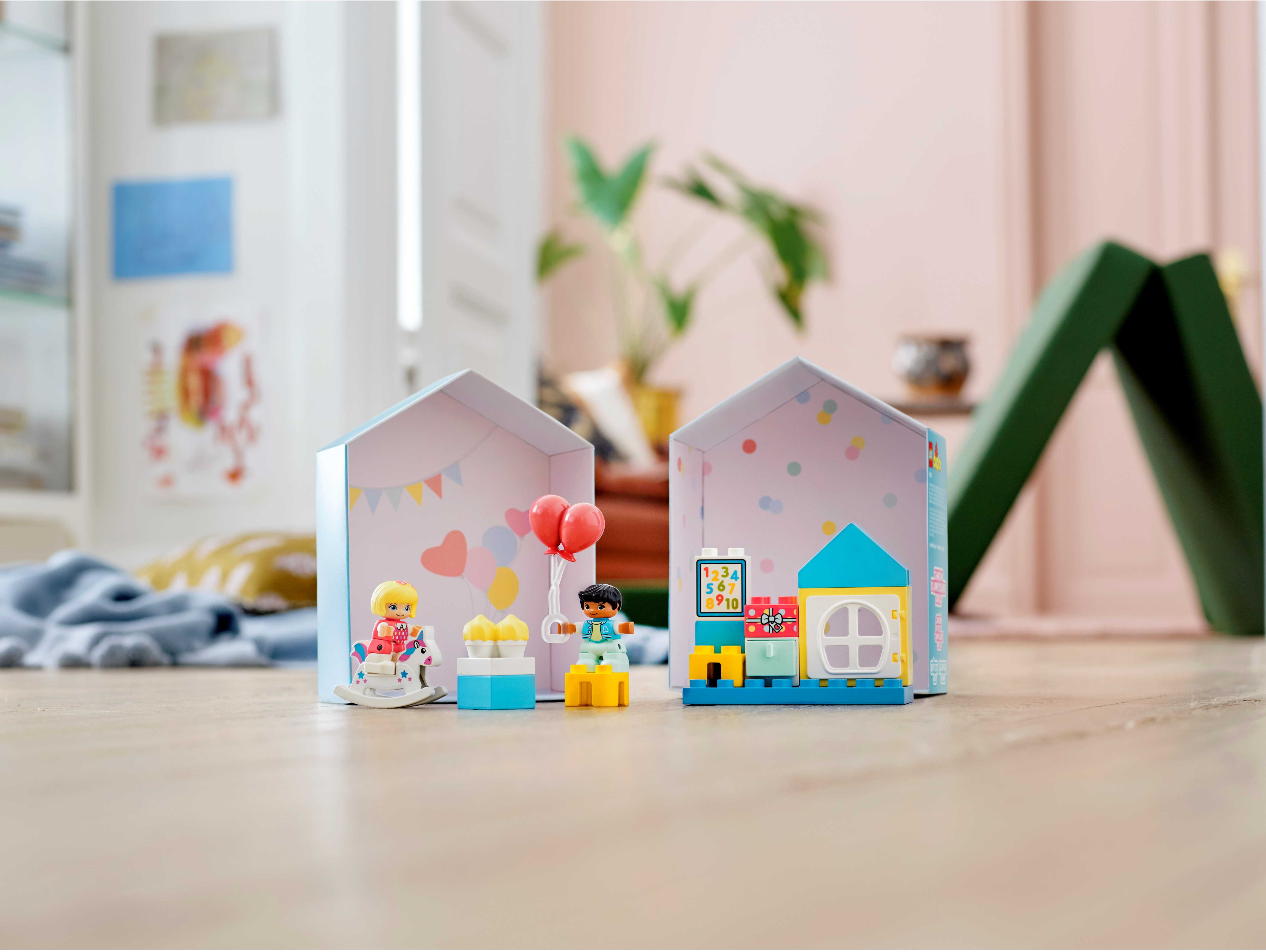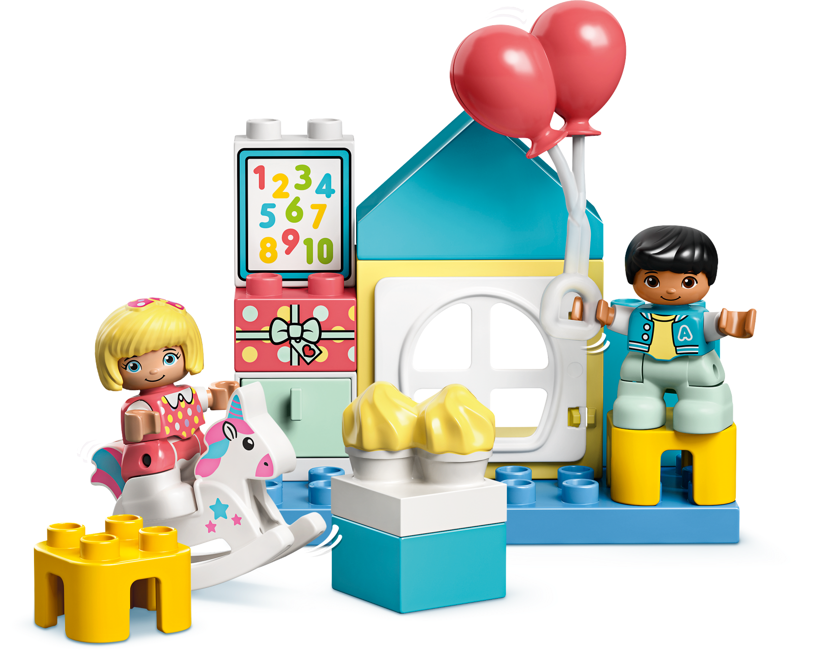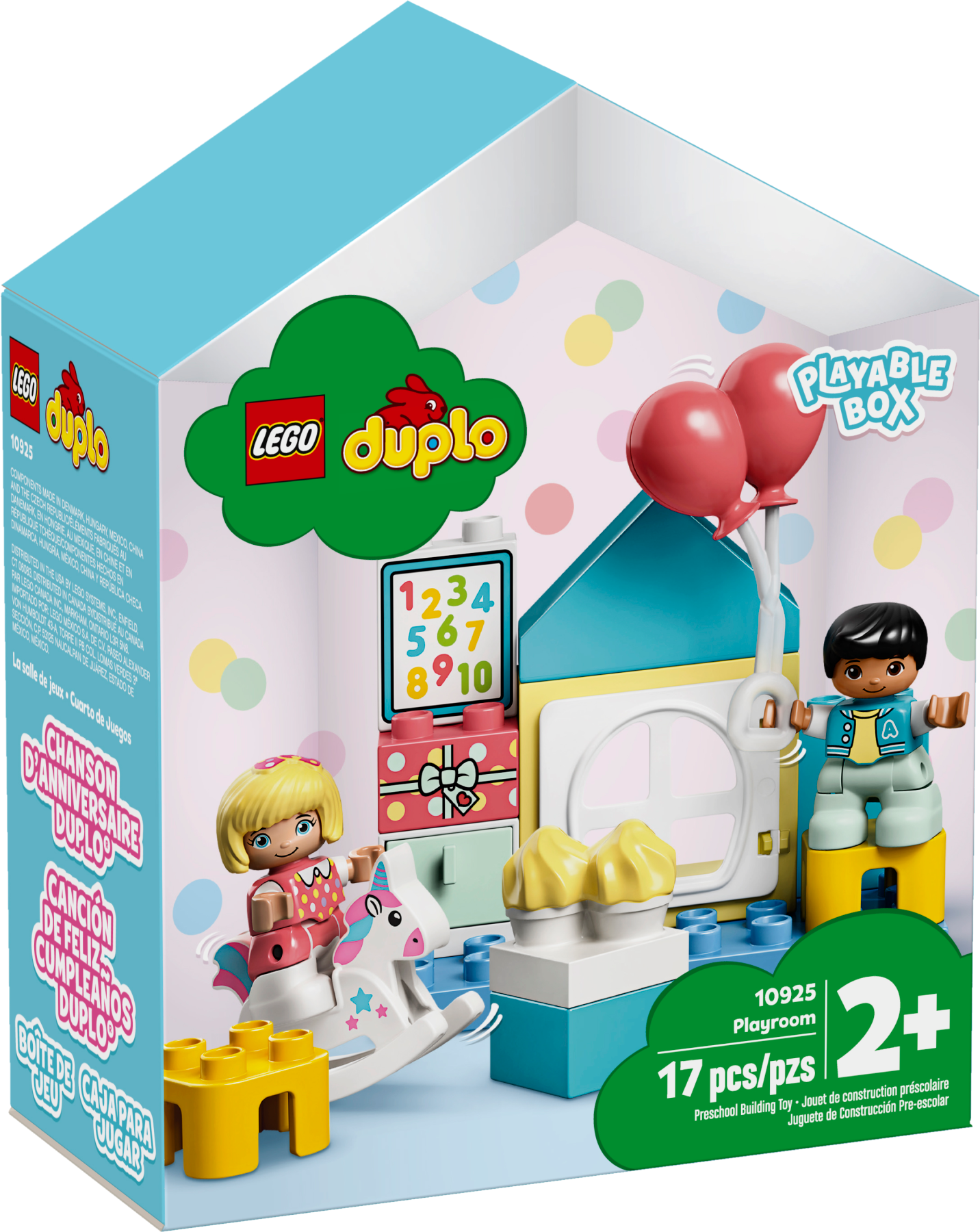 The LEGO® DUPLO® Playroom is packed with imaginative role-play possibilities. Even the house-shaped box is part of the play experience. With modern colors, cool features and detailed characters, young minds and little hands will be engaged and entertained for hours!Toddlers' educational developmental toyChildren improve their fine motor skills and role-play imaginative stories as they join a boy and girl in the playroom. The toy's pretend school area provides plenty of opportunity for basic preschool learning. There’s even a birthday to celebrate – with toys, ice-cream, present and balloons. As parents and carers join in the building and playtime fun, they share their little ones’ precious developmental milestones.Pretend play gifts for kidsLEGO DUPLO imaginative kids' playsets put open-ended play, self-expression and learning into little hands. These educational toys for toddlers and preschoolers encourage learning through pretend play, relatable characters and creative building.The box containing this playset transforms into a versatile playroom, filled with colorful toys and detailed characters to educate and entertain toddlers with endless role-play fun.The house-shaped box is great for play and storage. It contains all the bricks and pieces kids need to role-play a birthday party and lots more besides. Includes contemporary figures and numerous toys and accessories.Toddlers can role-play imaginative stories in the LEGO® DUPLO® Playroom, including learningin the toy school and celebrating at the birthday party. For extra fun, combine this set with LEGO® DUPLO® Town Bedroom (10926).With its cute characters and colorful, easy-to-handle bricks, this educational toy for toddlers makes a great gift for kids aged 2 years and up and makes any day a birthday party day!The playroom with furniture measures over 3” (10cm) high, 4” (12cm) wide and 2” (6cm) deep. The house-shaped box can be used to store all the bricks and pieces, and lets adults take the imaginative play wherever kids go.Powered by kids’ imaginations! Hands-on, battery-free toys boost kids’ creative, imaginative and practical skills, and it gives them the satisfaction of making fun things happen ‘by myself’.Open the set’s house-shaped box and the imaginative play begins immediately. For further learning fun, check out the DUPLO Birthday song and other DUPLO songs at LEGO.com/DUPLO/Songs.Introduce preschoolers to familiar scenarios, cute characters and free-thinking fun with LEGO® DUPLO® Town. These ingenious DUPLO starter sets encourage open-ended pretend play that improves young minds.LEGO® DUPLO® playsets meet the highest industry standards, which ensures they are easy for little fingers to pick up, place and pull apart – it's been that way since 1969.At The LEGO Group, we drop, squash, twist, heat, bite, bend, scratch and stretch LEGO® DUPLO® bricks and pieces to make sure every building set meets the highest global safety and quality standards.
