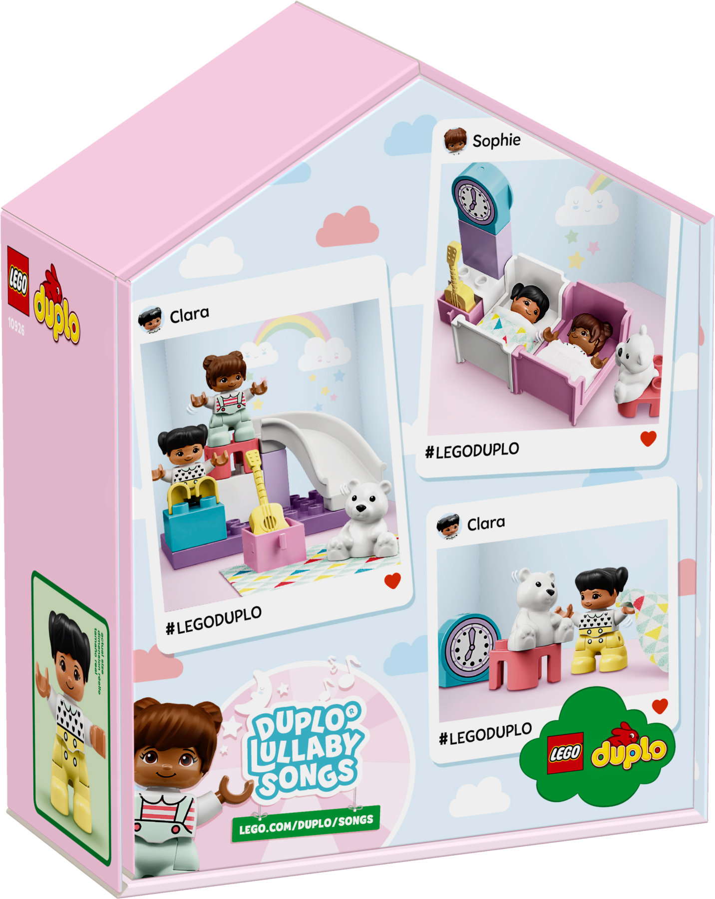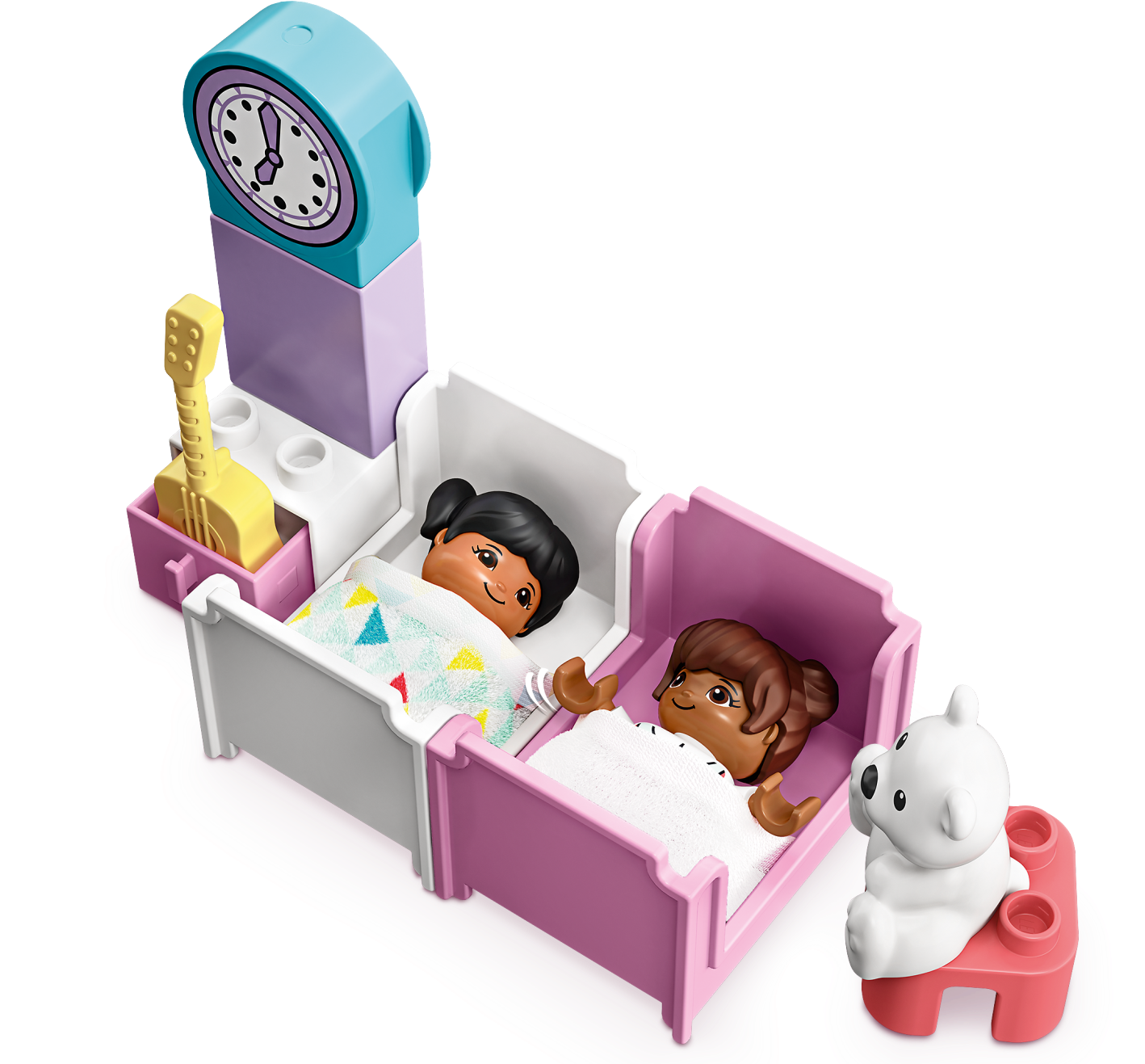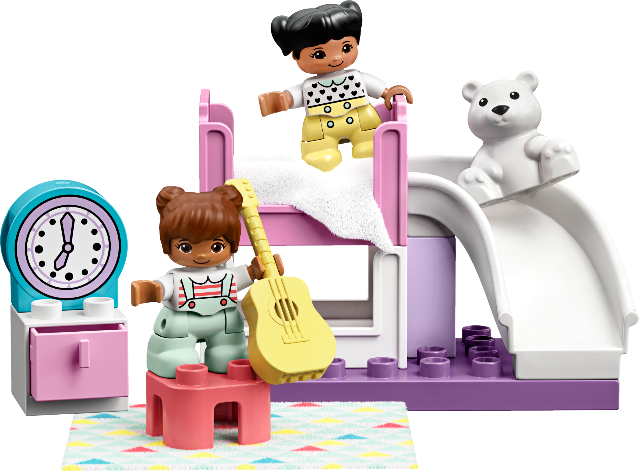 There’s endless imaginative role-play for kids to enjoy with this LEGO® DUPLO® Bedroom toy. Even the house-shaped box is part of the play experience.Bedroom playset developmental toyYoung minds will be engaged and entertained with this versatile bedroom-in-a-box playset. With contemporary colors and 2 detailed girl figures, toddlers develop their fine motor skills role-playing endless fun activities. There's a teddy bear to cuddle, a guitar to sing along to and the top bunk even has its own slide! When the clock shows it’s time for sleep, put the girls to bed, then – time to wake up! – the fun continues in the morning. As parents and carers join in the building and playtime fun, they share their little ones’ precious developmental milestones.Pretend play learning toys – great gifts for kids!LEGO DUPLO educational toys for toddler put open-ended play into preschoolers hands. With relatable characters and creative building fun, DUPLO toys make ideal kids' first LEGO sets.The house-shaped box containing this playset transforms into a fun-packed bedroom, filled with colorful toys and cool pretend-play figures for toddlers to share endless imaginative fun with.This educational building toy for toddlers includes 2 contemporary-looking girl figures plus a toy guitar, alarm clock and a cuddly teddy bear – even the house-shaped box is great for play and storage.Toddlers build fine motor skills and role-play imaginative stories as they join 2 young girl figures for pretend sleepover play in the LEGO® DUPLO® Bedroom. Will the fun activities stop when it’s time for bed?Toddlers build fine motor skills and role-play imaginative stories as they join 2 girl figures for pretend play in the LEGO® DUPLO® Bedroom. For extra fun, combine this set with LEGO DUPLO Town Playroom (10925).If you want a learning toy for young kids, this playset has cute characters, colorful, easy-to-handle bricks and endless play possibilities – making it a great educational building toy for toddlers aged 2 years and over.The bunk-beds with slide measure over 4” (11cm) high, 5” (13cm) wide and 2” (6cm) deep. The house-shaped box can be used to store all the bricks and pieces, and lets adults take the imaginative play wherever kids go.This playset is battery-free. Hands-on toys boost kids' creative, imaginative and practical skills. It gives them the satisfaction of making fun things happen ‘by myself' – and it means the fun never ends.The play begins immediately. Just open the house-shaped box and go! For further learning fun, check out LEGO® DUPLO® Lullabies and other DUPLO songs at LEGO.com/DUPLO/Songs.LEGO® DUPLO® Town toys put educational, imaginative, open-ended play in the hands of preschoolers and toddlers. These ingenious DUPLO starter sets combine key developmental benefits with fun toys that kids love.Meeting the highest industry standards, LEGO® DUPLO® sets are easy for little fingers to pick up, place and pull apart – and it's been that way since 1969.At The LEGO Gorup, we drop, squash, twist, heat, bite, bend, scratch and stretch LEGO® DUPLO® bricks and pieces to make sure every one of our kids’ construction toys meets the highest global safety and quality standards.