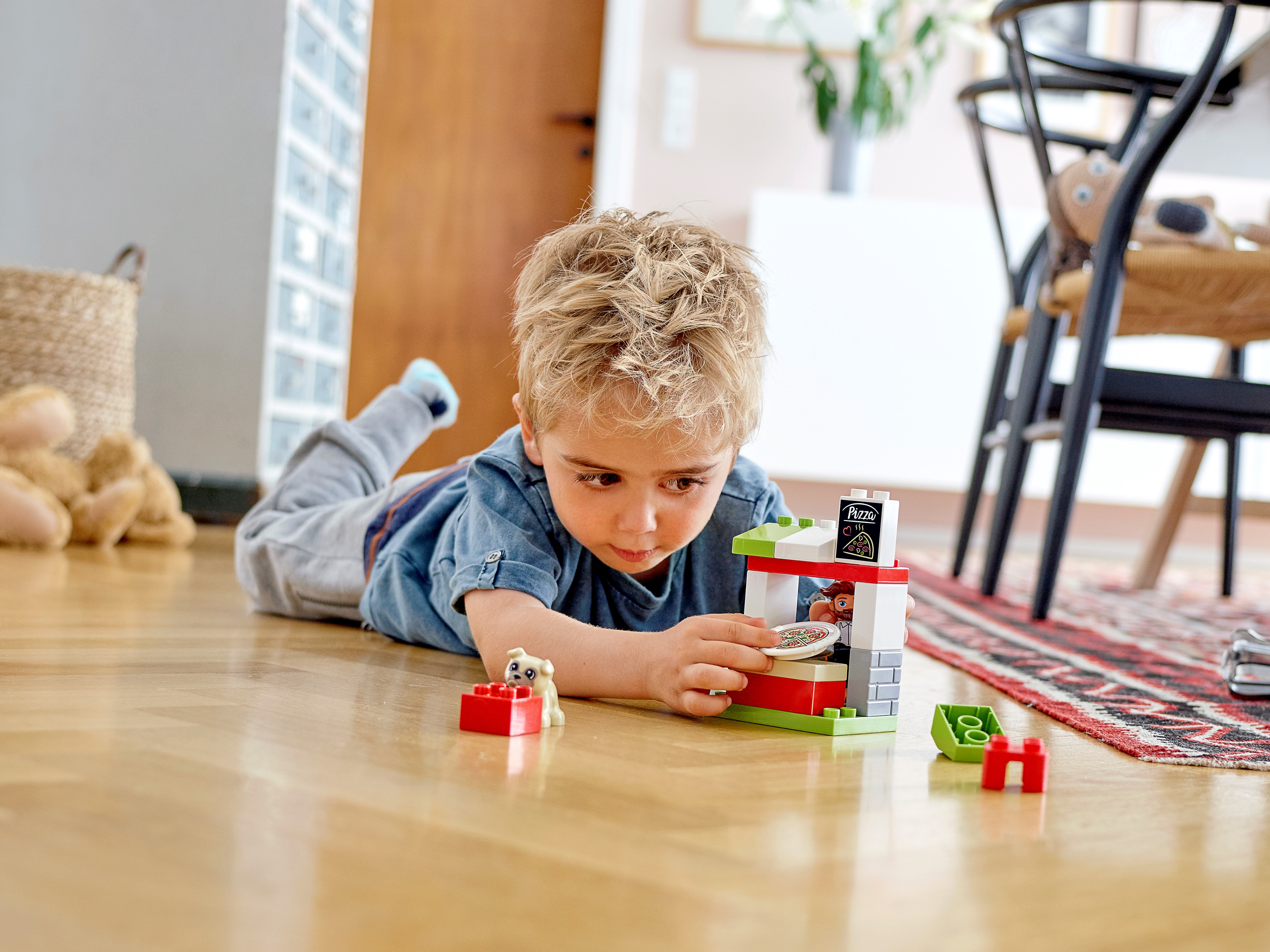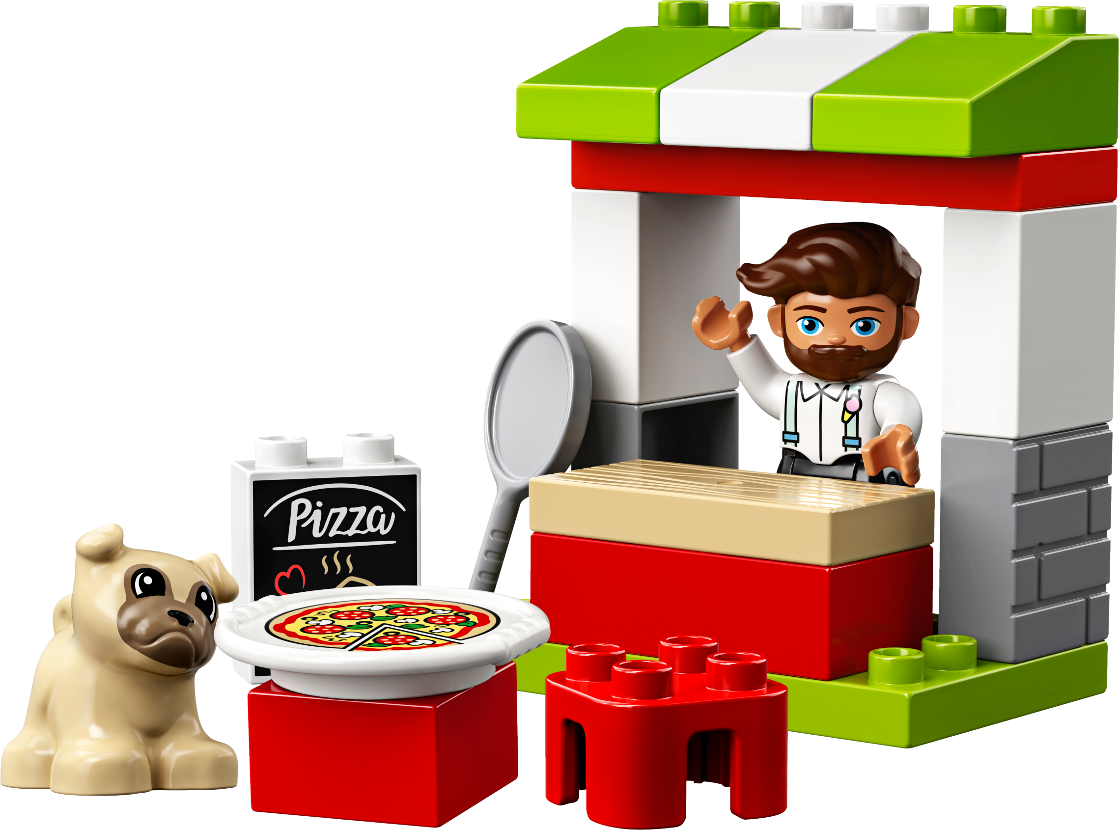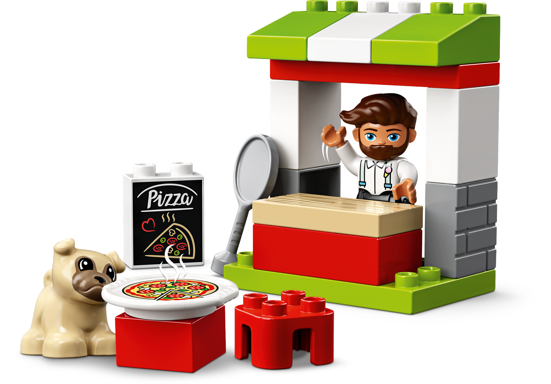 Enjoy pretend play with pizza! The LEGO® DUPLO® Pizza Stand is an ideal first building playset, providing toddlers with lots to learn and enjoy.Feed young minds with a toy pizza set!Every kid can recognize a pizza – and this contemporary pizza stand toy serves up a delicious mix of fun play and developmental benefits for toddlers and parents to share! Your little pizza maker can help the cook hold up the pizza to attract customers; serve pizza to the table; sit the cook on the chair to eat his favorite snack (pizza!) while the cute dog looks on enviously. With cool colors and a great level of detail, including a wood-style countertop, the versatile LEGO DUPLO Pizza Stand can be rearranged and redesigned for endless role-play fun.Pretend play learning toys – great gifts for toddlers!With relatable characters and familiar scenarios, LEGO DUPLO educational toys for toddlers put open-ended play and self-expression into preschoolers hands – encouraging fine motor skills and social & emotional development.The versatile LEGO® DUPLO® Pizza Stand provides toddlers, parents and carers with lots of role-play fun to share together. This toy’s an ideal LEGO starter set, packed with playful learning for kids to enjoy.As the pizza guy cooks a yummy pizza at his toy food stand, a cute dog looks on hopefully. The pizza stand is colorful and contemporary, with a wood-style countertop, and includes a menu, table, chair – and pizza!Toddlers develop fine motor and social & emotional skills as they build, play, redesign and play again with this busy food playset. Cook and serve delicious pizza. Does the doggy deserve a slice?Boys and girls will love playing out imaginative stories with this fun pizza stand. They’re serving pretend play all day at this fun-filled mini-restaurant! Great gift for toddlers aged 2 and over.The pizza stand measures over 4” (11cm) high, 3” (9cm) wide and 2” (7cm) deep. This adaptable playset integrates seamlessly with other LEGO® DUPLO® sets to expand kids'pretend play and learning possibilities.This educational toy for toddlers and preschoolers is battery-free – so the foody fun never ends! LEGO® DUPLO® hands-on toys kickstart young kids’ creative, imaginative and practical thinking.Simple, clear instructions ensure kids can create and enjoy this easy-to-assemble LEGO® DUPLO® toy pizzeria immediately. Then, the more they play, the more their imagination will conjure up exciting new possibilities.With easy-to-handle bricks and friendly, familiar characters, LEGO® DUPLO® Town toys develop kids’ creative-thinking and fine motor skills while delivering endless imaginative play.LEGO® DUPLO® toys meet the highest industry standards, so they are consistent, compatible and connect and pull apart perfectly every time – and it's been that way since 1969.LEGO® DUPLO® bricks and pieces are tested to the extremes to ensure they meet the highest global safety and quality standards, and you can be sure the toy is absolutely safe for your child.
