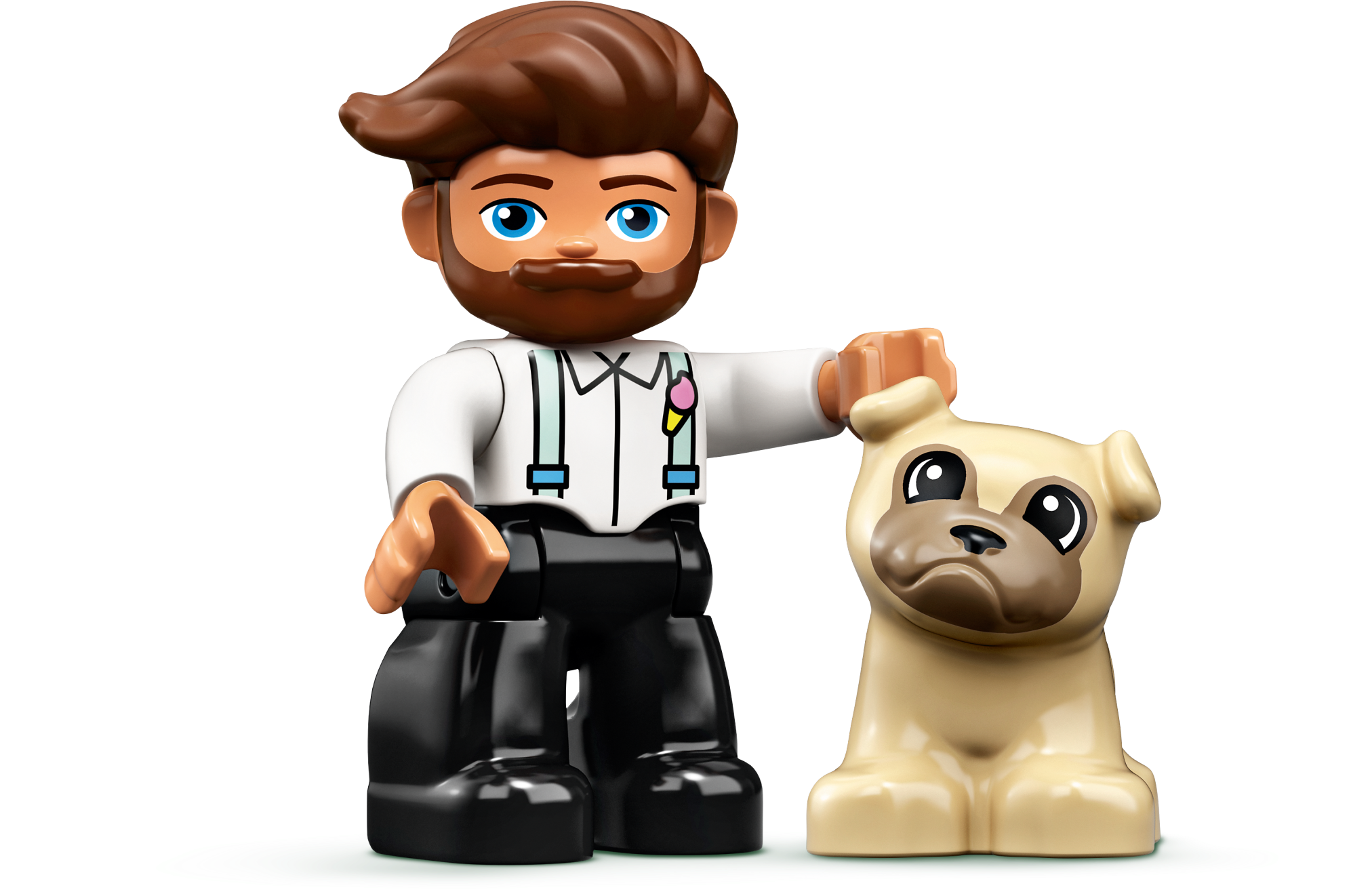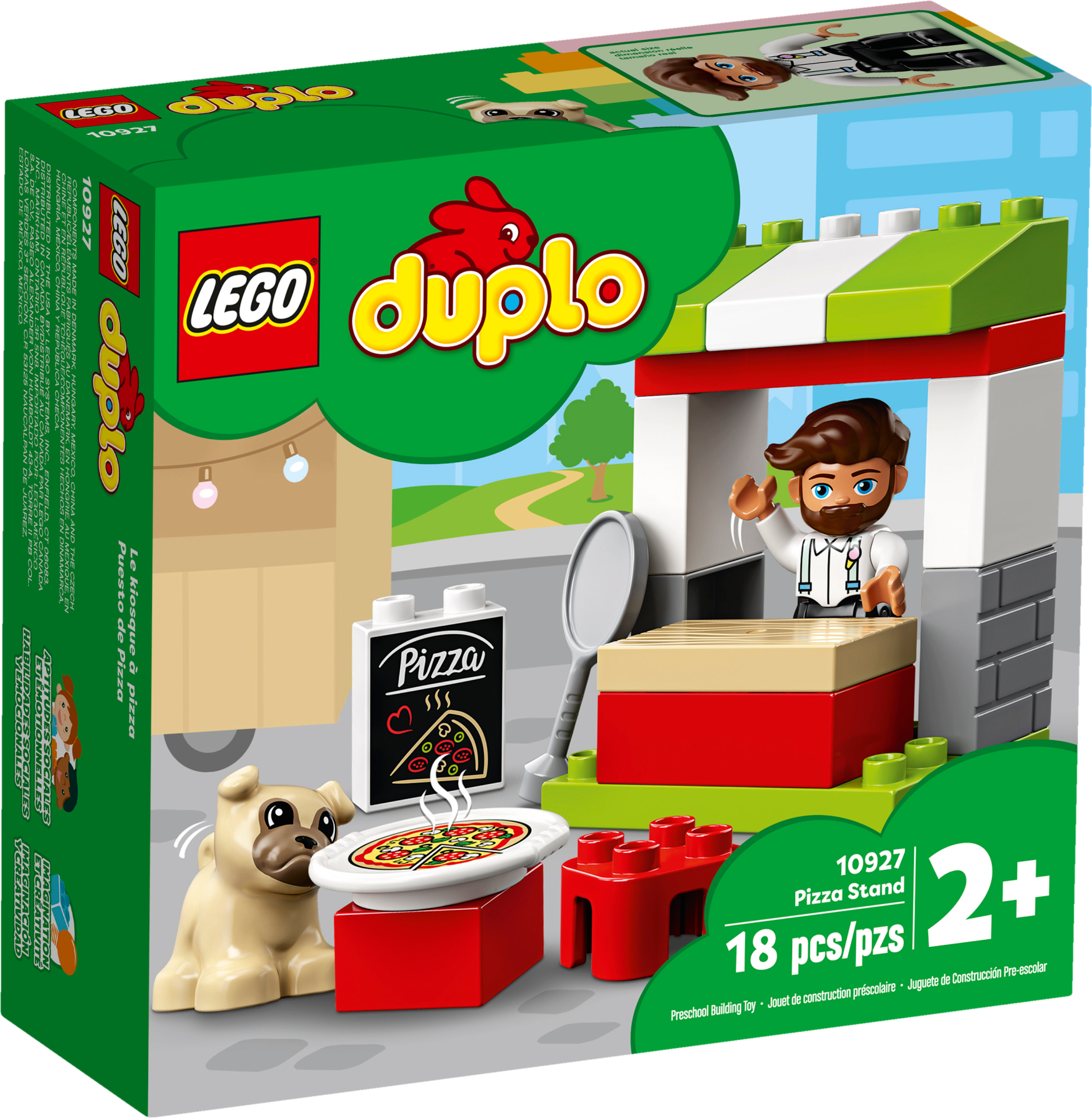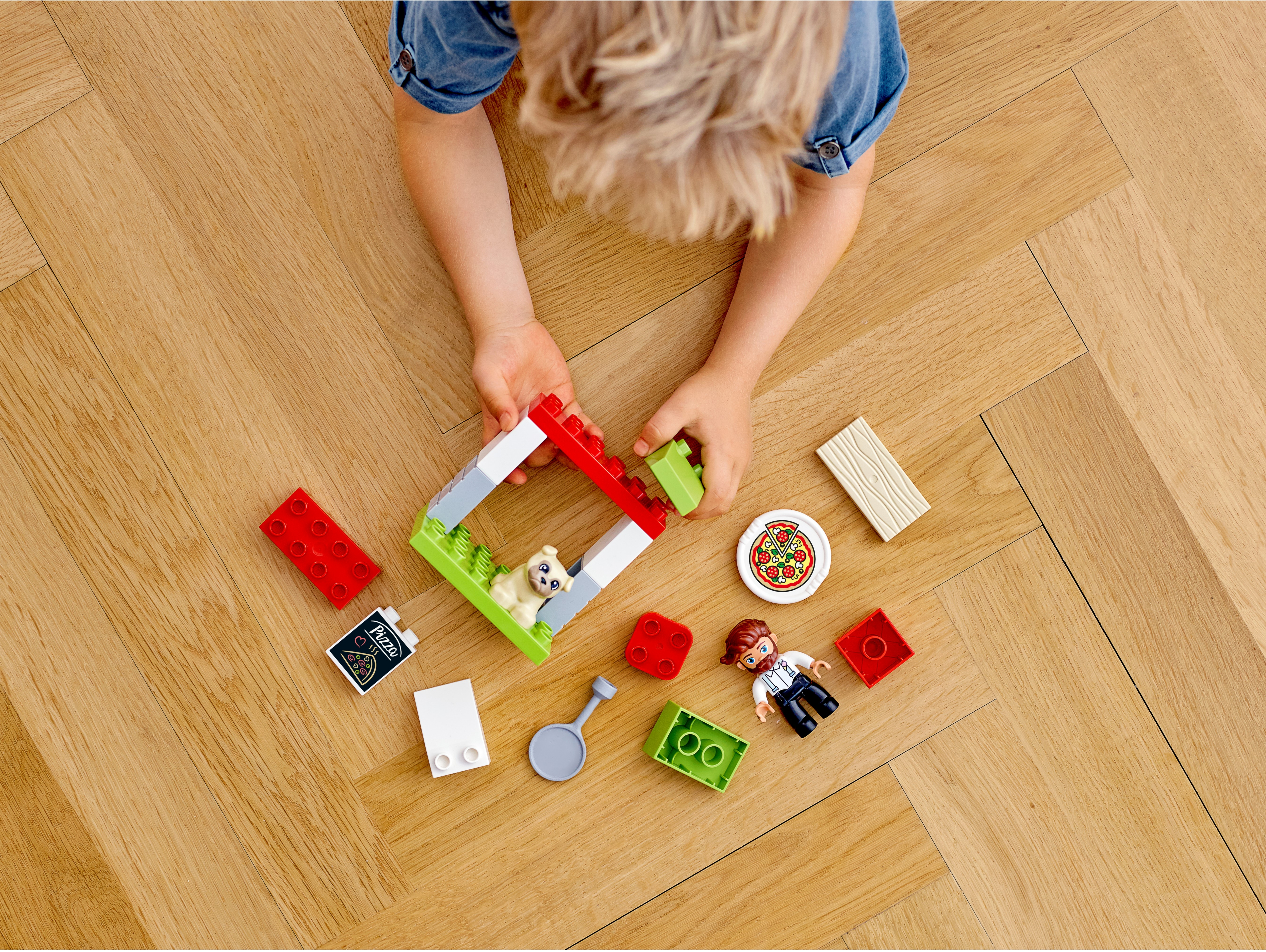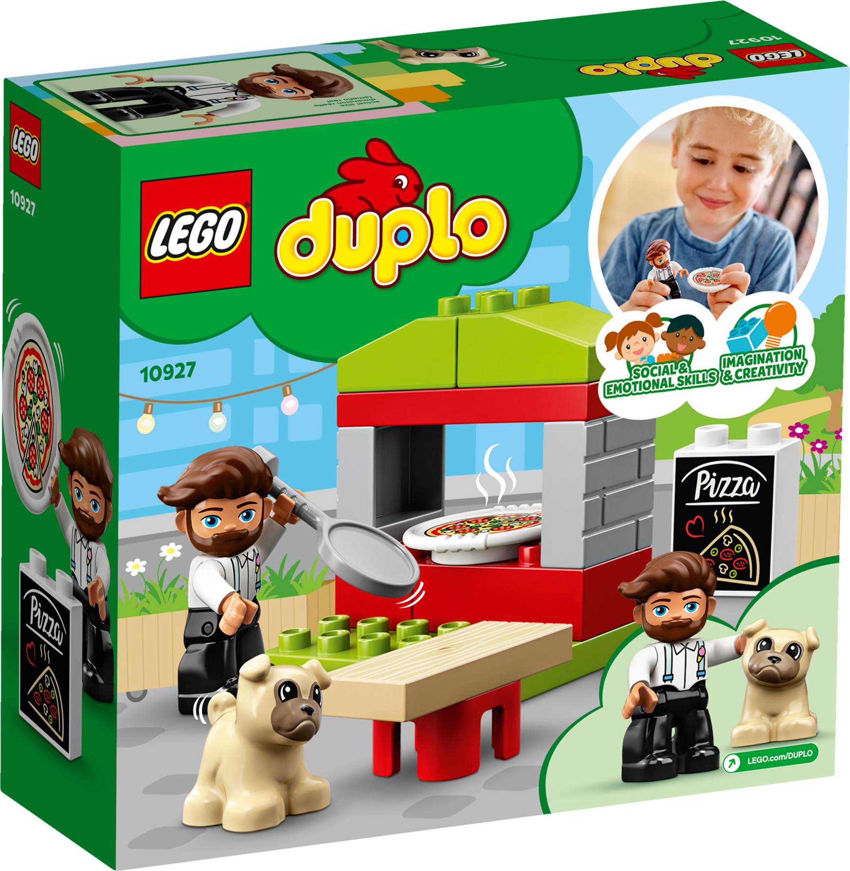 Enjoy pretend play with pizza! The LEGO® DUPLO® Pizza Stand is an ideal first building playset, providing toddlers with lots to learn and enjoy.Feed young minds with a toy pizza set!Every kid can recognize a pizza – and this contemporary pizza stand toy serves up a delicious mix of fun play and developmental benefits for toddlers and parents to share! Your little pizza maker can help the cook hold up the pizza to attract customers; serve pizza to the table; sit the cook on the chair to eat his favorite snack (pizza!) while the cute dog looks on enviously. With cool colors and a great level of detail, including a wood-style countertop, the versatile LEGO DUPLO Pizza Stand can be rearranged and redesigned for endless role-play fun.Pretend play learning toys – great gifts for toddlers!With relatable characters and familiar scenarios, LEGO DUPLO educational toys for toddlers put open-ended play and self-expression into preschoolers hands – encouraging fine motor skills and social & emotional development.The versatile LEGO® DUPLO® Pizza Stand provides toddlers, parents and carers with lots of role-play fun to share together. This toy’s an ideal LEGO starter set, packed with playful learning for kids to enjoy.As the pizza guy cooks a yummy pizza at his toy food stand, a cute dog looks on hopefully. The pizza stand is colorful and contemporary, with a wood-style countertop, and includes a menu, table, chair – and pizza!Toddlers develop fine motor and social & emotional skills as they build, play, redesign and play again with this busy food playset. Cook and serve delicious pizza. Does the doggy deserve a slice?Boys and girls will love playing out imaginative stories with this fun pizza stand. They’re serving pretend play all day at this fun-filled mini-restaurant! Great gift for toddlers aged 2 and over.The pizza stand measures over 4” (11cm) high, 3” (9cm) wide and 2” (7cm) deep. This adaptable playset integrates seamlessly with other LEGO® DUPLO® sets to expand kids'pretend play and learning possibilities.This educational toy for toddlers and preschoolers is battery-free – so the foody fun never ends! LEGO® DUPLO® hands-on toys kickstart young kids’ creative, imaginative and practical thinking.Simple, clear instructions ensure kids can create and enjoy this easy-to-assemble LEGO® DUPLO® toy pizzeria immediately. Then, the more they play, the more their imagination will conjure up exciting new possibilities.With easy-to-handle bricks and friendly, familiar characters, LEGO® DUPLO® Town toys develop kids’ creative-thinking and fine motor skills while delivering endless imaginative play.LEGO® DUPLO® toys meet the highest industry standards, so they are consistent, compatible and connect and pull apart perfectly every time – and it's been that way since 1969.LEGO® DUPLO® bricks and pieces are tested to the extremes to ensure they meet the highest global safety and quality standards, and you can be sure the toy is absolutely safe for your child.