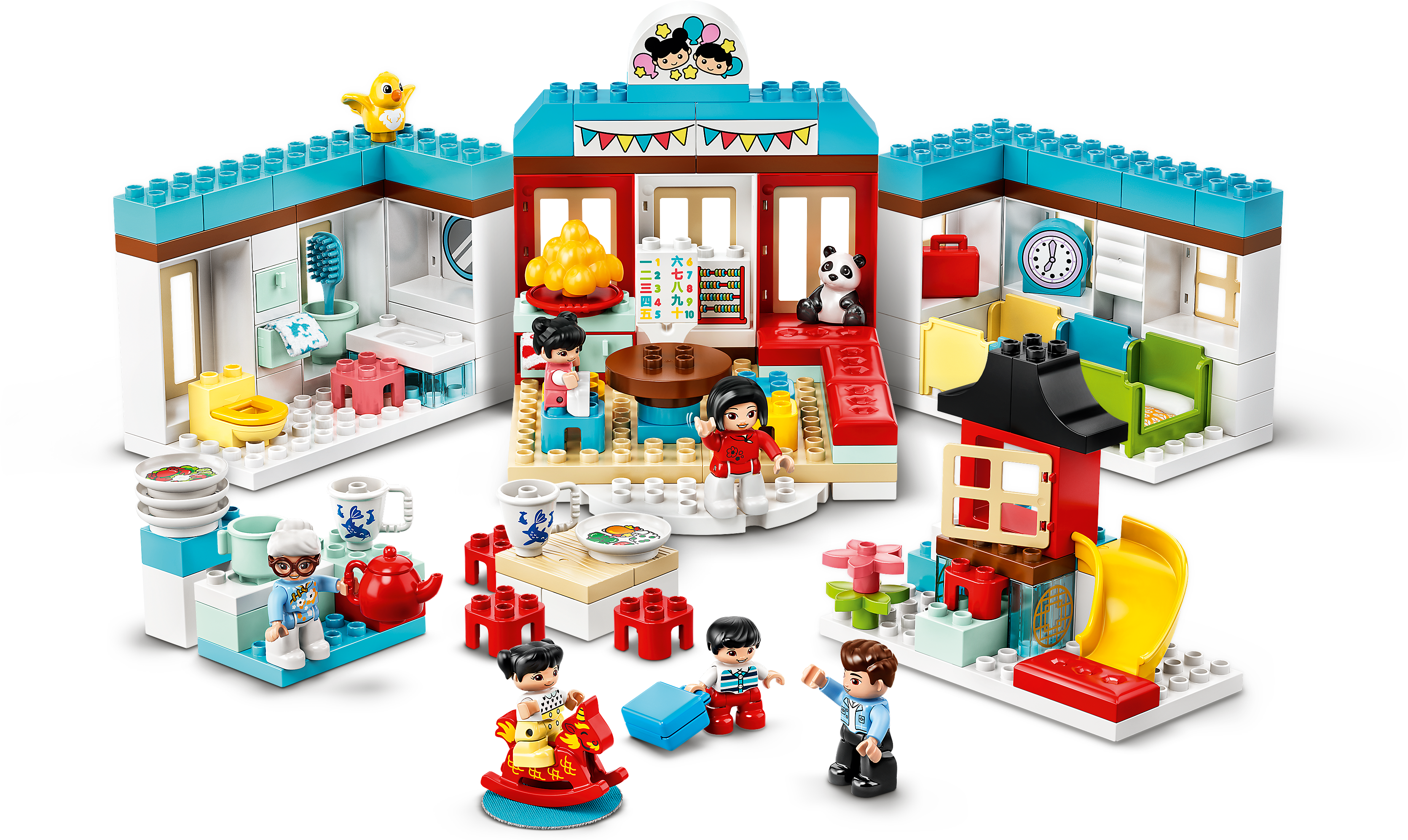 LEGO® DUPLO® Town Happy Childhood Moments (10943) introduces preschoolers to 2 exciting events – Chinese New Year celebrations and the first day at kindergarten. With 2 alternative building designs, this educational toy provides toddlers with endless playful learning opportunities.Play that prepares children and reassures parentsParents and children can share precious developmental moments as they explore the set's 2 alternative arrangements. Kids play out Chinese New Year family traditions – including exchanging their red envelopes and eating dumplings – and practice and prepare for the daily routines of kindergarten. As they role-play these real-life events, kids acquire essential knowledge, build fine motor abilities, improve social skills and develop emotional intelligence – which will benefit them when they experience these events in real life.Hands-on educational toys for toddlersLEGO DUPLO playsets put open-ended fun, self-expression and joyful learning into preschoolers' hands.LEGO® DUPLO® Town Happy Childhood Moments (10943) is a premium, 2-in-1 playset which teaches preschoolers about 2 big family events: Chinese New Year celebrations and the first day at kindergarten.The playset is packed with high-quality features, including opening doors and windows, textiles for the beds, opening drawers, a dim sum table to rotate and a slide for figures to ride down.As kids role-play Chinese New Year family traditions and the daily routines of kindergarten, they develop skills that will benefit them when they experience the events in real life.For ages 2 and up. A stand-out, feature-packed gift that lets preschoolers play out and learn about the fun details of the big occasions in their life.The Chinese New Year playset measures over 11 in. (28 cm) high, 17 in. (44 cm) wide and 17 in. (44 cm) deep; and the kindergarten over 8 in. (21 cm) high, 17 in. (44 cm) wide and 15 in. (40 cm) deep.There's so much for kids to learn as they play: numbers, letters, time, daily habits, food preparation, bedtime routines, potty training… as well as the importance of family and friends.Parents and grandparents will enjoy this playset almost as much as the children, as they enact family reunions, role-play cherished traditions and soothe any anxiety about starting kindergarten.Introduce preschoolers to familiar scenarios, fun characters and playful learning with LEGO® DUPLO® Town playsets. These toys are expertly designed to develop young minds through open-ended play.LEGO® DUPLO® components meet rigorous industry quality standards to ensure they are easy for little fingers to pick up, place and pull apart – and it’s been that way since 1969.LEGO® DUPLO® bricks and pieces are dropped, heated, crushed, twisted and analyzed to make sure they fulfil stringent child safety standards.