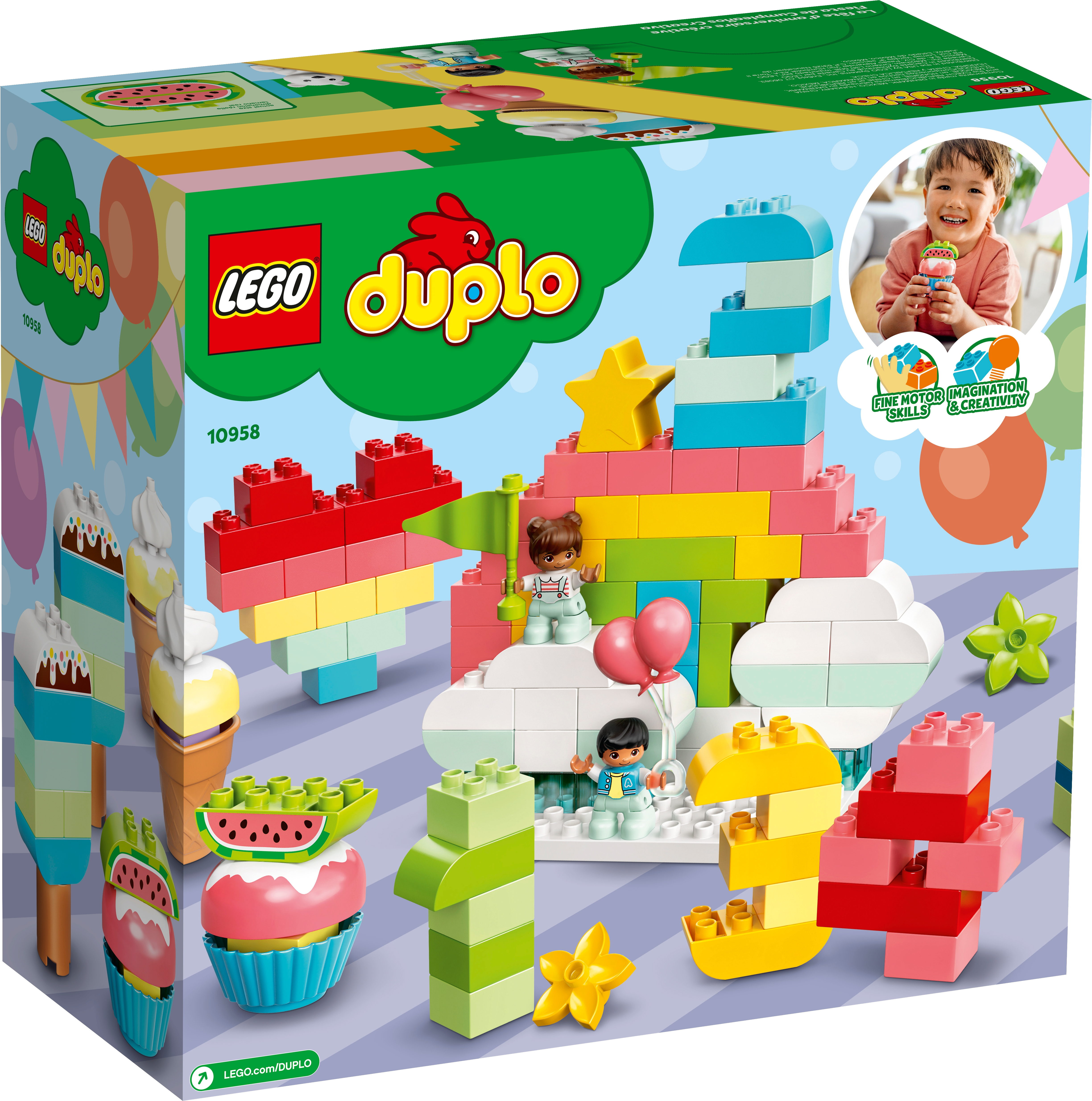 It’s time to celebrate with the LEGO® DUPLO® Classic Creative Birthday Party (10958)! Bursting with colorful bricks and pieces, this versatile playset delivers maximum play value.Endless play possibilitiesStimulate toddlers’ imaginations and skill development with LEGO DUPLO Classic Creative Birthday Party. The entertaining learning possibilities never end with this colorful mix of bricks. There are inspirational builds for parents and toddlers to assemble, plus anything else they can imagine – from making a birthday cake and party food to building presents and figures for number play.Educational building toys for toddlersLEGO DUPLO playsets make great gifts for toddlers. With colorful, easy-to-hold pieces that excite imaginations and encourage open-ended play, they put creative control right into the hands of preschool kids.The great-value LEGO® DUPLO® Classic Creative Birthday Party (10958) is bursting with colorful bricks and pieces that introduce little builders to hands-on construction and playful learning.Inspire young imaginations with 200 colorful bricks and fun shapes, including a star and a water melon. There's so much in this versatile construction set, kids will never stop playing and learning.The toddler-friendly bricks combine to create a birthday cake, presents, party food, numbers and more. Parents can help to build the inspirational builds, or anything else they can imagine.For ages 18 months and up. With pieces that are perfect for small hands to pick up and place, this fun learning toy for toddlers is a great gift for Christmas, holidays, birthdays or ‘just because'.This 200-piece set offers unlimited play possibilities. Combine the contents with other LEGO® DUPLO® sets for even more fun.Simple building instructions help parents and toddlers build a range of imaginative models. With so many pieces to inspire creativity, the free-building fun is as boundless as kids’ imaginations.All LEGO® DUPLO® playsets are expertly designed with imaginative features to encourage open-ended developmental play that parents can share with their little ones.LEGO® DUPLO® playsets meet stringent industry quality standards to ensure they are easy for little fingers to pick up, place and pull apart – and it's been that way since 1969.LEGO® DUPLO® bricks and pieces are dropped, heated, crushed, twisted and analyzed to make sure they satisfy rigorous child safety standards.