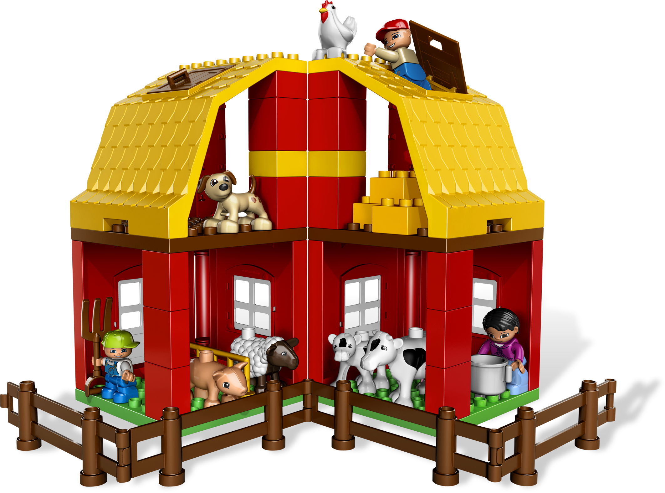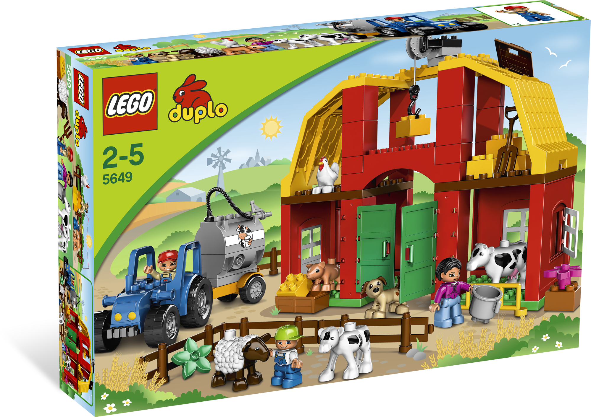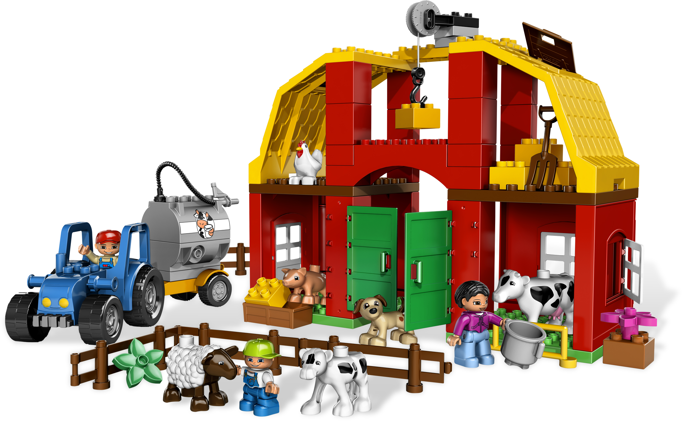 It’s another big day at the Big Farm! There’s always something to help with on a farm. Mom is feeding the cows, Dad is bringing the milk to the dairy, and the little boy is taking great care of the baby calf! Now, where did that cute little puppy go? LEGO® DUPLO® pieces are fun, colorful and safe for younger hands! Includes barn, farm family figures, plus a puppy, and more Also includes livestock, truck, milk tank and more farm accessoriesHook hale bales and hoist 'em up to store in the barn!Award Winner: National Parenting Seal of Approval