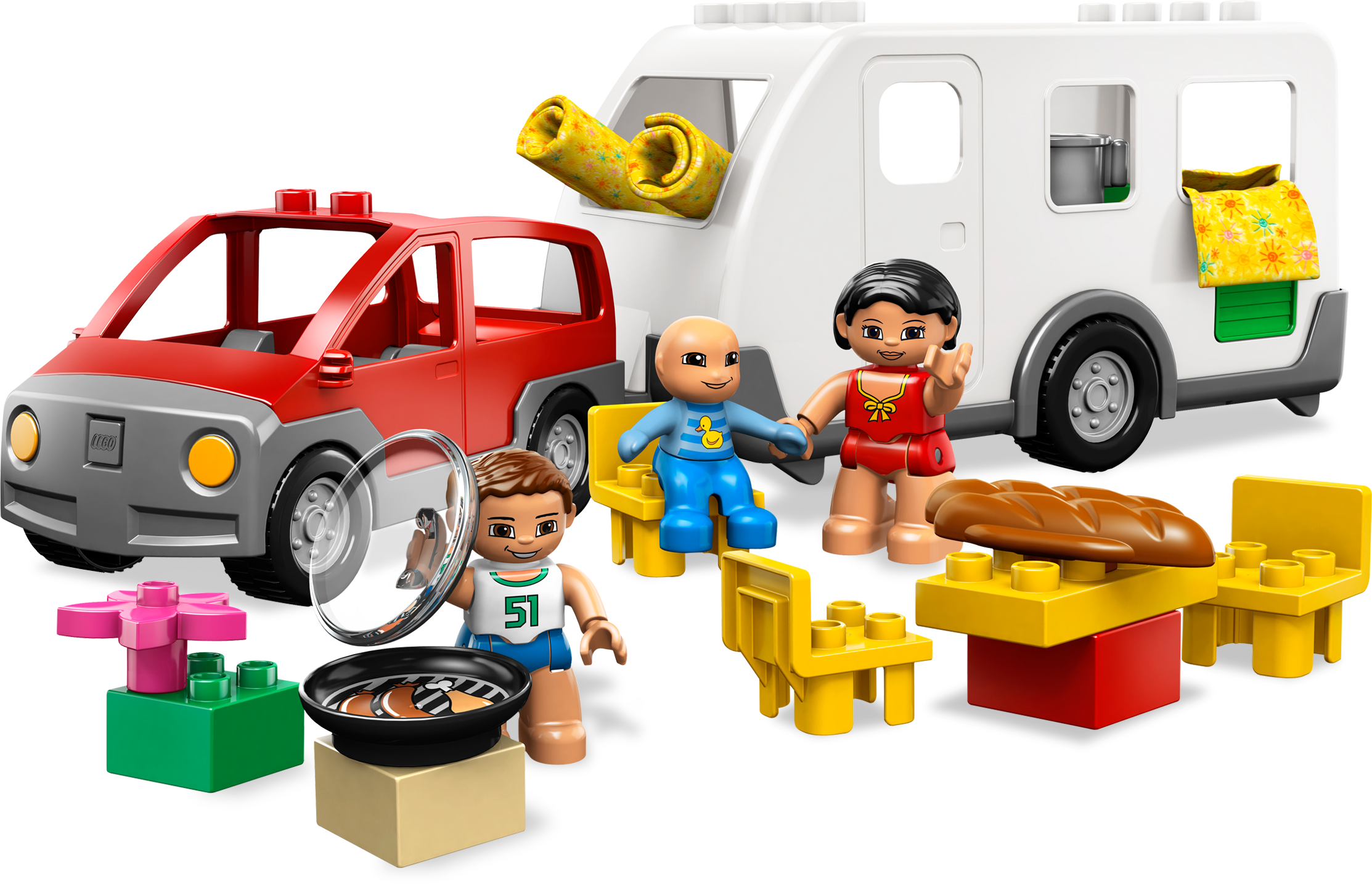 Summer time is great for a camping trip! Summer’s here and the weather’s warm so it’s the perfect time for a camping trip! While Mom entertains the baby, Dad is busy barbecuing dinner! Includes Mom, Dad and baby LEGO® DUPLO® figures; caravan and car plus more fun accessories!Includes 3 LEGO DUPLO figures: Mom, Dad, and babyFeatures 3 cloth sleeping bags, barbecue, 3 chairs, bread, flower and flower potCaravan measures over 7" (17cm) longCar measures 5" (12cm) long