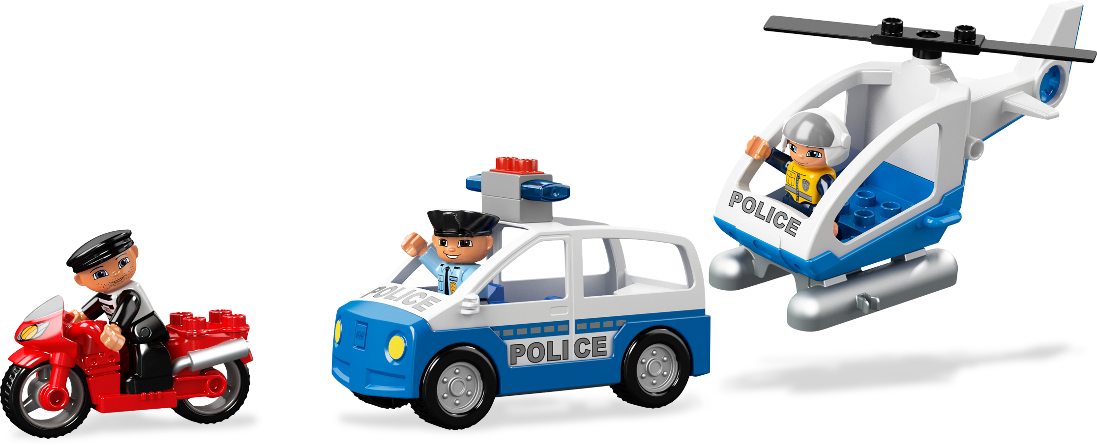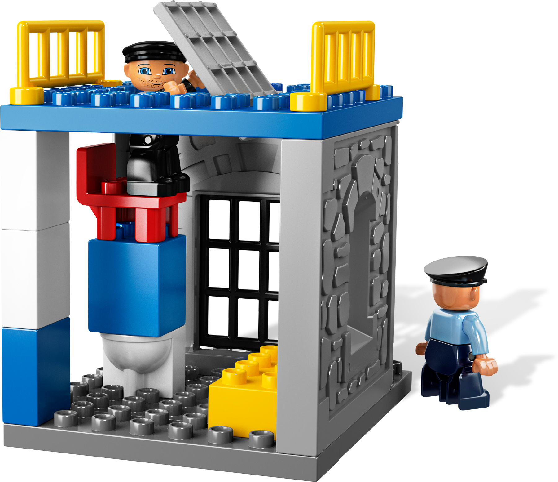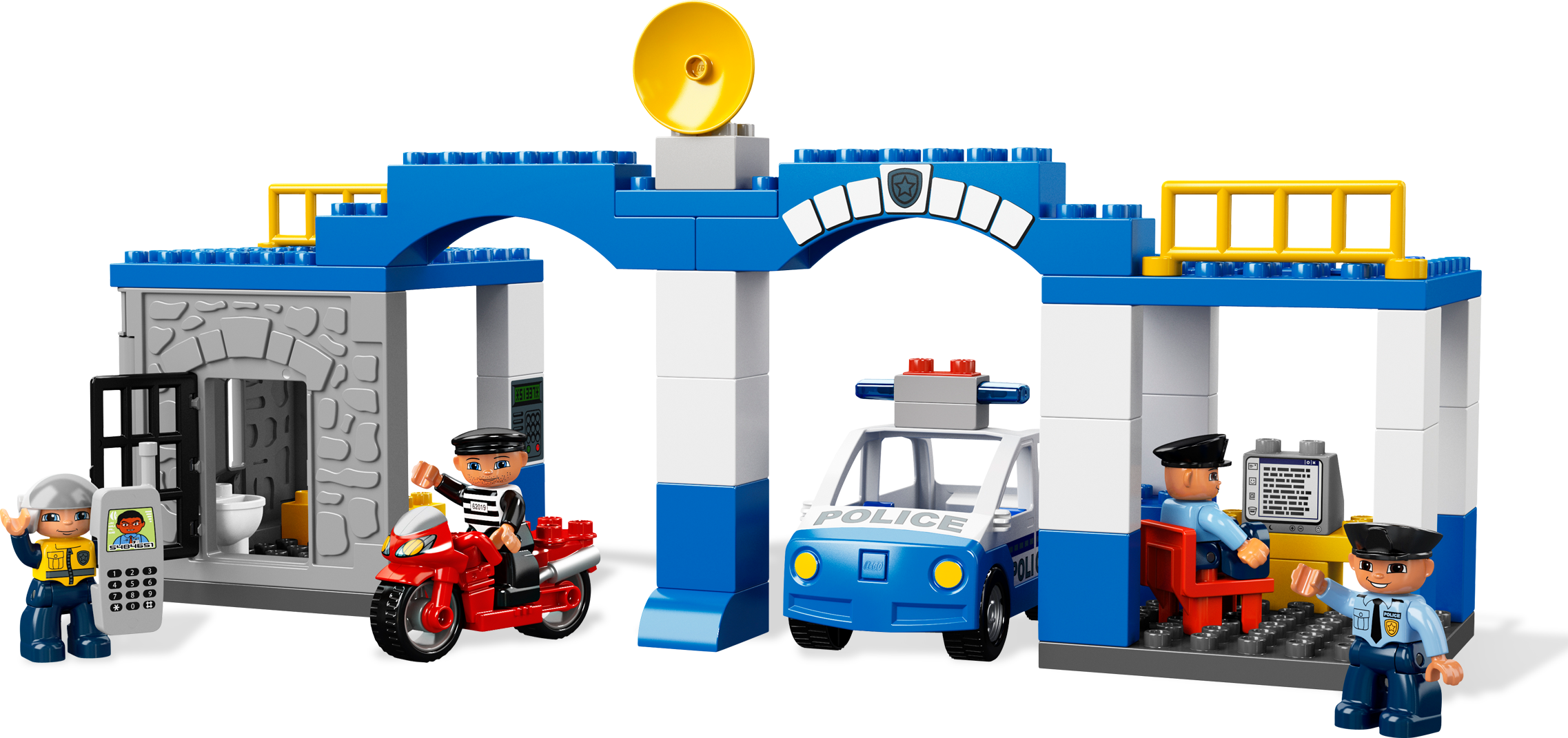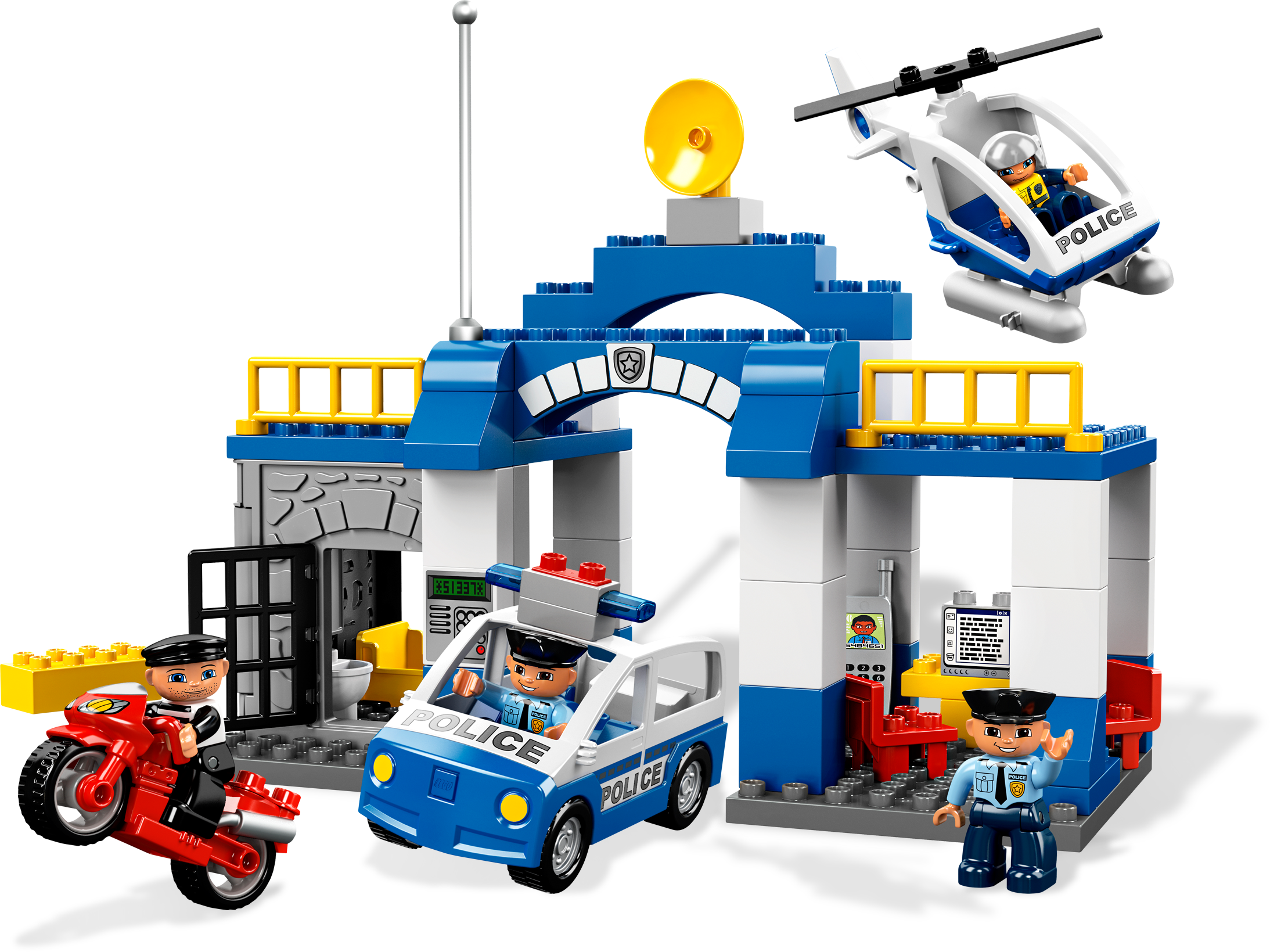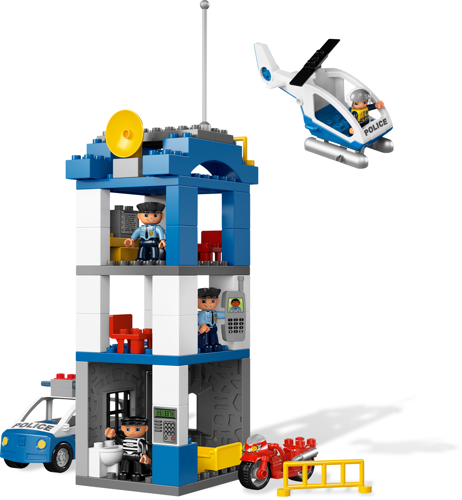 Protect and serve with the Police Station! The robber is escaping from prison on a motorcycle! Help the police nab him using the police car and helicopter. Can you catch the robber before he gets away? Lock him up in the prison! Realistic details include a bed and chair. LEGO® DUPLO® figures and animals are colorful, safe and sturdy for little hands and big imaginations. Includes 4 LEGO® DUPLO® figures: 3 policeman figure and robber Features all-new motorcycle, helicopter and police car Police Car has lights and sound siren Capture the robber and lock him up! LEGO DUPLO products are fun and safe for younger hands