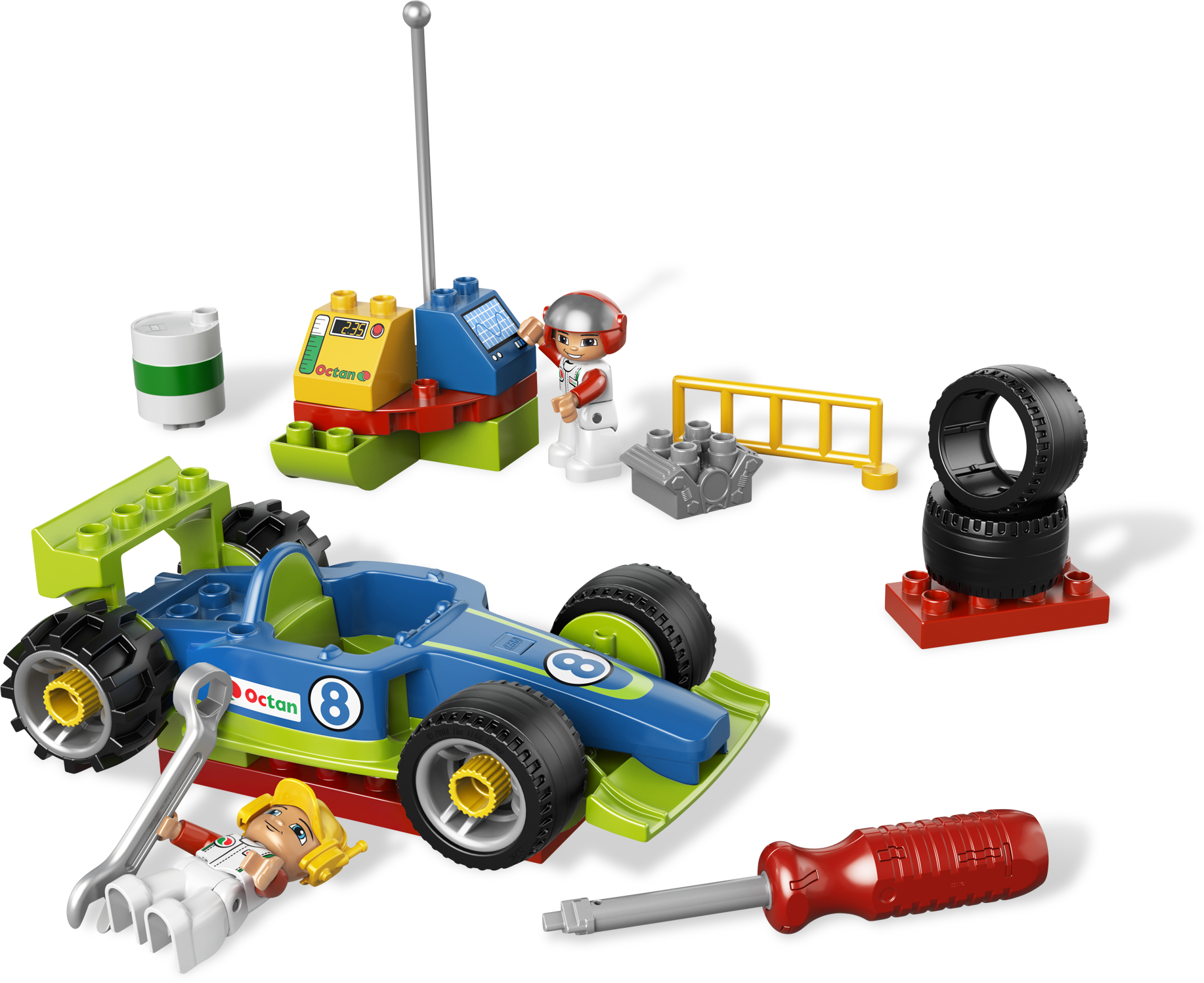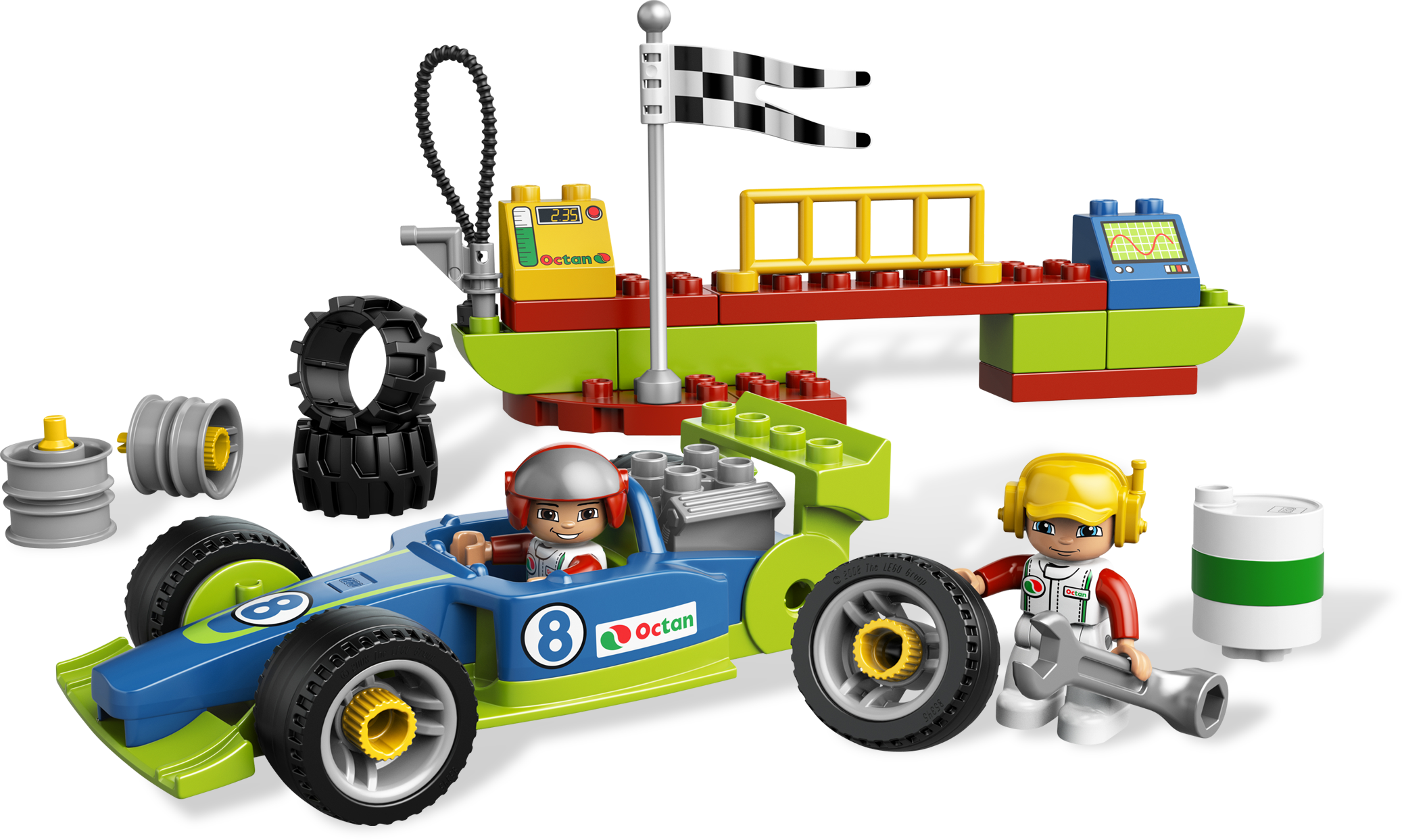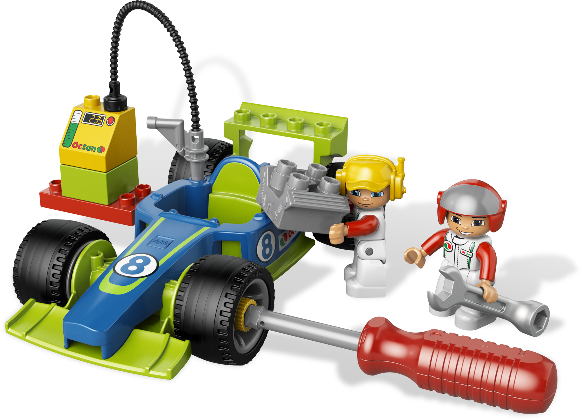 Win the race with the LEGO DUPLO racing team! The LEGO DUPLO race team is getting ready for the big race! Fill up the racing car with fuel, check the oil and change the tires with the DUPLO screwdriver. It's time to go racing! Includes big race car and 2 DUPLO figures.• Includes 2 LEGO DUPLO figures: racing car driver and mechanic• Features big racing car, DUPLO screwdriver and 6 changeable tires (4 all-weather and 2 off-road)• Accessories include DUPLO tools, fuel, hose, oil drum, computer, flag and selection of basic DUPLO bricks• Race the racing car!• Change the tires!• Make a quick pit stop!• Win the race!• DUPLO products are fun and safe for younger hands• Race car measures over 7” (20cm) long, 4” (12cm) wide and 2” (7cm) tall• Pit stop measures over 10” (26cm) long, 2” (6cm) wide and 5” (14cm) tall