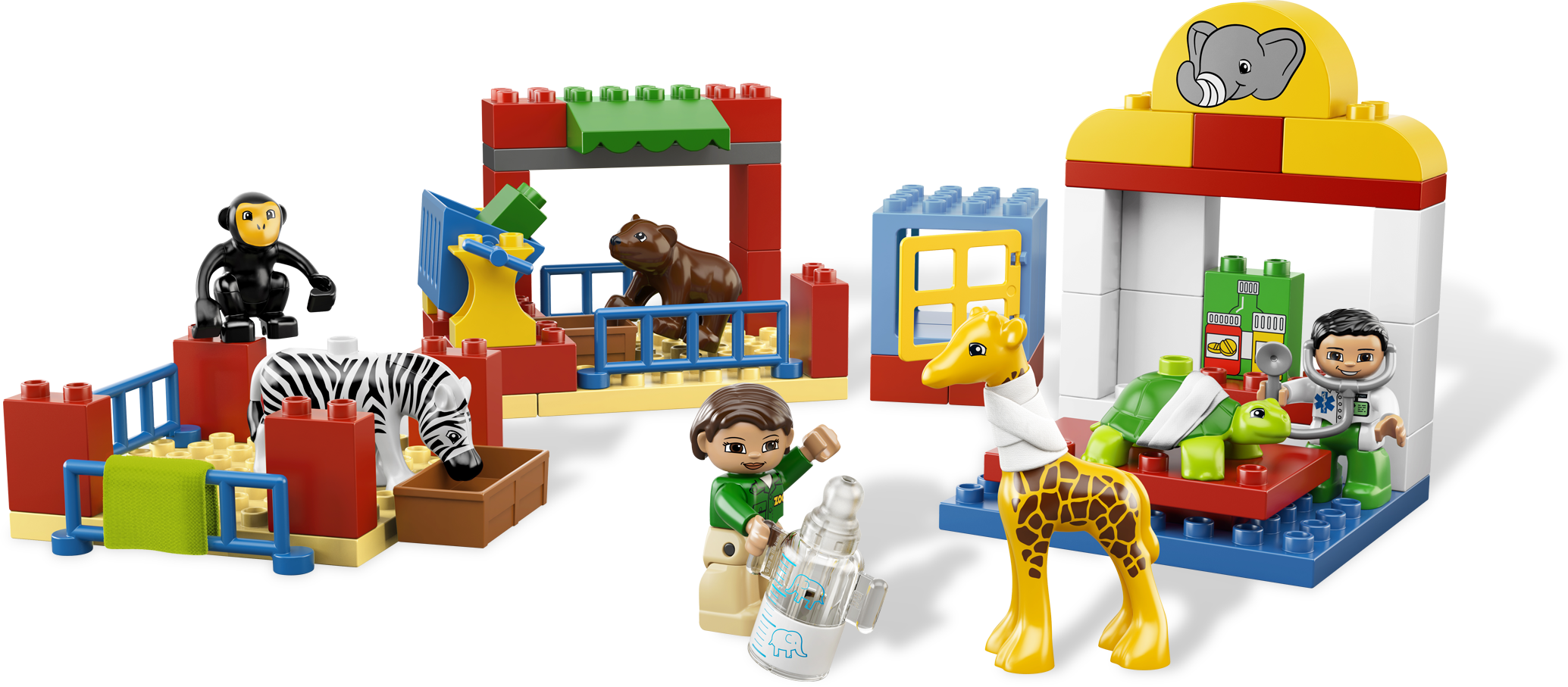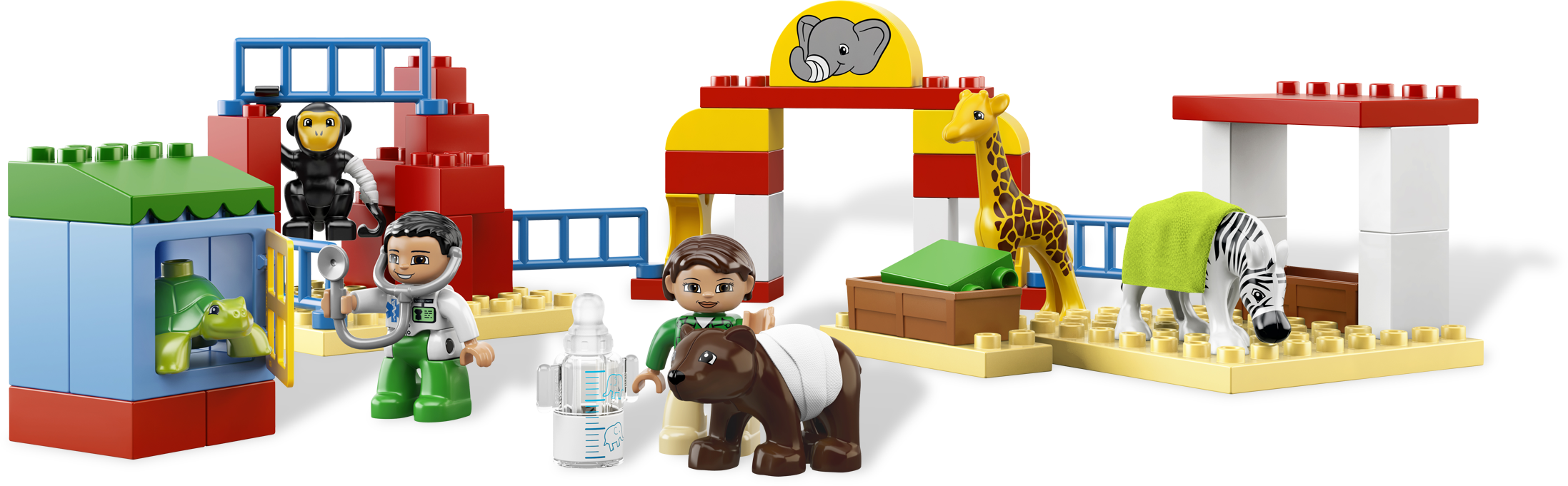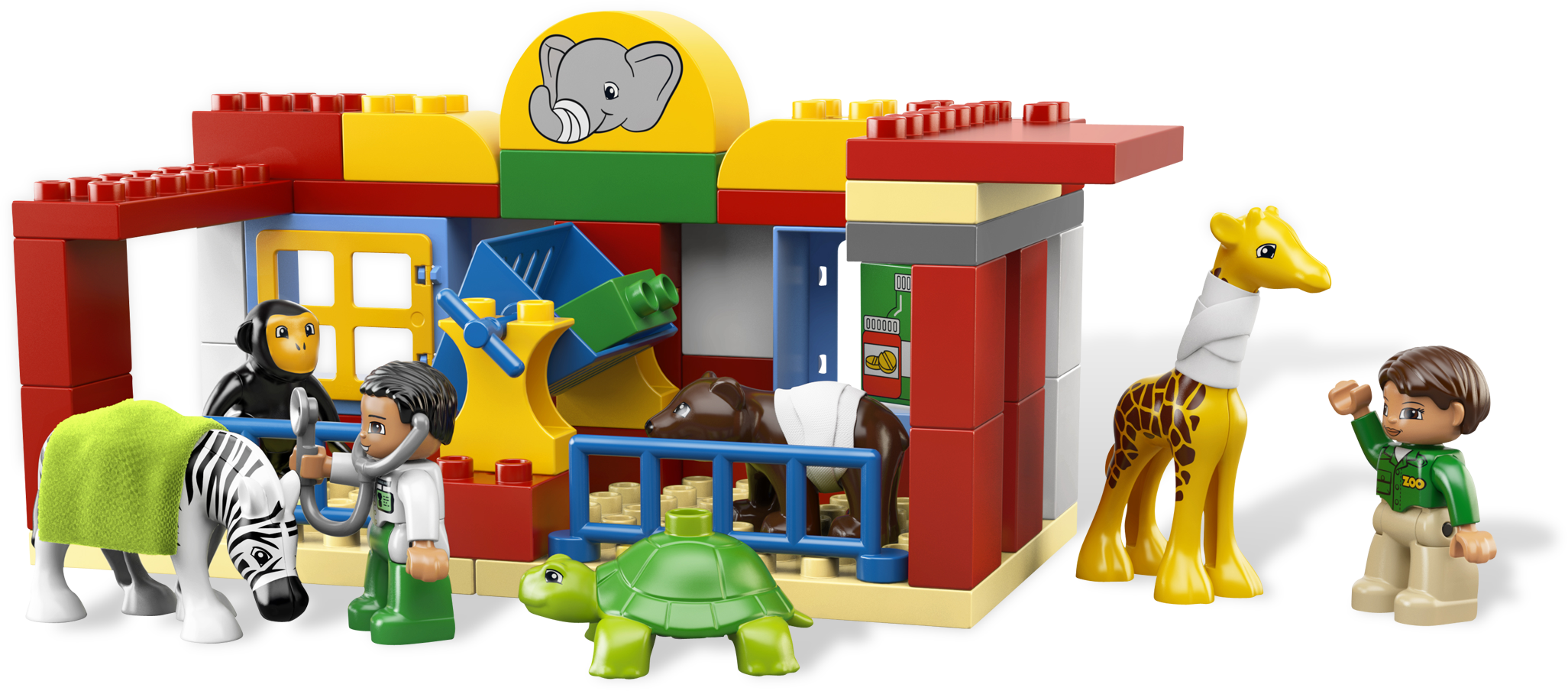 Make all of the animals feel better again! At the Animal Clinic, the vets are helping the poorly animals get well again. Whether they are putting a bandage around the giraffe’s neck or feeding the baby animals warm milk, there’s always something to do for the busy vets. Includes 5 LEGO® DUPLO® animals and 2 vet DUPLO figures.Includes 2 vet LEGO® DUPLO® figuresFeatures treatment room, feeding areas, feeding bottle, bandage, blanket and assorted decorated DUPLO bricksIncludes 5 animals: turtle, giraffe, monkey, zebra and bear cubFeed the baby animals milk from the feeding bottle!Put a bandage on the animals!Familiar animal theme helps children to develop imaginationDUPLO products are fun and safe for younger handsAnimal Clinic measures over 19” (50cm) long, 11” (30cm) wide and 7” (18cm) tall
