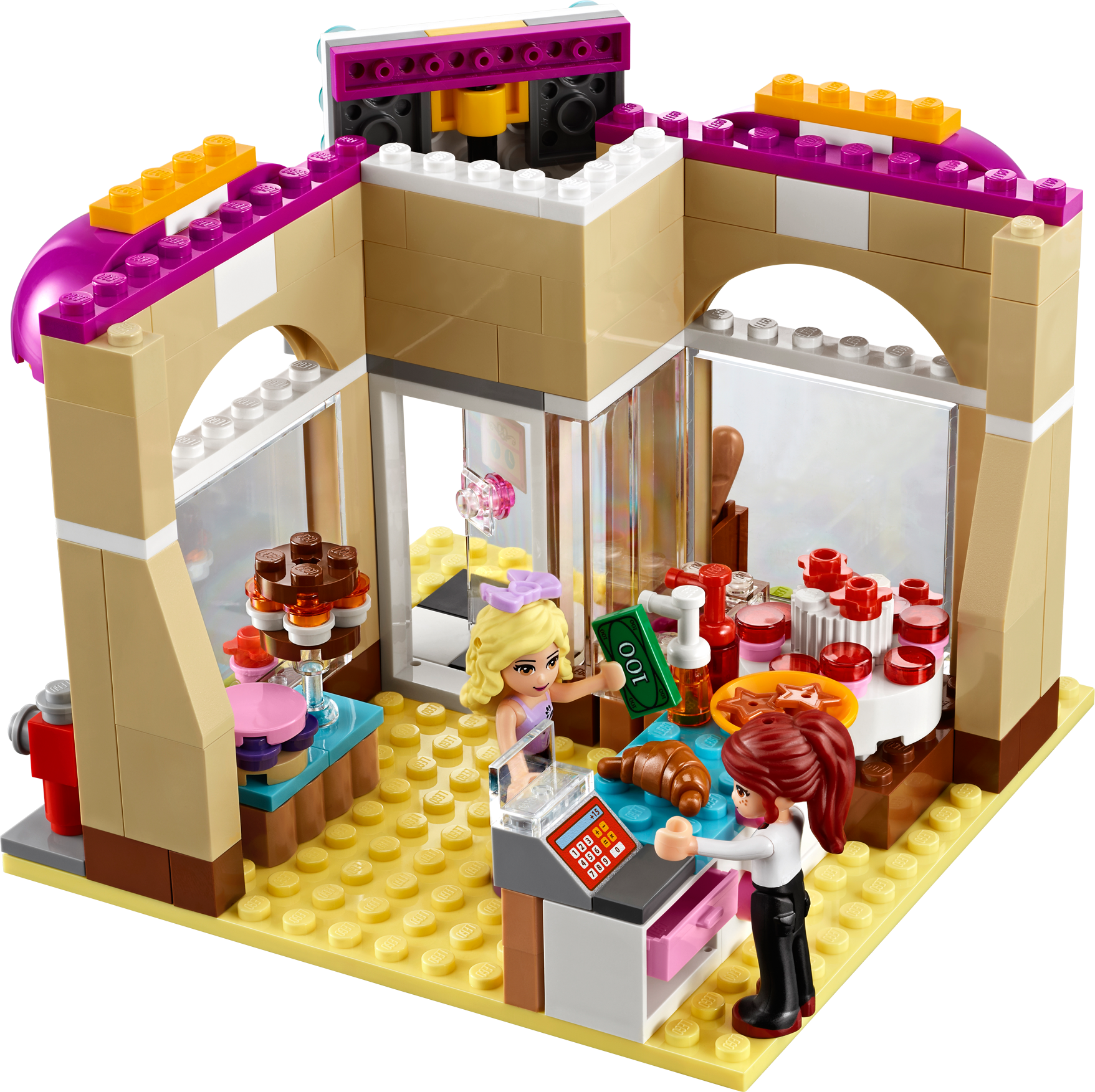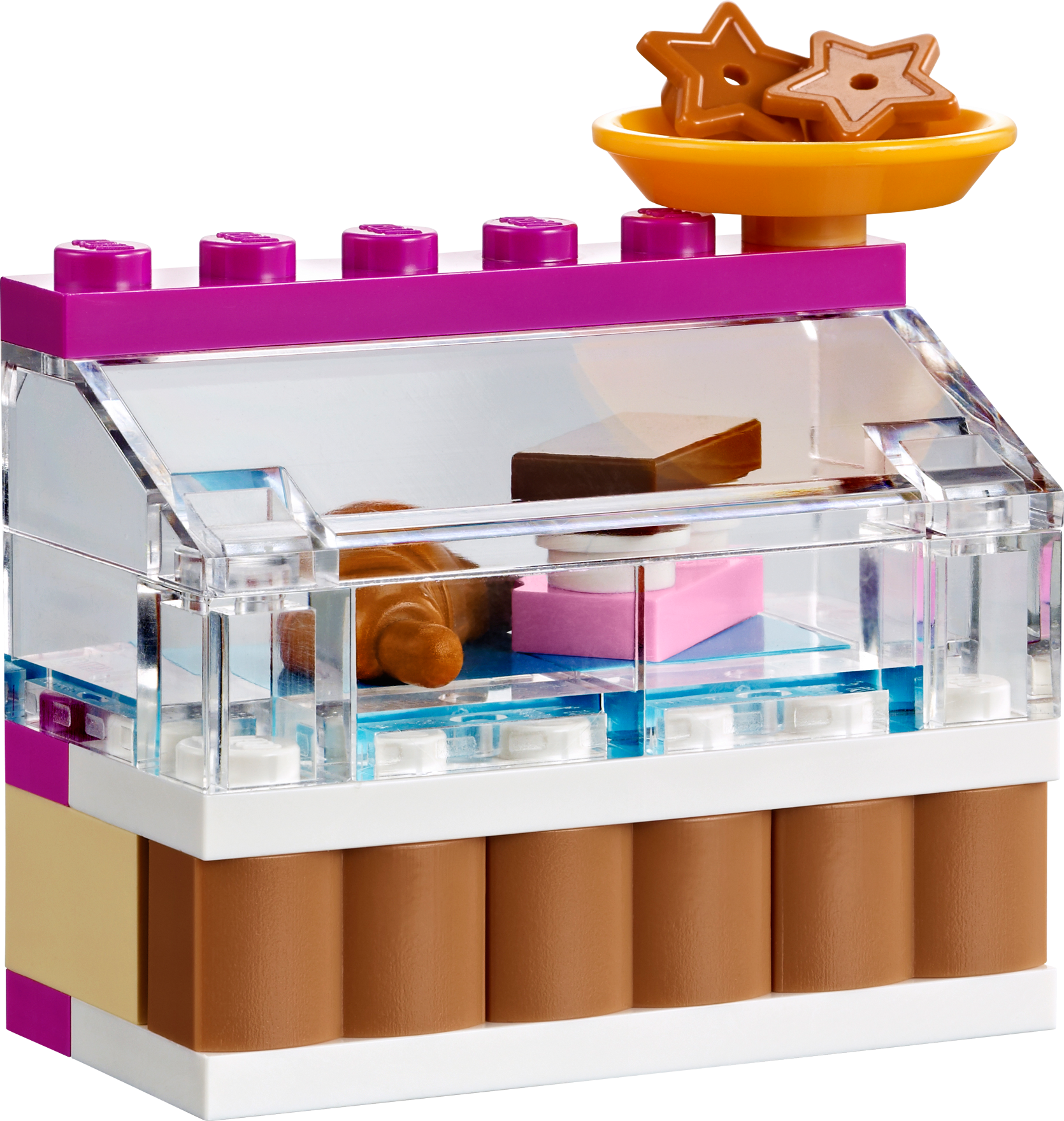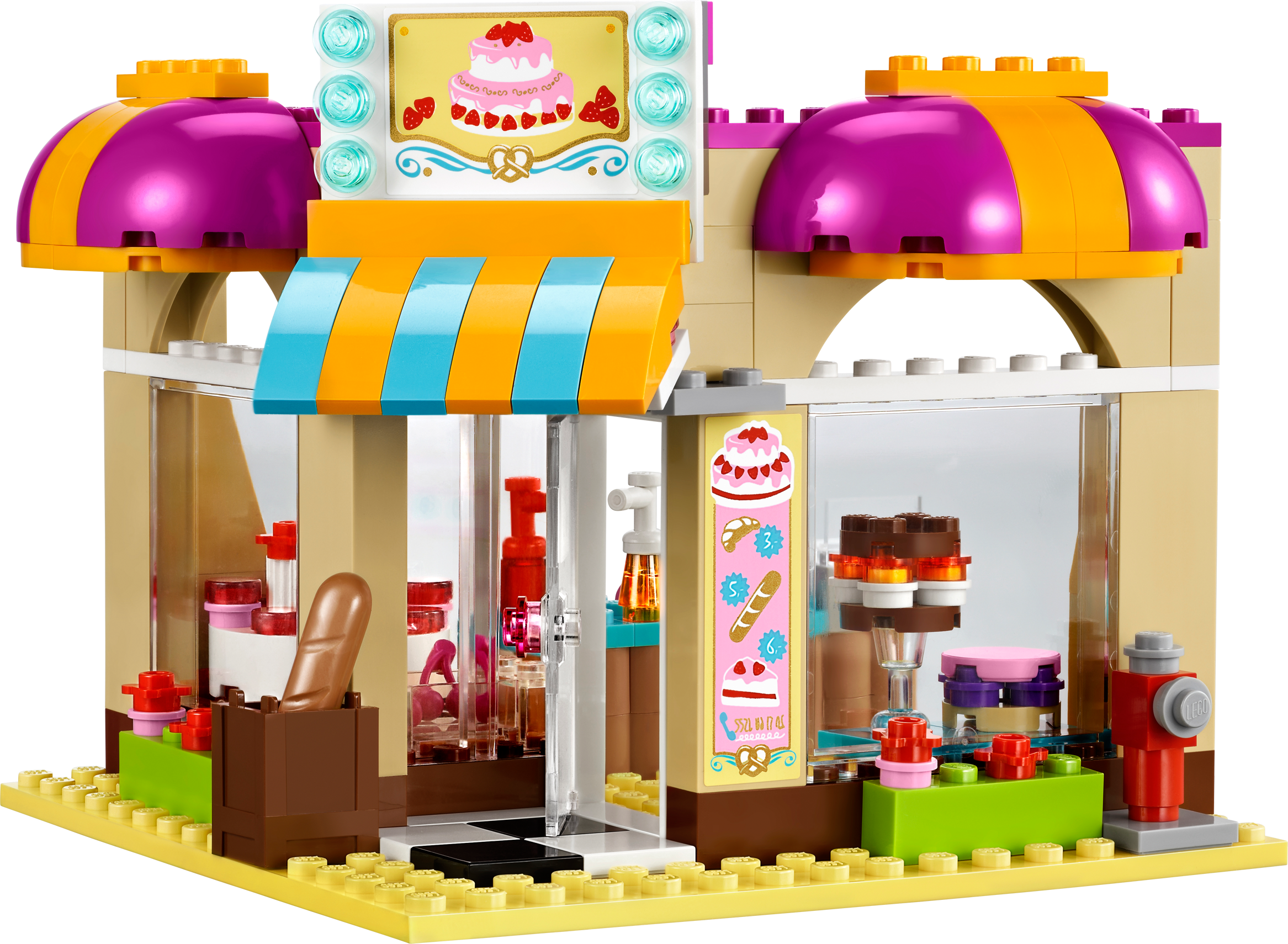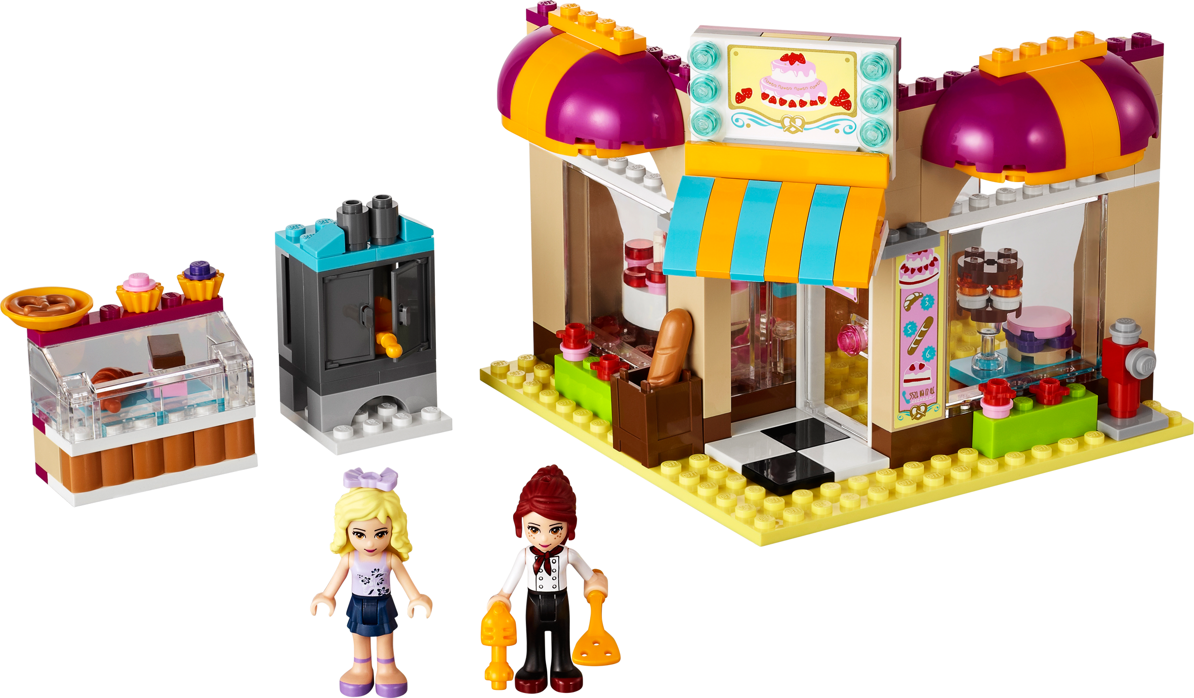 Bake cookies and cakes with Mia! Bake a custom cake at the Downtown Bakery with Mia! Open the sweet little shop by building the sign, canopy and outdoor display. Fill the shelves with cakes, bread, cookies and croissant accessories! When a customer arrives to order a wild-berry birthday cake, get creative in the kitchen with lots of food and utensils. Set the mixture into a pan and place it in the oven until it’s baked to perfection! Decorate it with fruit and ring up the order on the cash register. Includes Mia and Danielle mini-doll figures.• Includes Mia and Danielle mini-doll figures• Features sign and canopy, oven, outdoor cake stand, kitchen with utensils, cash register and a phone• Accessories include cakes, bread, cookies, croissant, fruit and syrups• Open the cash register!• Bake pastries and cakes in the opening oven!• Fill the display stands with fun food accessories!• LEGO® Friends pieces are fully compatible with all LEGO System bricks• Collect all of the LEGO Friends sets for a whole world of LEGO Friends fun!• LEGO mini-dolls are LEGO figures made especially for the world of LEGO Friends that can be customized and combined in thousands of ways• Measures over 3" (10cm) high, 7" (20cm) wide and 5" (13cm) deep