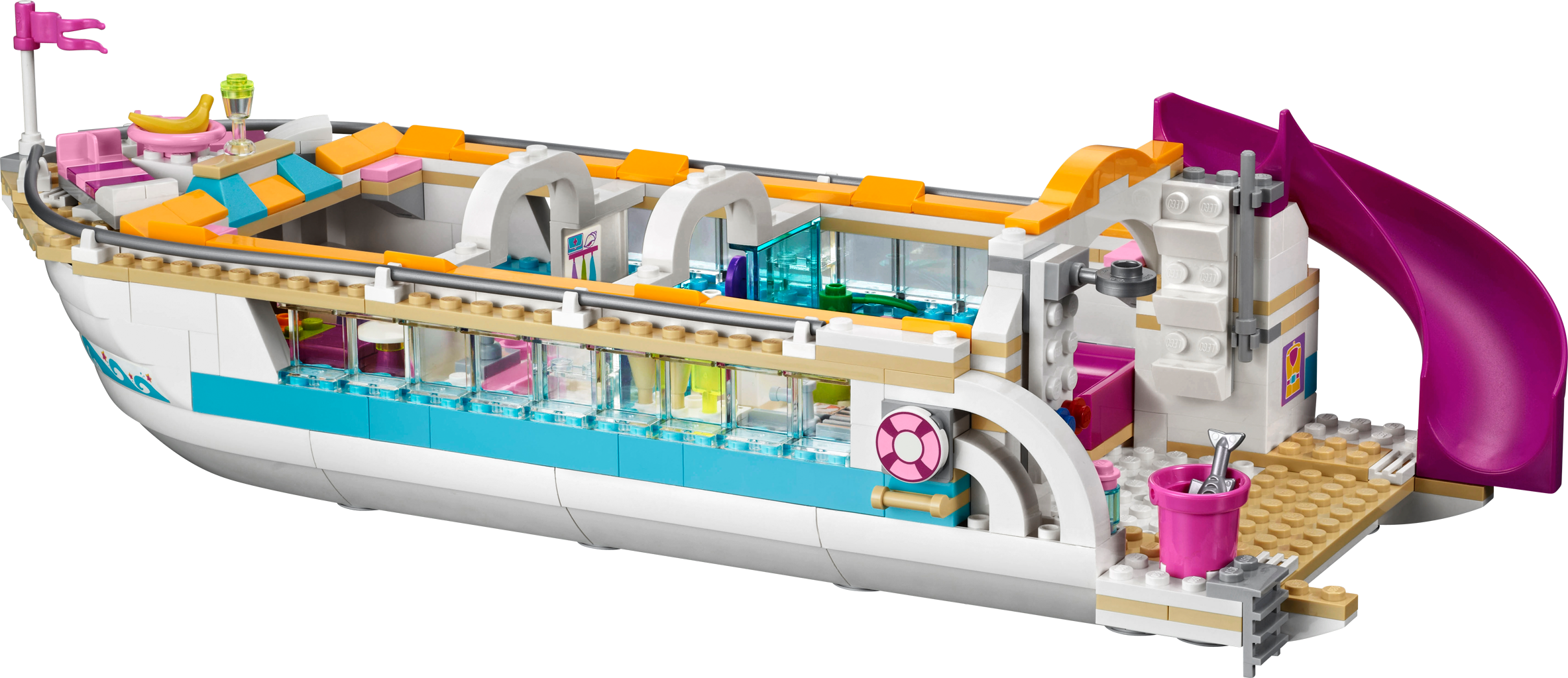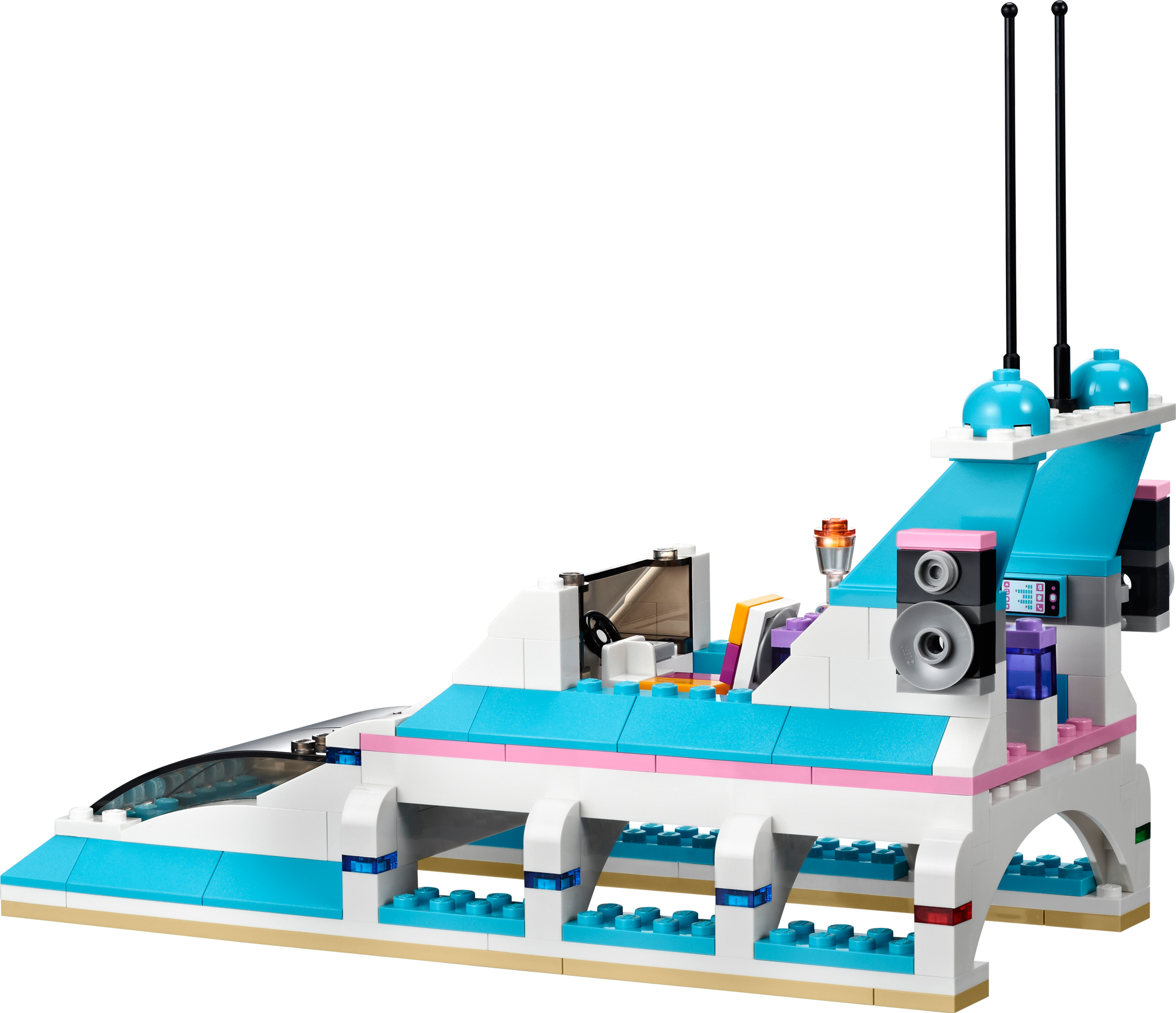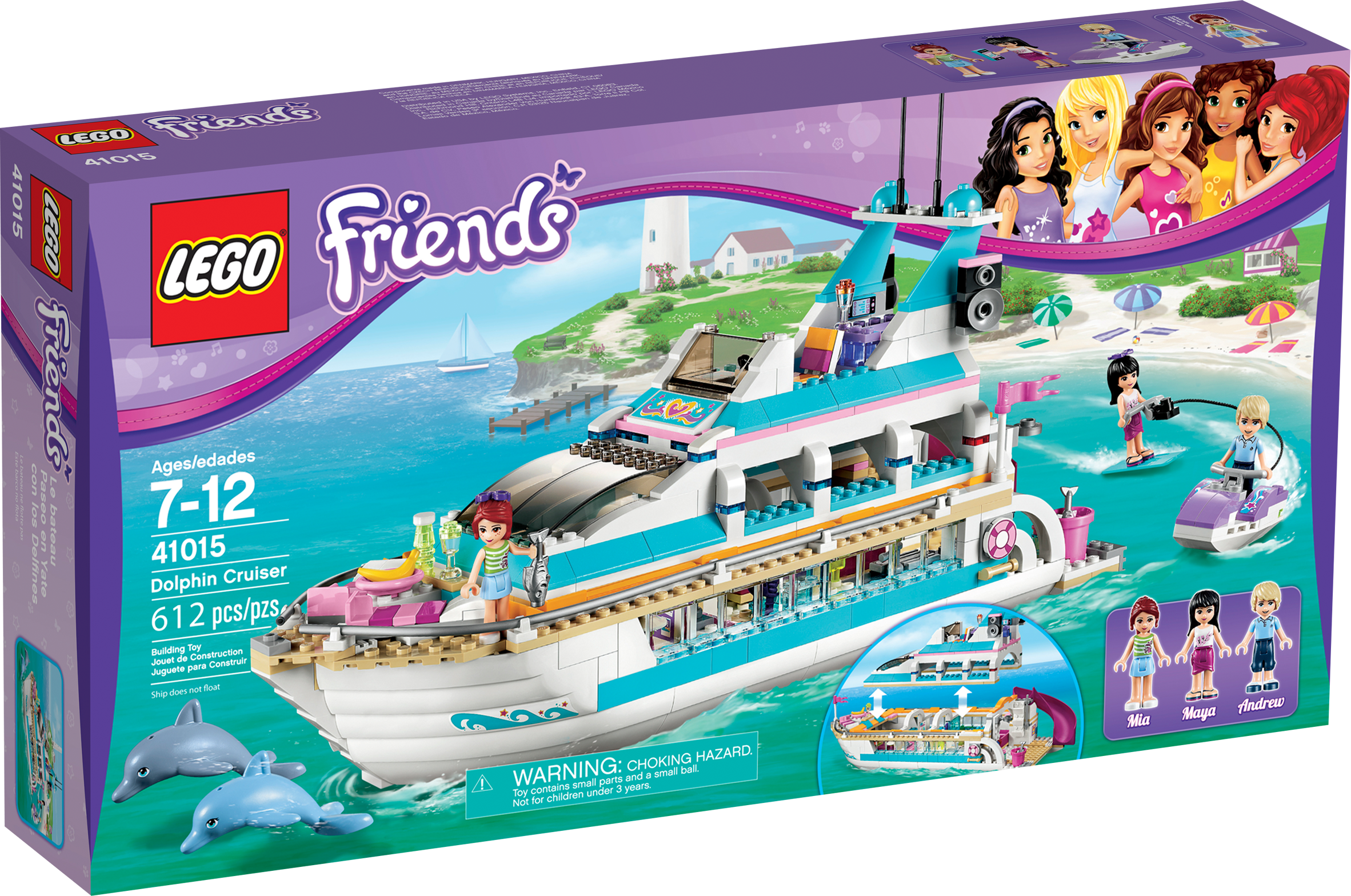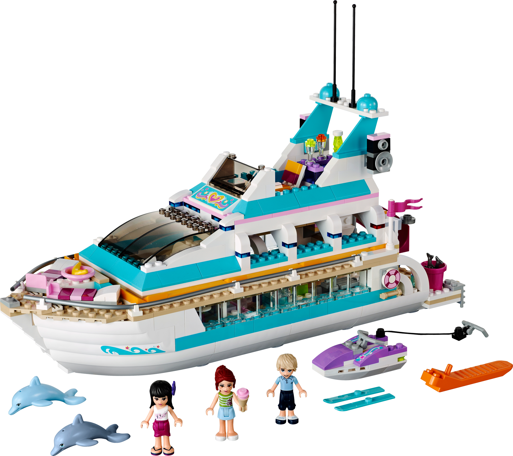 Sail in style on the Dolphin Cruiser! Set course for an ocean adventure on the Dolphin Cruiser with Mia, Maya and Andrew. Steer the boat with Andrew and take the girls for a spin around Lighthouse Island! Shoot down the waterslide or go waterskiing with the personal water scooter when you find a great place to swim! Lay in the sun on the chaise lounges or search for dolphin friends with the sonar! Later, serve up snacks at the picnic table or blend up some yummy fruit drinks at the snack bar! When the sun goes down, open the Dolphin Cruiser to play inside. Get Mia and Maya ready for the party on the captain’s deck with a shower and some primping in the bathroom. Afterwards, hang out in the lower deck living room and tuck the LEGO® Friends into cozy beds. Includes Mia, Maya and Andrew mini-doll figures.• Includes Mia, Maya and Andrew mini-doll figures• Features a waterslide, captain’s deck, kitchen, living room, bedroom with 2 beds, bathroom, shower, bow deck with snack bar and chaise lounges and a personal water scooter• Accessories include waterskis, dolphin sonar, sofa, plant, food accessories, drinking glasses and dolphin food• Take a wild ride on the personal watercraft and the waterskis!• Split the yacht to play inside!• Slip down the waterslide and go for a swim!• Search for dolphins with the sonar!• LEGO® Friends pieces are fully compatible with all LEGO System bricks• Collect all of the LEGO Friends sets for a whole world of LEGO Friends fun!• LEGO mini-dolls are LEGO figures made especially for the world of LEGO Friends that can be customized and combined in thousands of ways• Measures over 6" (17cm) high, 14" (38cm) long and 7" (19cm) wide