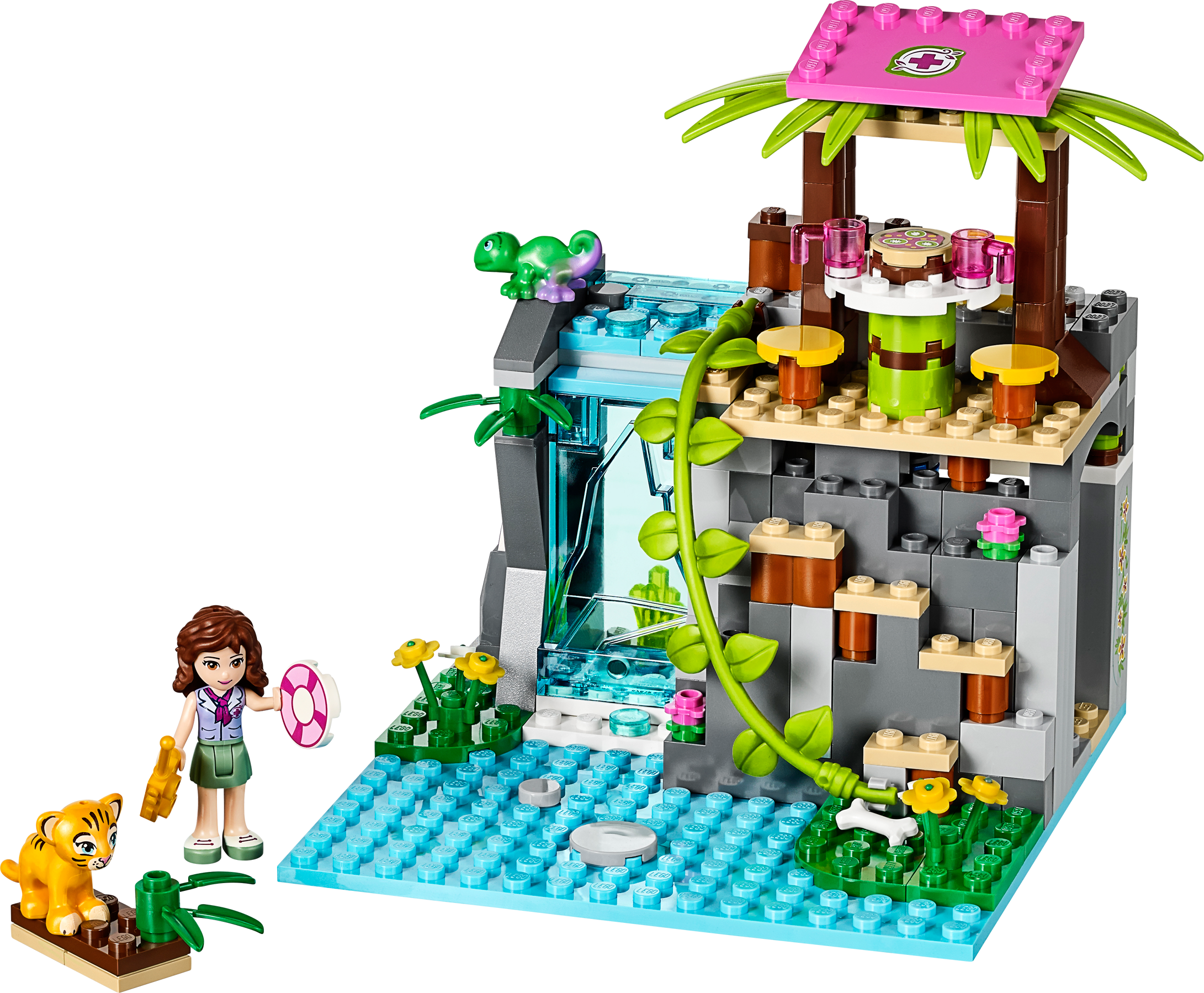 Rescue the tiger cub from the water and explore the beautiful Jungle Falls! Help the tiger in trouble at the beautiful but powerful Jungle Falls! Rush to the riverside and find the tiger stranded in rough waters. Wade in and help Olivia build a dam to stop the waterfall before pulling the tiger to safety. Then head up to the cliff-top hut to cool down with a drink and some fresh fruit salad in the company of the friendly chameleon. Later you can explore the jungle caves together. Who knows what treasures you will find! Includes Olivia mini-doll figure, a tiger cub and a chameleon Features a cliff with stairs, waterfall with dam function, cliff hut with table and stools, trees, flowers and a flexible vineAccessories include driftwood, glasses, fruit salad plates and a precious gem Slide the dam across and stop the waterfallRescue the stricken tiger cub stranded on the driftwoodClimb on the liana to hunt for hidden treasure in the secret caveChill out in the cliff-top hut after a tiring day at the Jungle FallsCliff scene with hut and waterfall measures over 5” (13cm) high, 4” (12cm) wide and 2” (7cm) deepCombine with all the other LEGO® Friends jungle sets to enjoy more animal rescue adventures