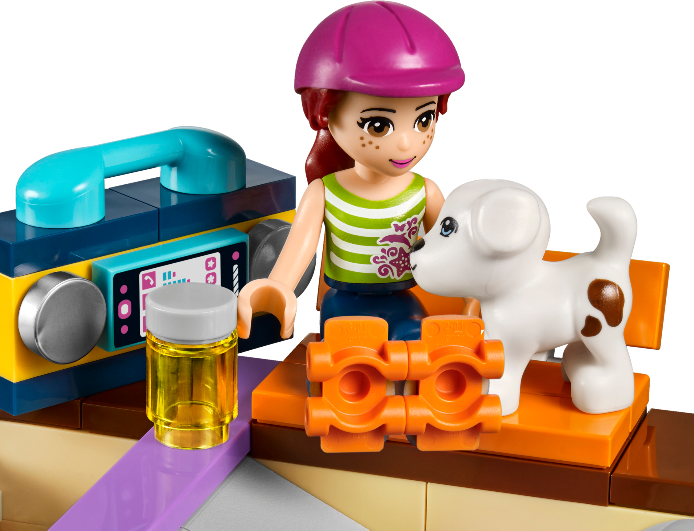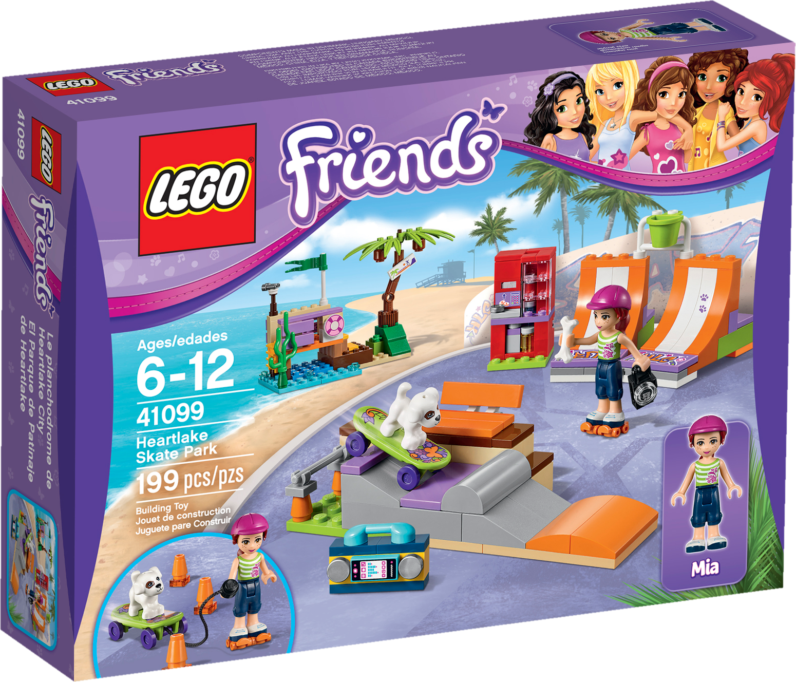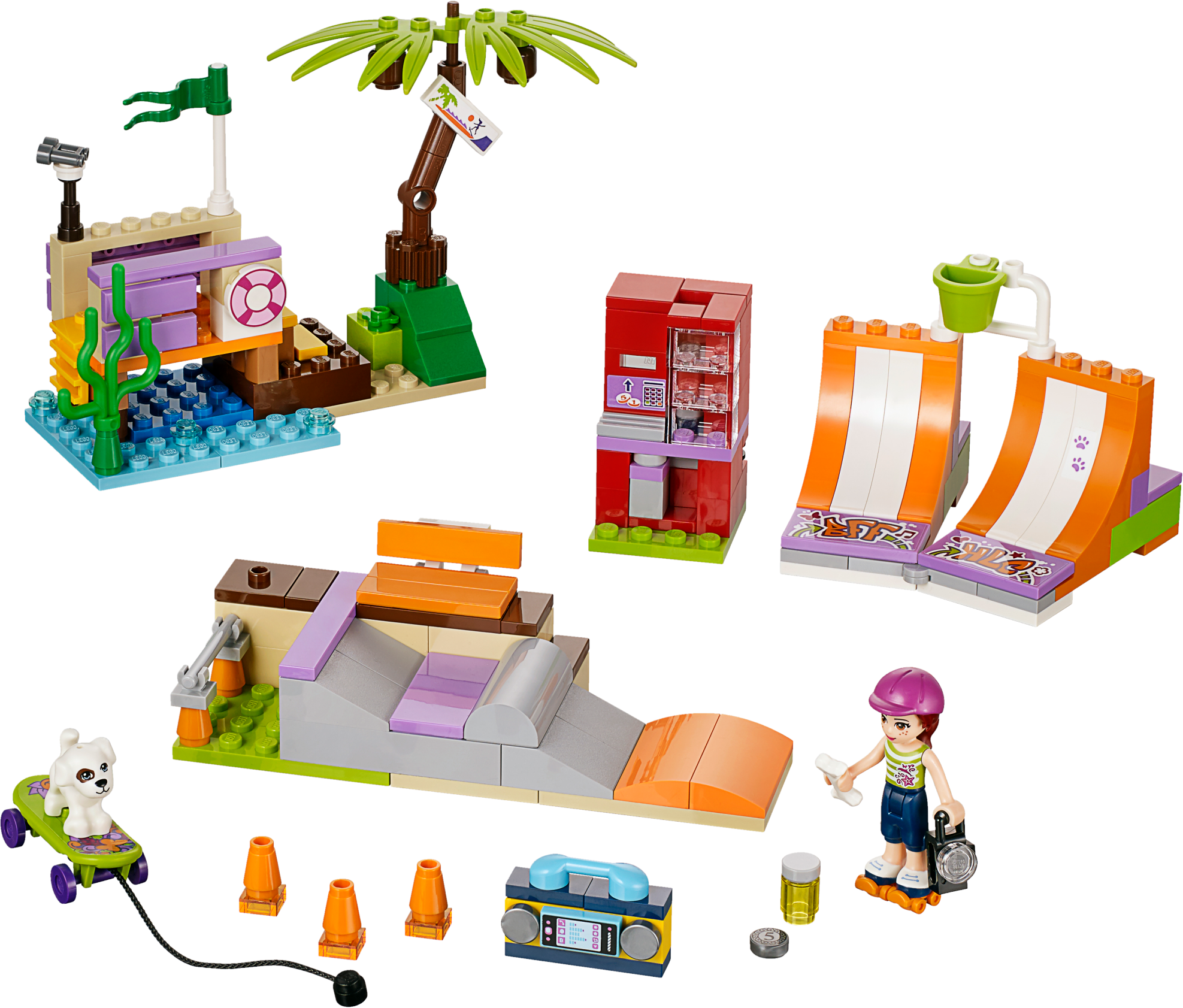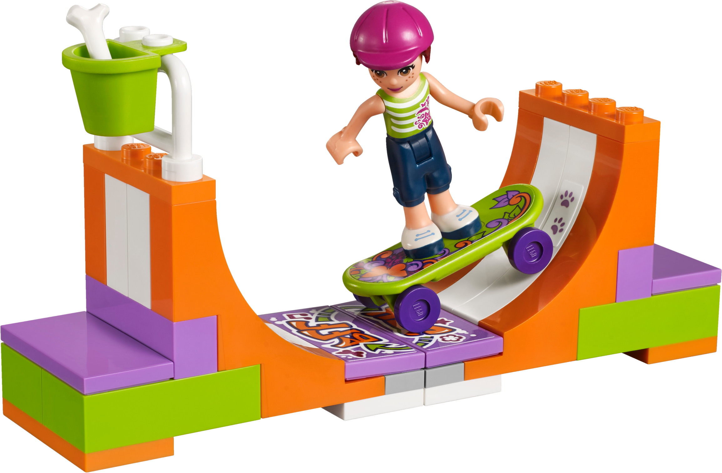 Show off some cool skating moves with Mia and her dog at the Heartlake Skate Park! Grab your board and head to the Skate Park with Mia and her dog Charlie! Practice all the latest tricks on the half pipe and play your favorite tunes on the stereo. Grab a cold drink from the vending machine while you take a break and teach Charlie to skate on the ramp before rewarding him with a nice juicy bone. What a cool pup! At the end of an awesome session, switch Mia’s board for rollerblades so she can skate away pulling her dog on the skateboard. Includes a Mia mini-doll figure plus a dog. Includes a Mia mini-doll figure plus a dog Skate Park features a modular half pipe, sliding ramp, functioning vending machine element and a beachside pier Accessory elements include a skateboard, rollerblades, helmet, slalom cones, stereo, cans, coin, palm tree, camera, binoculars, bone, bucket and a leash Put Charlie on the skateboard and pull him along! Transform the half pipe to practice different moves Have fun with the camera as Charlie slides down the ramp Push the button to get a refreshing drink at the vending machine Half pipe measures over 1” (4cm) high, 4” (12cm) wide and 1” (3cm) deep Ramp measures over 4” (12cm) wide, 1” (4cm) deep and under 1” (2cm) high Pier measures over 1” (4cm) high, 2” (6cm) wide and under 1” (2cm) deep