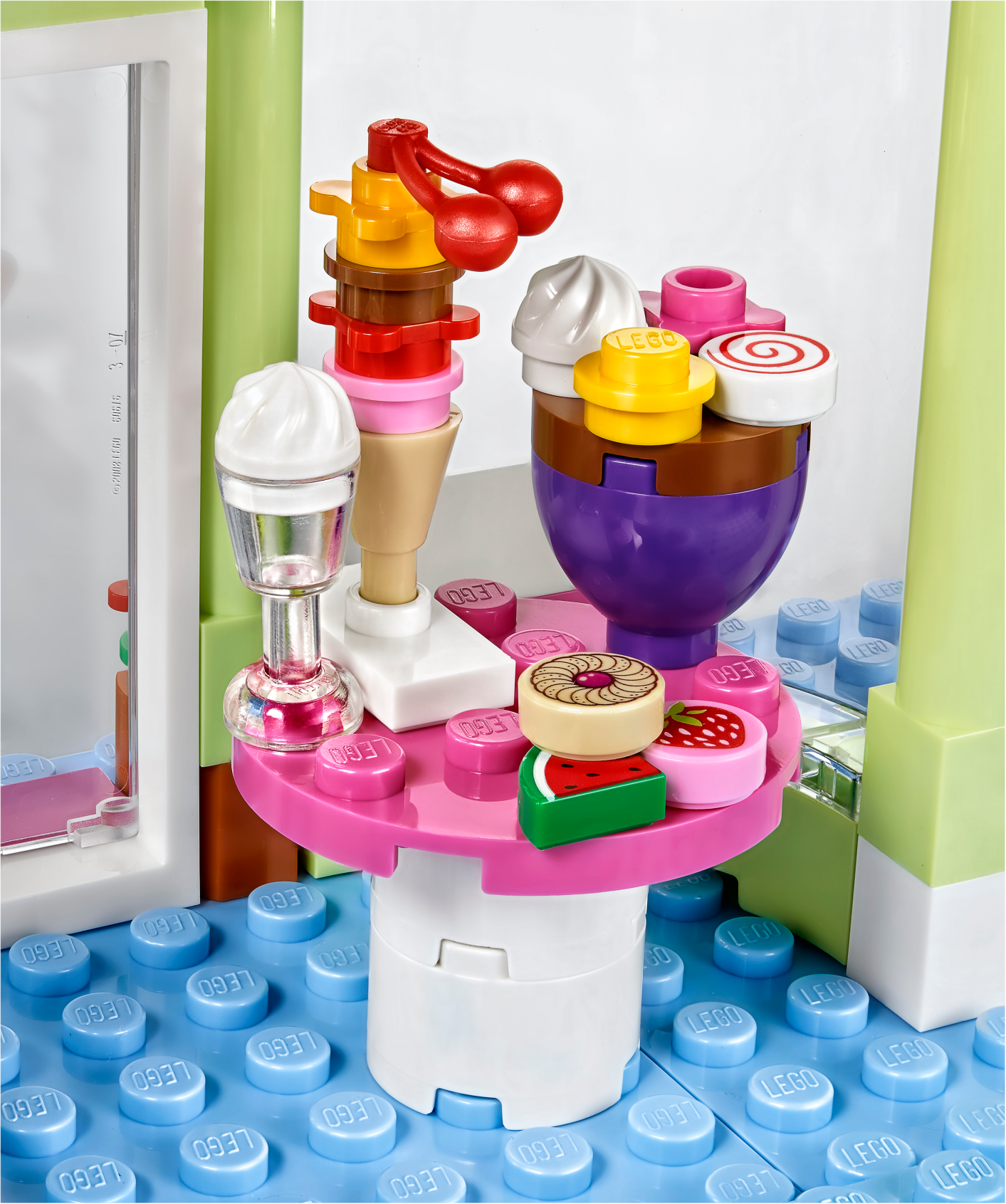 The LEGO® Friends Heartlake Frozen Yogurt Shop comes with a frozen yogurt machine with self-serve function, bar with a choice of toppings, weighing scales, phone to take orders, inside seating area and outside table with a parasol. There’s also a drive thru with ordering station and a cool yellow car with room to carry your frozen yogurt on the back. Includes 2 mini-doll figures. Includes Olivia and Julian mini-doll figures. Features a frozen yogurt shop with a self-serve machine, toppings bar, weighing scales, phone, table and chairs, drive thru with ordering point, outside table with parasol and a car. Accessory elements include a range of toppings, sauce bottles, glasses, bowls and cones. Drive with Olivia to the frozen yogurt shop and place your order at the order point. Help Julian run the shop, taking orders over the phone and chatting to customers. Use the machine with self-serve function to serve the frozen yogurt and then choose from all the delicious toppings at the bar. Frozen yogurt shop with drive thru measures over 5” (15cm) high, 11” (28cm) wide and 4” (12cm) deep. Car measures over 1” (3cm) high, 3” (9cm) long and 1” (5cm) wide.