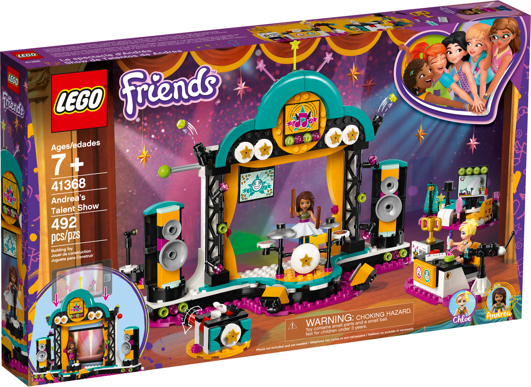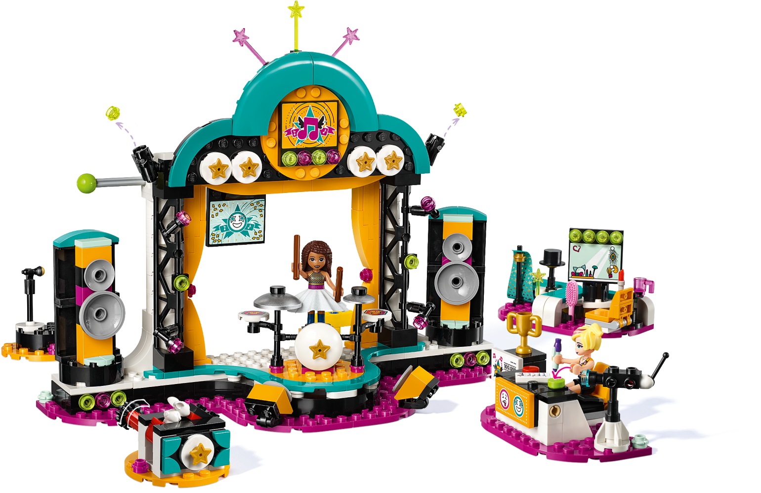 It’s showtime with LEGO® Friends 41368 Andrea’s Talent Show. This set features 3 different rotating stage sets for hours of creative play displaying Andrea’s talents. Get her ready in the dressing room, then on stage, help her sing, play drums or perform magic—twist the knob on the clever box to make a bunny appear! The 2 speakers at the side of the stage rotate to reveal big screens. Enhance the play further by placing your cell phone on the stand and playing a video or music to provide a backdrop for Andrea—2 yellow clips behind the stage secure the device. Help Chloe use the red and green buttons on the judge’s desk to say what she thinks of the talent show acts, and make the flags drop down above the stage to reveal her reaction. Then use the firework functions to celebrate the results of the LEGO talent show. Includes 2 mini-doll figures: Andrea and Chloe, plus a rabbit figure. Includes 2 mini-doll figures: Andrea and LEGO Friends Chloe, plus a rabbit figure. Features a main stage with rotating speakers, plus 3 separate rotating mini sets, 2 backstage areas, a judging panel with flag functions and voting button, a stand to attach a cell phone, fireworks function and a magician's box. Accessory elements include toy microphone, magic trick set, camera, hairbrush, lipstick, cup, cell phone stand and a fabric skirt for Andrea to change in to. Magician accessory elements include magician’s cape, magic card, hat, wand and toy rabbit. Change rotating sets so Andrea can sing, do magic and play her toy drum kit, allowing her to display her many performing talents. Take Andrea backstage to help her get ready for her big night in her fabric skirt or magician's cape! Pull out the flags to give a thumbs-up, then set off the fireworks! Stand your cell phone behind the stage to add amazing backdrops or songs. LEGO® Friends sets encourage creative play, and make building imaginative and fun. Connect the circular base from 41383 Olivia’s Hamster Playground to the stage to add a motorbike-riding hamster act to the talent show. Measures over 8” (21cm) high, 9” (25cm) wide and 5” (14cm) deep.