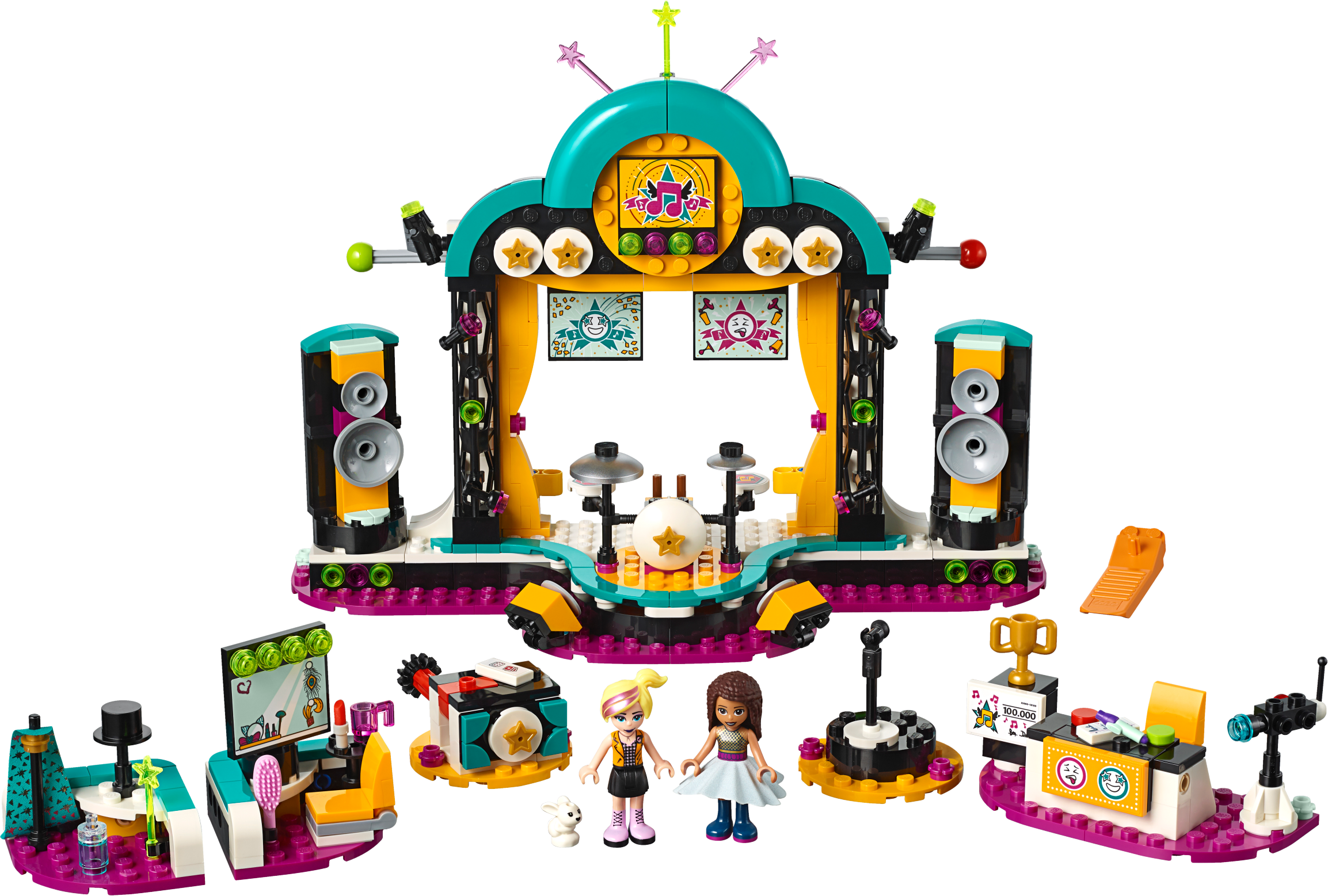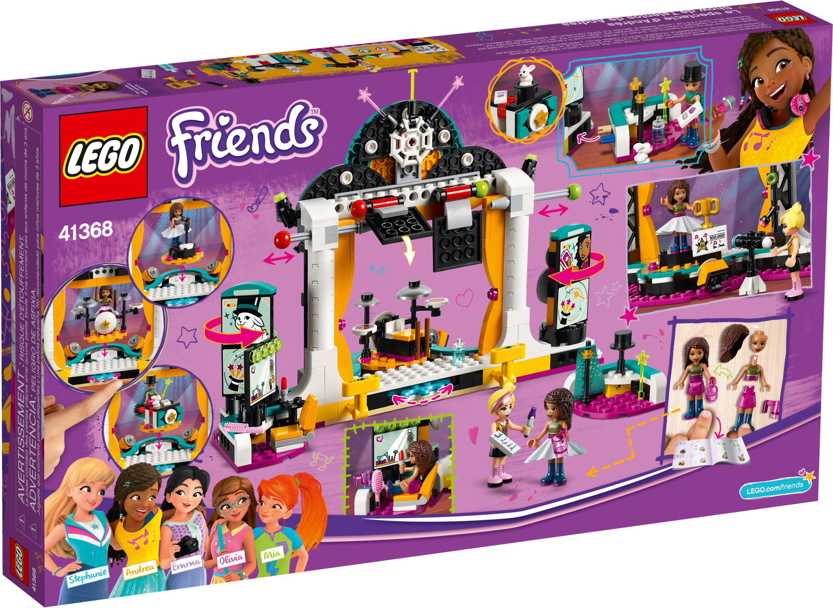 It’s showtime with LEGO® Friends 41368 Andrea’s Talent Show. This set features 3 different rotating stage sets for hours of creative play displaying Andrea’s talents. Get her ready in the dressing room, then on stage, help her sing, play drums or perform magic—twist the knob on the clever box to make a bunny appear! The 2 speakers at the side of the stage rotate to reveal big screens. Enhance the play further by placing your cell phone on the stand and playing a video or music to provide a backdrop for Andrea—2 yellow clips behind the stage secure the device. Help Chloe use the red and green buttons on the judge’s desk to say what she thinks of the talent show acts, and make the flags drop down above the stage to reveal her reaction. Then use the firework functions to celebrate the results of the LEGO talent show. Includes 2 mini-doll figures: Andrea and Chloe, plus a rabbit figure. Includes 2 mini-doll figures: Andrea and LEGO Friends Chloe, plus a rabbit figure. Features a main stage with rotating speakers, plus 3 separate rotating mini sets, 2 backstage areas, a judging panel with flag functions and voting button, a stand to attach a cell phone, fireworks function and a magician's box. Accessory elements include toy microphone, magic trick set, camera, hairbrush, lipstick, cup, cell phone stand and a fabric skirt for Andrea to change in to. Magician accessory elements include magician’s cape, magic card, hat, wand and toy rabbit. Change rotating sets so Andrea can sing, do magic and play her toy drum kit, allowing her to display her many performing talents. Take Andrea backstage to help her get ready for her big night in her fabric skirt or magician's cape! Pull out the flags to give a thumbs-up, then set off the fireworks! Stand your cell phone behind the stage to add amazing backdrops or songs. LEGO® Friends sets encourage creative play, and make building imaginative and fun. Connect the circular base from 41383 Olivia’s Hamster Playground to the stage to add a motorbike-riding hamster act to the talent show. Measures over 8” (21cm) high, 9” (25cm) wide and 5” (14cm) deep.