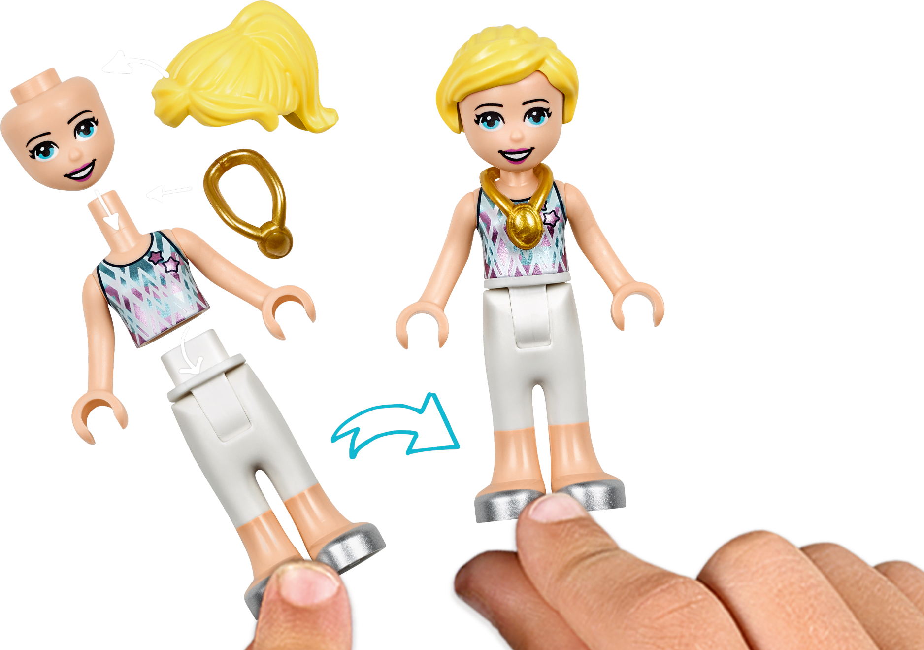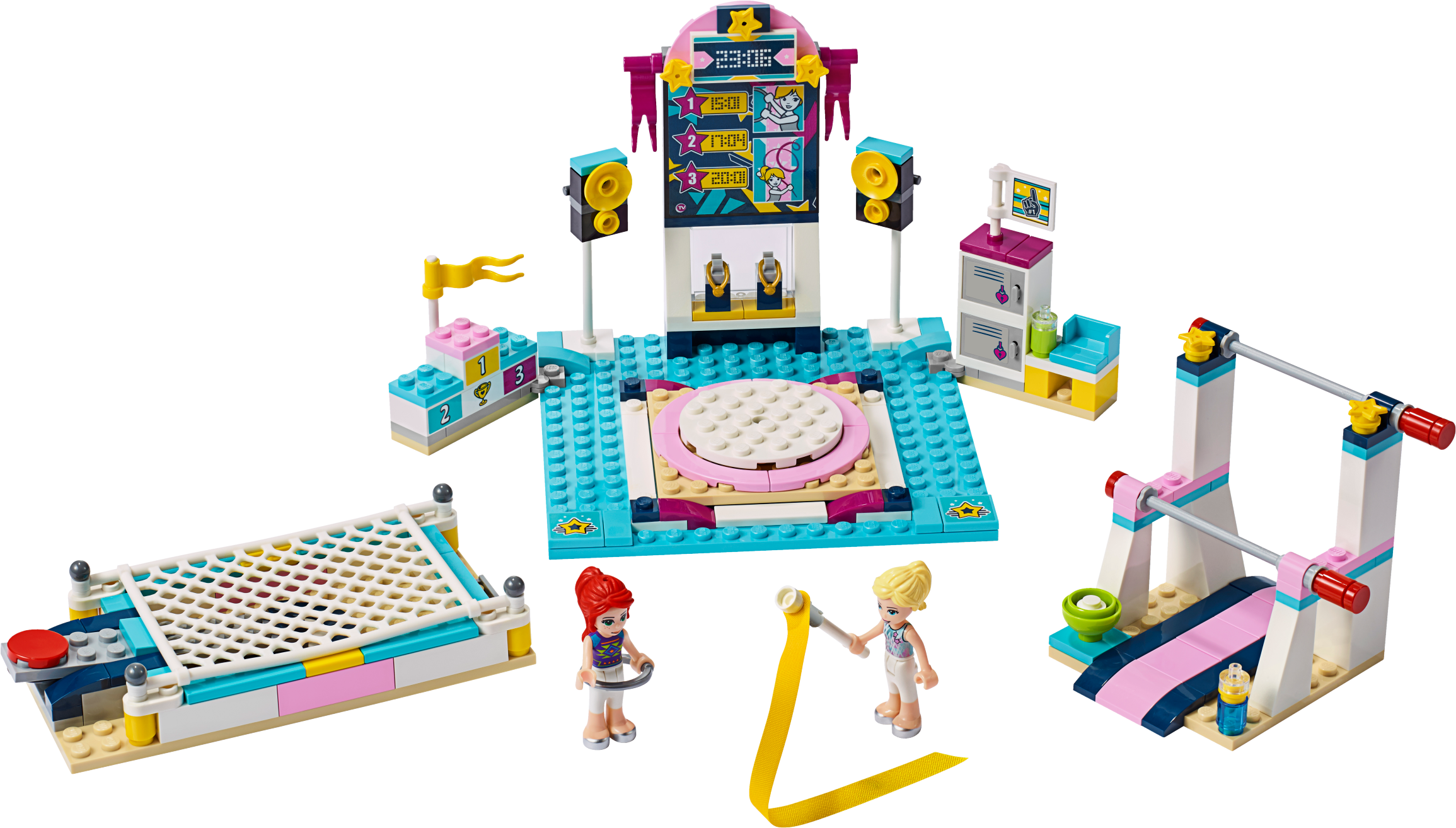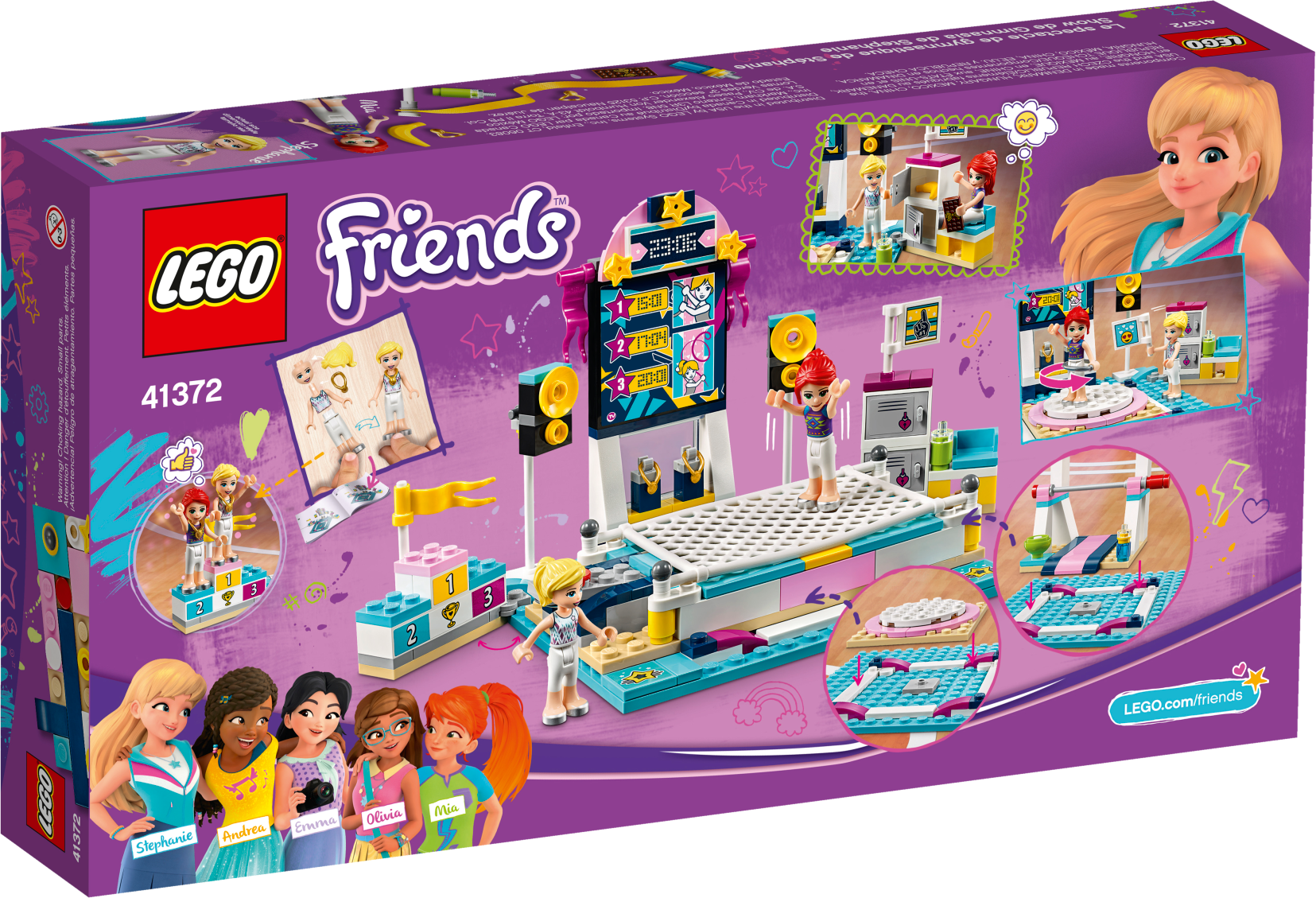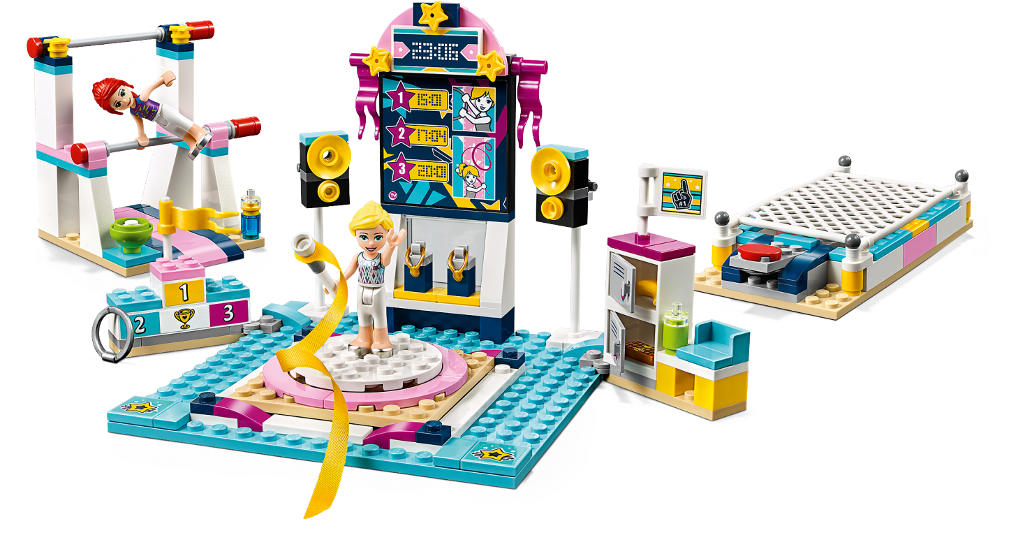 It’s competition time with LEGO® Friends 41372 Stephanie’s Gymnastics Show. Give the gift of endless fun with this multi-event LEGO gymnastics arena. This creative building set for kids features 3 disciplines: the trampoline, parallel bars and floor, each of which can be fixed to the main stage when it's performance time. The trampoline has a cool ‘jump' function button—press it to launch the girls into the air. They can perform even more aerial acrobatics on the parallel bars—each bar spins to send the gymnasts wheeling round. There is a different piece of kit for each girl’s floor routine—a ribbon and a hoop. A revolving platform allows the crowd to see the competitors from every angle. They can then go back to the locker room to refuel and await the results before collecting their medals on the podium! Give any LEGO builder an amazing building experience with Instructions PLUS, available in the LEGO Life app for smartphones and tablets. The easy-to-use, intuitive building instructions let them zoom, rotate and visualize their creation using the special ghost mode as they go. Instructions PLUS is also great for younger builders, guiding them through the building process for a greater sense of independence and achievement. This construction set includes 2 mini-doll figures and makes for hours of imaginative play. Gymnastics toy includes 2 mini-doll figures: Stephanie and Mia. Features various gymnastic equipment and a main stage with a rotating platform, speakers, leaderboard with sticker decorations, podium and a locker room. Gymnastic equipment includes a trampoline playset with jumping function and spinning parallel bars. Accessory elements include a ribbon on a stick, hoop, chalk bowl, 2 golden medals, 2 water bottles, chocolate bar and a banana. Main stage rotates so gymnasts' moves can be seen from all angles. Kids can interchange the gymnastic equipment on the main stage, depending on which event is being performed. Trampoline’s press-button function launches the competitors into the air. Let your budding gymnast imagine what it's like to be awarded a medal on the podium. Use the LEGO® Life app to access the intuitive Instructions PLUS building instructions. Help even younger builders through the building process, with easy-to-use zoom, rotate and ghost-mode functions to visualize their creations as they go. LEGO® Friends sets encourage imaginative play, and make building creative and fun. Makes an ideal Christmas gift or gift for the holiday season for creative kids. This set is part of the LEGO® Friends world of everyday heroes and exciting real-world scenarios. Main LEGO® gymnastics stage measures over 4” (12cm) high, 4” (12cm) wide and 4” (12cm) deep. Trampoline measures over 2” (6cm) wide and 4” (12cm) deep. Parallel bars measure over 3” (8cm) high, 2” (6cm) wide and 3” (8cm) deep.