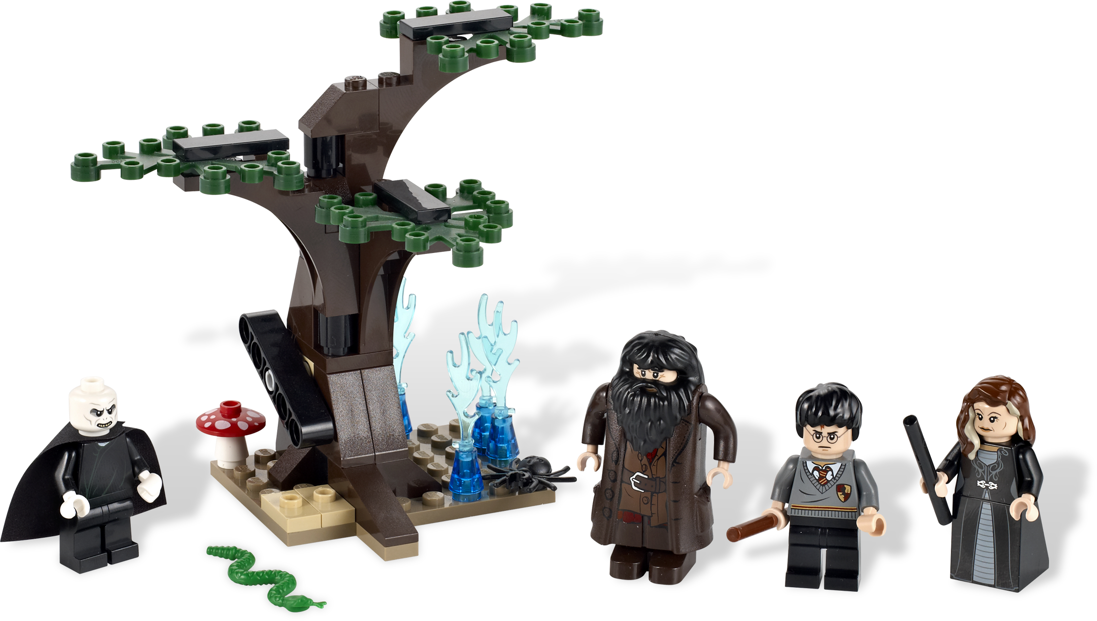 Help Harry Potter™ face Lord Voldemort™ in the Forbidden Forest! In Forbidden Forest, Lord Voldemort and his followers have captured Hagrid and tied him to a tree. When Harry Potter enters the Forbidden Forest to face his destiny, Lord Voldemort attacks. Will Lord Voldemort defeat Harry Potter once and for all? Will Narcissa Malfoy betray the Dark Lord?Includes 4 minifigures: Harry Potter, Lord Voldemort, Hagrid and Narcissa MalfoyAccessories include wands, snake, mushroom and spiderMeasures 5” (12cm) wide and 4” (10cm) tall.
