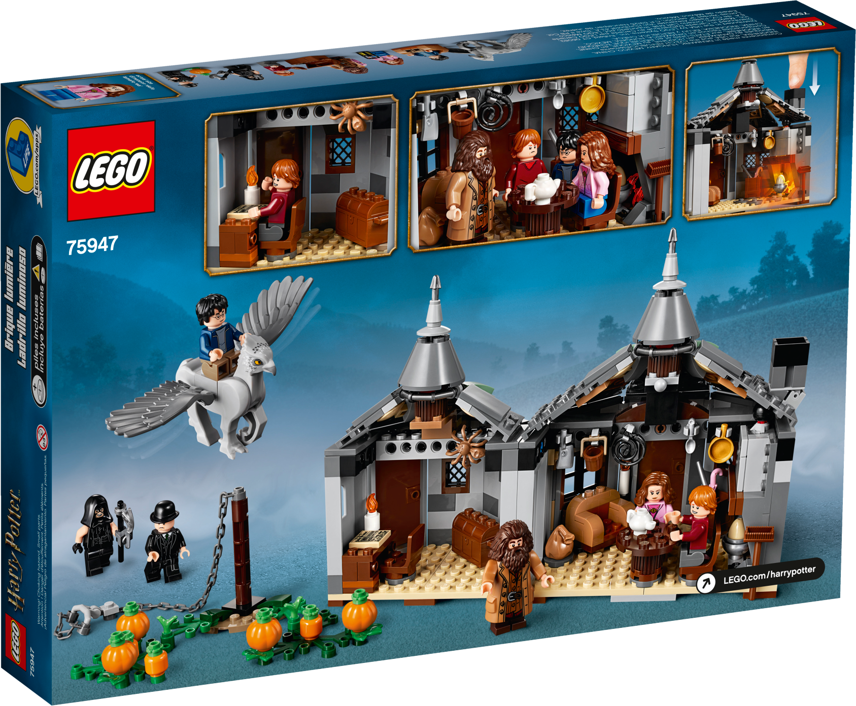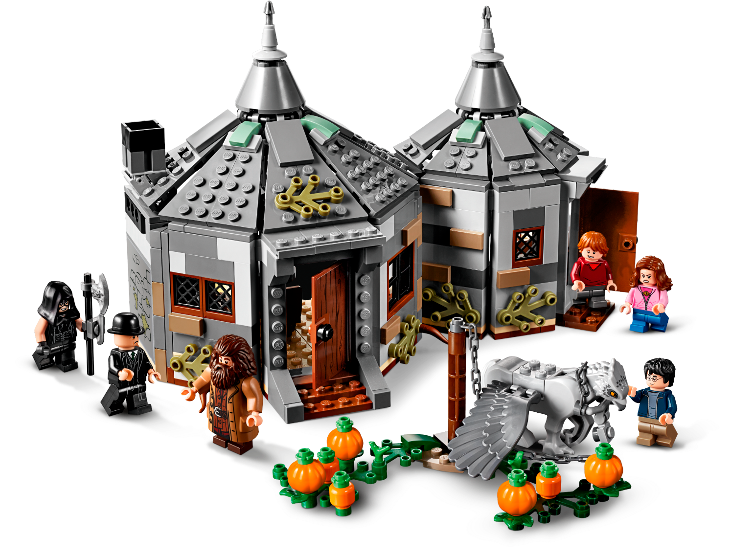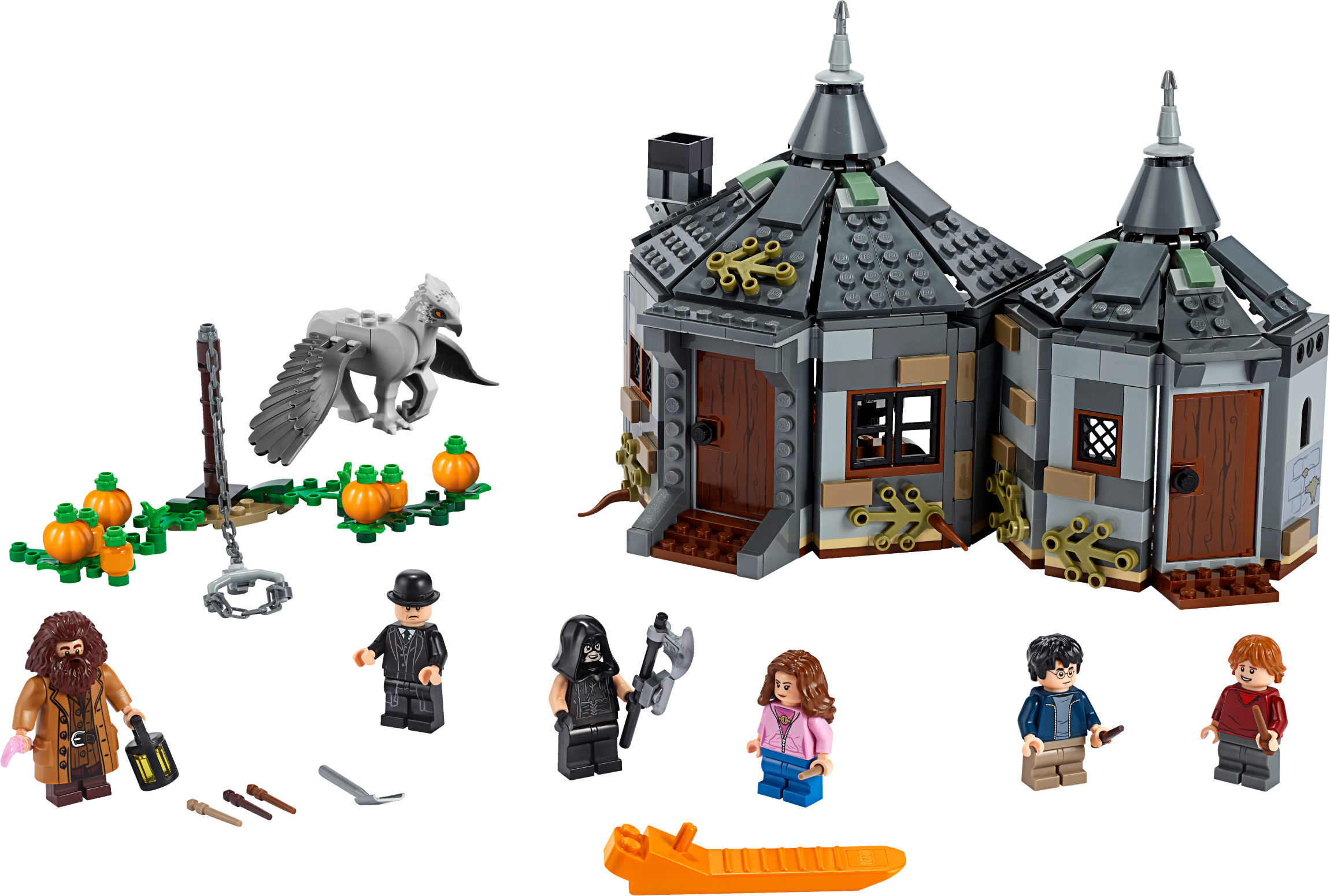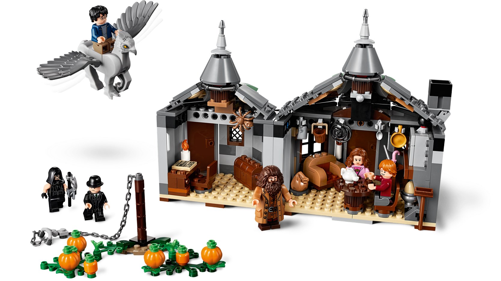 Includes 6 LEGO® Harry Potter™ minifigures: Hagrid™ and new-for-June-2019 Harry Potter, Ron Weasley™, Hermione Granger™, Executioner and the Minister of Magic plus a Buckbeak™ the Hippogriff figure with moveable wings and head, restrained by a removable chain. This LEGO® Harry Potter™ set features Hagrid's 2-section buildable woodland hut with pumpkin patch outside. LEGO® Hagrid´s Hut's desk room includes a desk with chair, candle, chest, chocolate frog, Daily Prophet newspaper and a spider. LEGO® Hagrid´s Hut’s main room includes a table with 2 chairs, buildable armchair, chimney with light brick, egg in a bowl, bag, display case, Hagrid’s pink umbrella, shovel, teapot, spoon, pan, meat cleaver, lasso, broom and a bucket. Also includes pumpkins, lantern, axe, 3 wands, the Minister of Magic's hat and a removable chain for Buckbeak™. LEGO® Hagrid´s Hut measures over 6” (16cm) high, 9” (23cm) wide and 4” (12cm) deep. Buckbeak™ figure with wings open measures over 1” (5cm) high, 2” (7cm) long and 4” (12cm) wide.