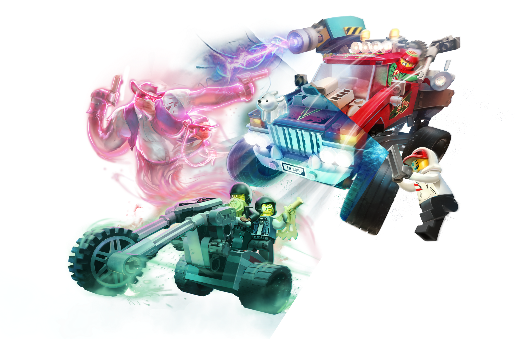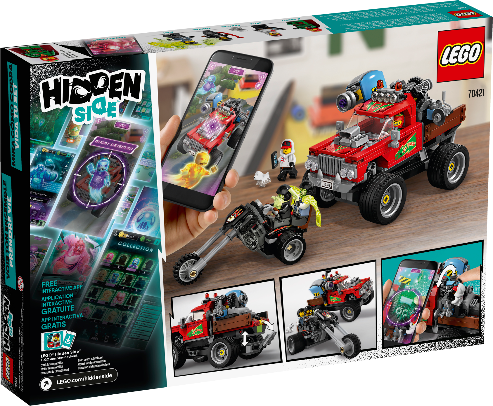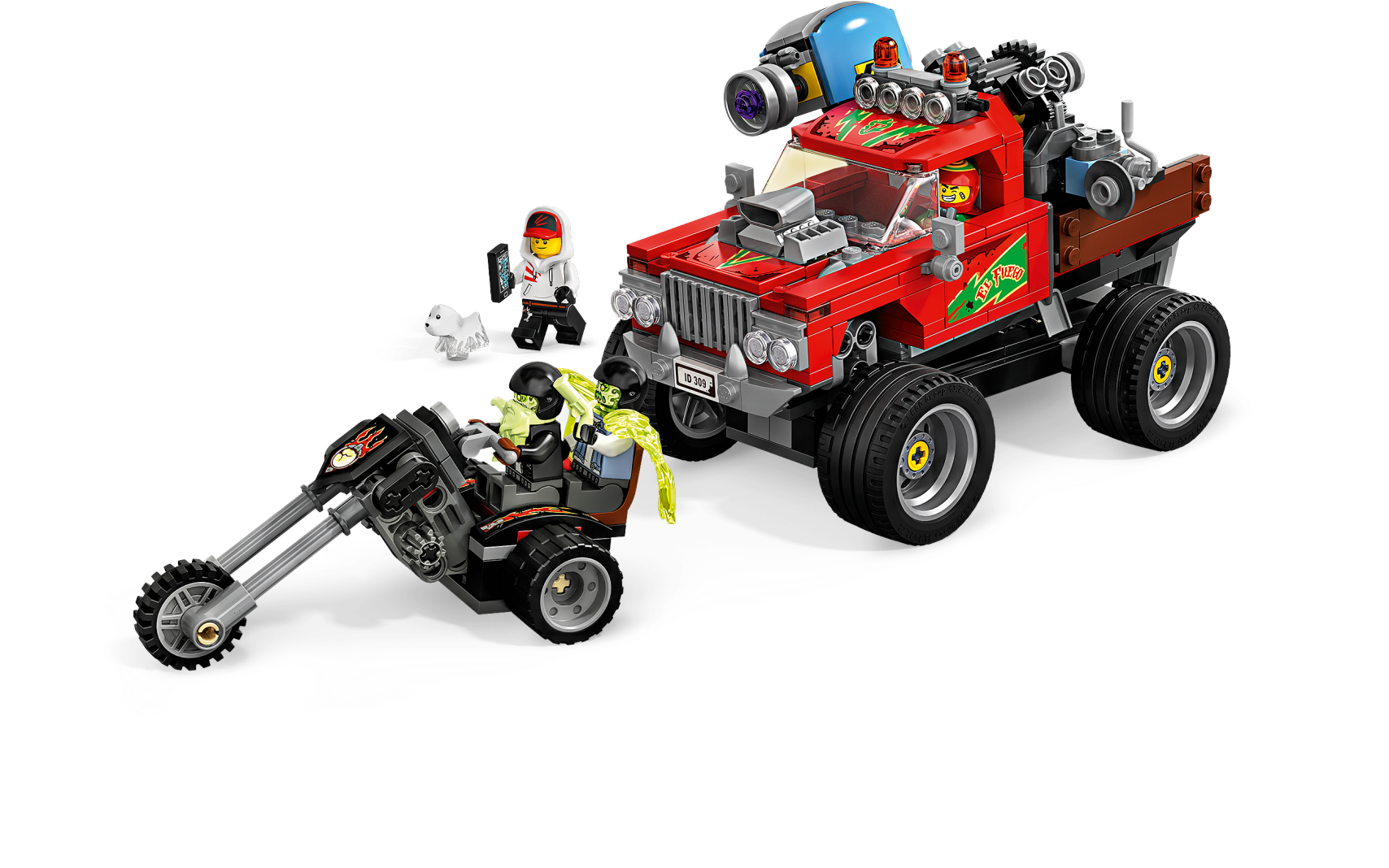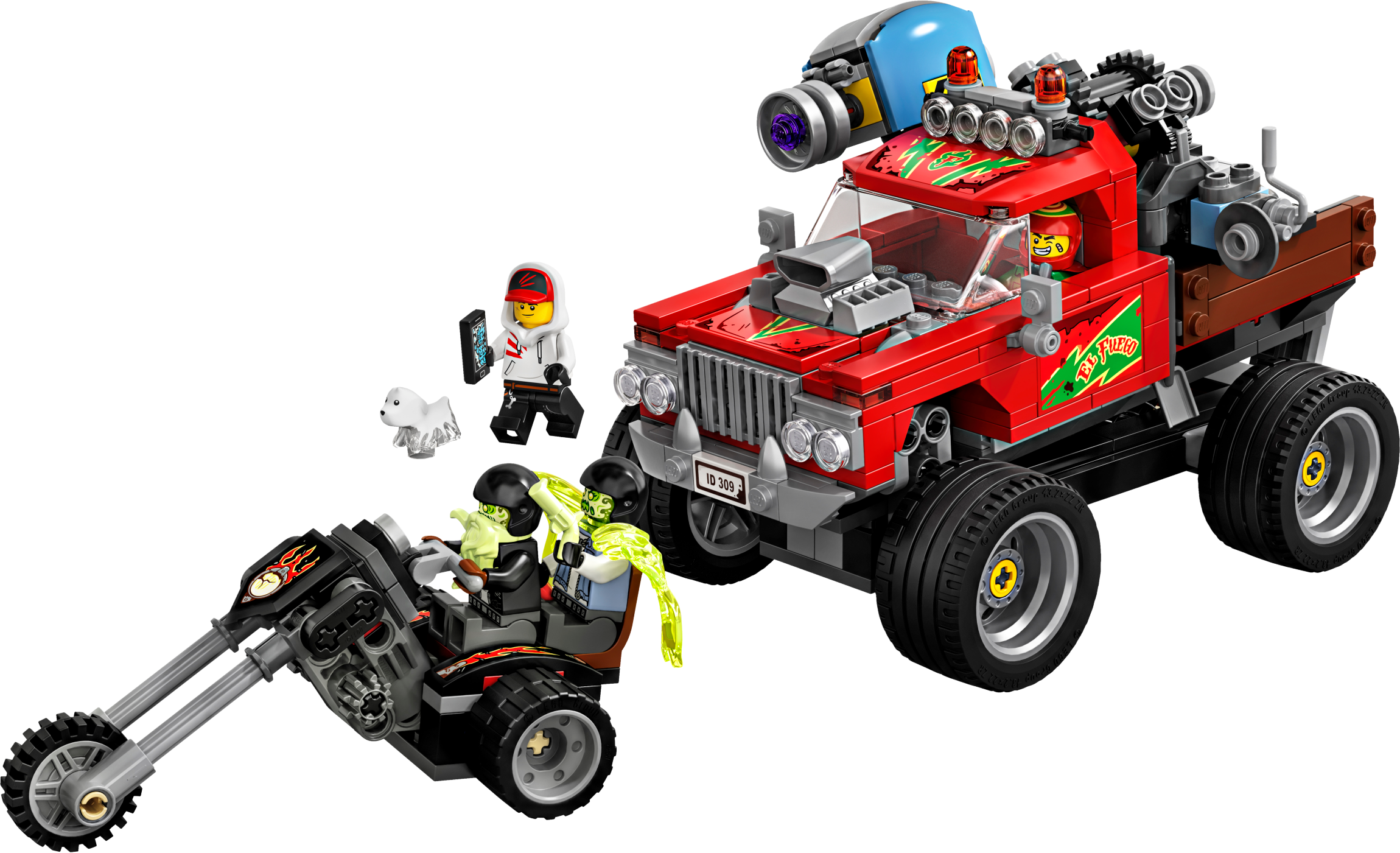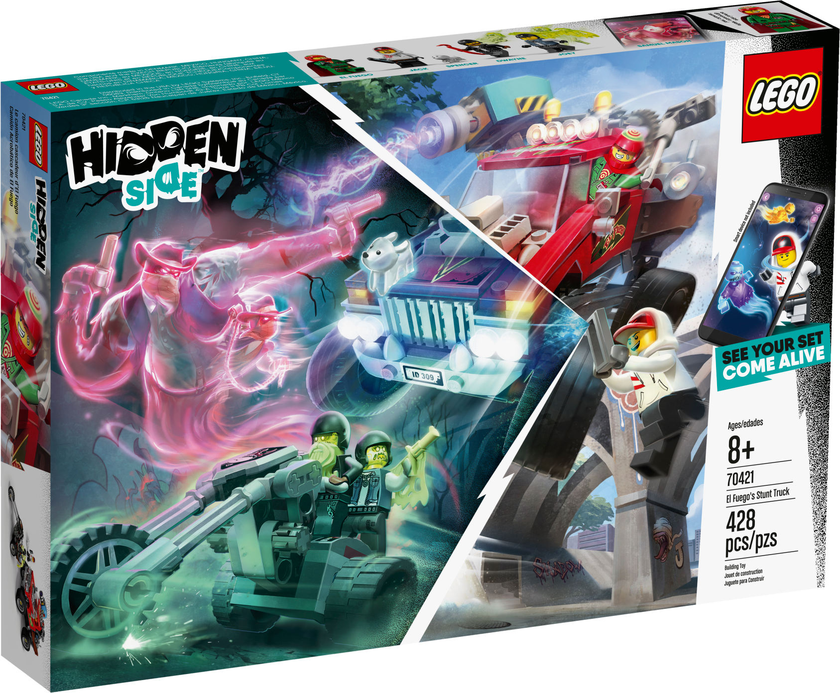 Kids can experience an exciting way to play with the LEGO® Hidden Side™ 70421 El Fuego’s Stunt Truck playset that combines a unique augmented reality play experience. Download the Hidden Side app and scan the model with a phone to make the awesome LEGO model come alive in the app. Interacting with the model in the real world makes things happen in the app. With continuous updates, a unique boss ghost to battle in each set, new mysteries to solve, cool items to find, games to play and ghosts to collect, this LEGO Hidden Side set offers kids a whole new way to play and interact with building bricks! El Fuego’s truck has working rear suspension, so kids can try cool stunts and jumps. Or they can join hero Jack Davids and his ghost dog figure, Spencer, on the back of the truck, using the toy cannon to de-haunt the two bikers riding on their 3-wheel motorcycle chopper. There's simply no limit to the creative play possibilities. Download the LEGO® Hidden Side™ app and point your phone at El Fuego’s Stunt Truck to make it come alive. Move the phone around to discover an ever-changing environment hidden around the model. This El Fuego’s Stunt Truck augmented reality toy includes 4 minifigures: hero Jack Davids and stuntman El Fuego, male biker Dwayne and female biker Joey, plus Davids's ghost dog figure, Spencer, to role-play as ghost catchers in this monster truck toy and in the AR app. This unique toy features a stunt truck with rear suspension, space for 2 minifigures in the cabin and a rear-mounted toy cannon, plus an awesome 3-wheel motorcycle chopper with space for 2 minifigures. Set in the fictional town of Newbury, where ghosts haunt people and buildings, LEGO® Hidden Side™ playsets let kids play out exciting ghost-hunting adventures that combine physical LEGO models with fully-interactive augmented reality. Build and play with the physical set and then bring it to life as you interact with the set while viewing it through the app. Using the LEGO® Hidden Side™ app is like looking through a window to a cool and spooky Hidden Side filled with challenging mysteries to solve, ghosts to defeat and unique ghost bosses, like Samuel Mason, to overcome in each set. To get the full augmented reality experience, a tablet or mobile phone is required, but not included. Compatible with selected iOS and Android devices. Check compatibility at www.LEGO.com/devicecheck. Children should ask permission before going online. El Fuego’s Stunt truck measures over 3” (10cm) high, 3” (10cm) wide and 6” (17cm) long.