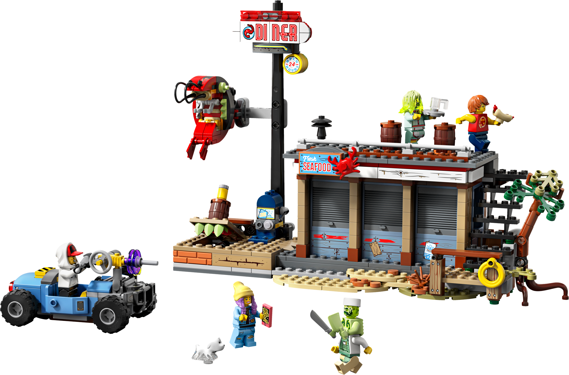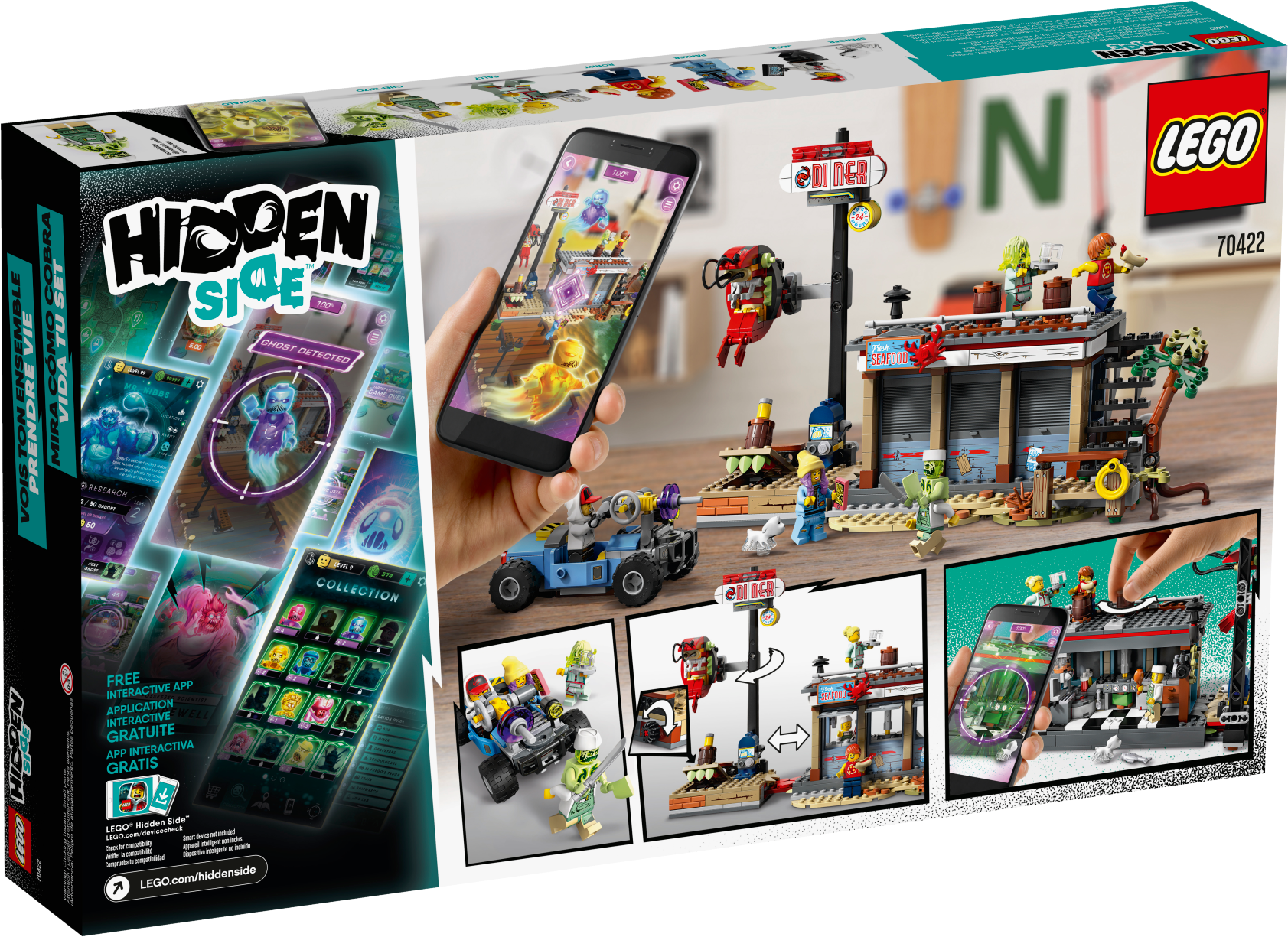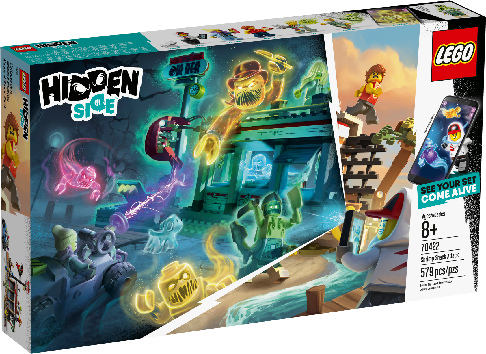 Immerse kids in fun ghost-hunting adventures with the LEGO® Hidden Side™ 70422 Shrimp Shack Attack playset. This awesome toy construction set combines a buildable LEGO model with a fully interactive play experience. Download the Hidden Side app and scan the model with a phone to make it come alive. With continuous updates, a unique boss ghost to battle in each set, new mysteries to solve, cool items to find, games to play and ghosts to collect, this LEGO Hidden Side set gives kids a whole new way to play and interact with building bricks! This building toy for kids is full of cool details to kick-start hours of imaginative play. The shrimp sign can pull away from the shack and change from normal to haunted. The two hero minifigures, each with his and her own smartphone, a haunted head chef and server, plus shack guest and cute ghost dog figure inspire role-play fun. And the kitchen becomes fully interactive when viewed through the Hidden Side app. Download the LEGO® Hidden Side™ app and point your phone at the Shrimp Shack Attack model to make this building set for kids come alive. Move the phone around to discover an ever-changing environment hidden around the model. This augmented reality toy includes 6 figures: Jack Davids with smartphone and girl minifigure Parker L. Jackson with smartphone, Chef Enzo with two knives, Sally with tray and cup, Ronny, and Davids's ghost dog figure, Spencer. This unique toy features a cool go-kart with space for 2 minifigures, a highly detailed shrimp shack kitchen and a large shrimp sign that pulls away from the shack and changes into a haunted sign. Set in the fictional town of Newbury, where ghosts haunt people and buildings, LEGO® Hidden Side™ playsets let kids play out exciting ghost-hunting adventures that combine physical LEGO models with fully-interactive augmented reality. Build and play with the physical set and then bring it to life as you interact with the set while viewing it through the app. Using the LEGO® Hidden Side™ app is like looking through a window to a cool and spooky Hidden Side filled with challenging mysteries to solve, ghosts to defeat and unique ghost bosses, like Anomalo, to overcome in each set. To get the full augmented reality experience, a tablet or mobile phone is required, but not included. Compatible with selected iOS and Android devices. Check compatibility at www.LEGO.com/devicecheck. Children should ask permission before going online. Shrimp Shack Attack measures over 7” (19cm) high, 12” (32cm) wide and 3” (10cm) deep when haunted.