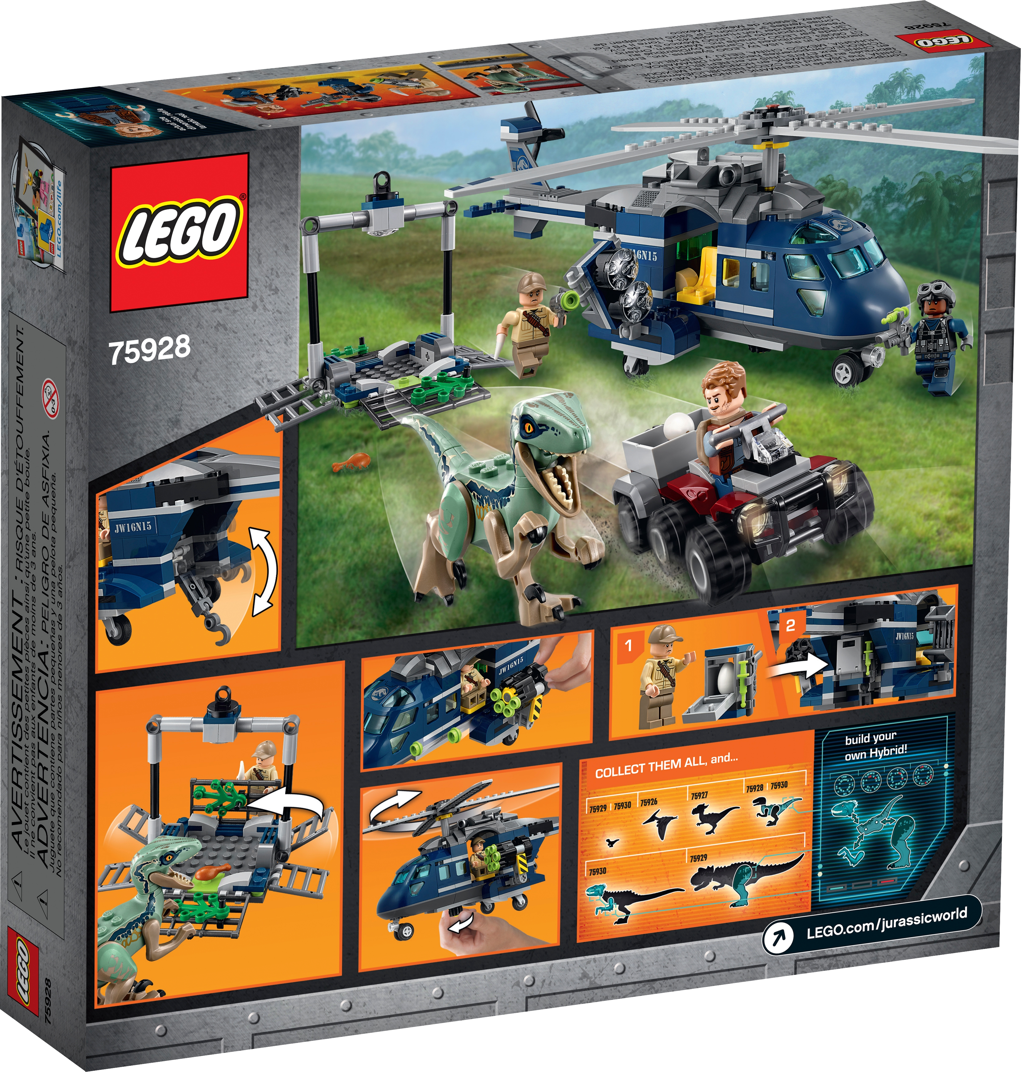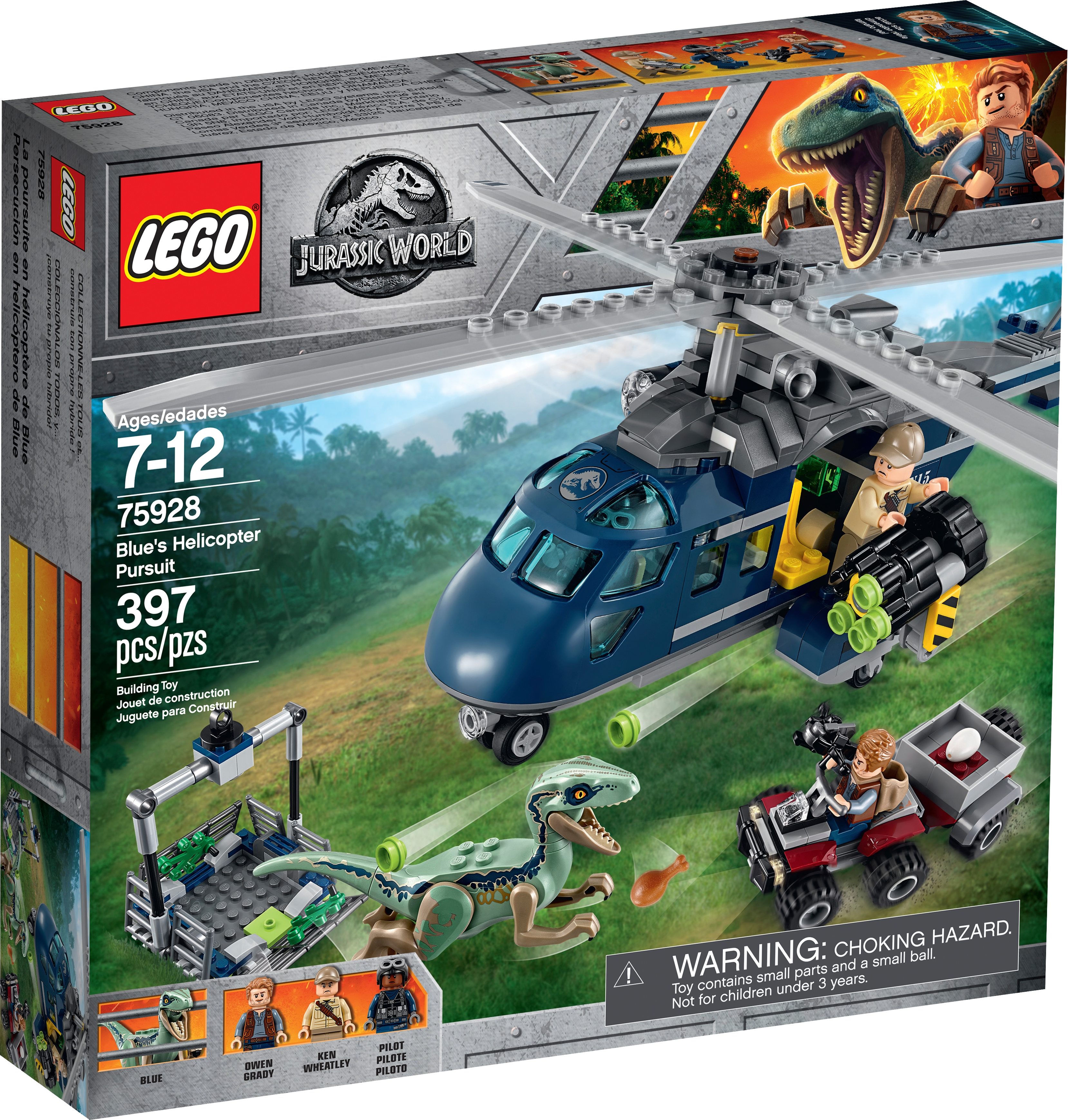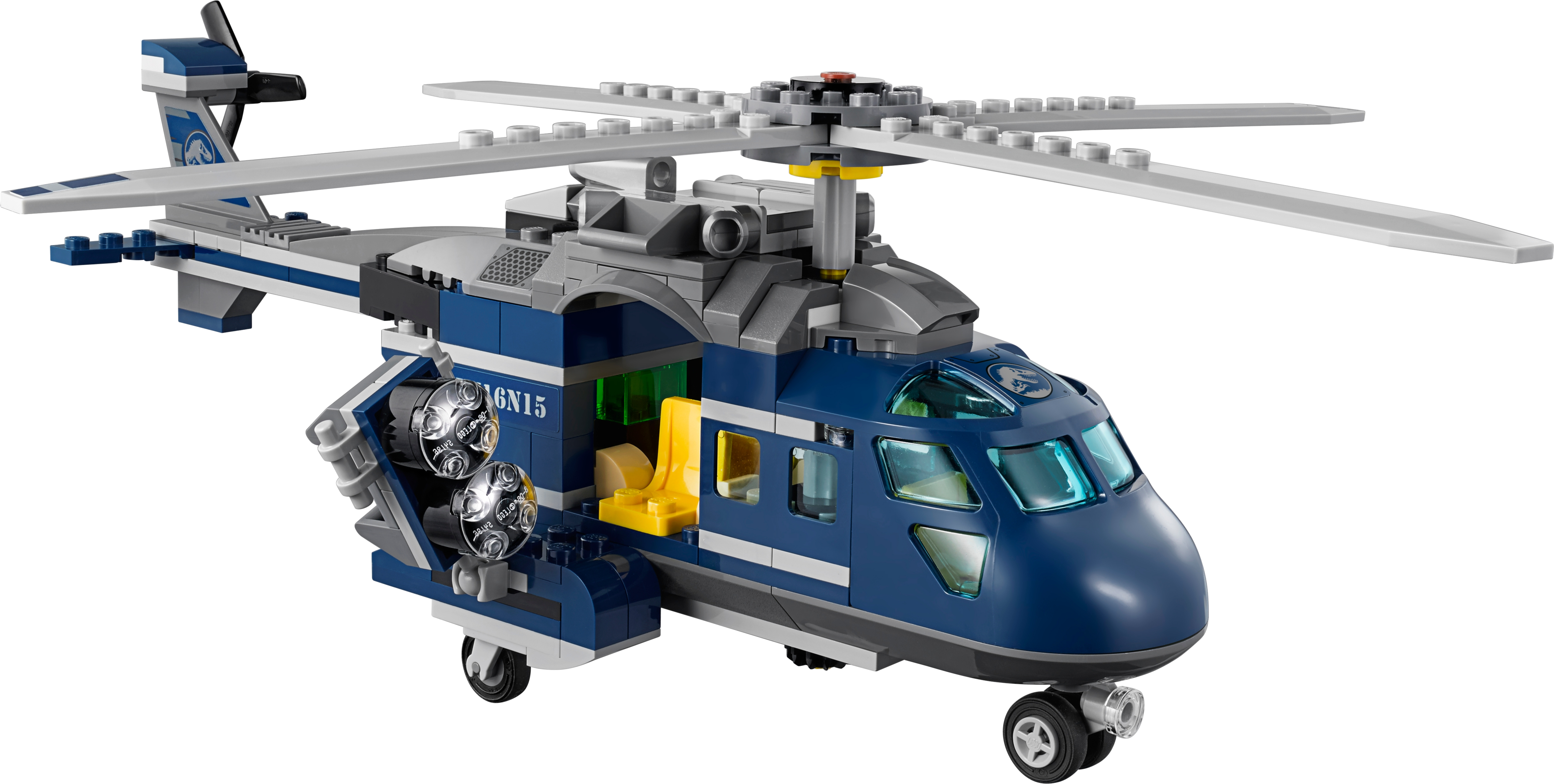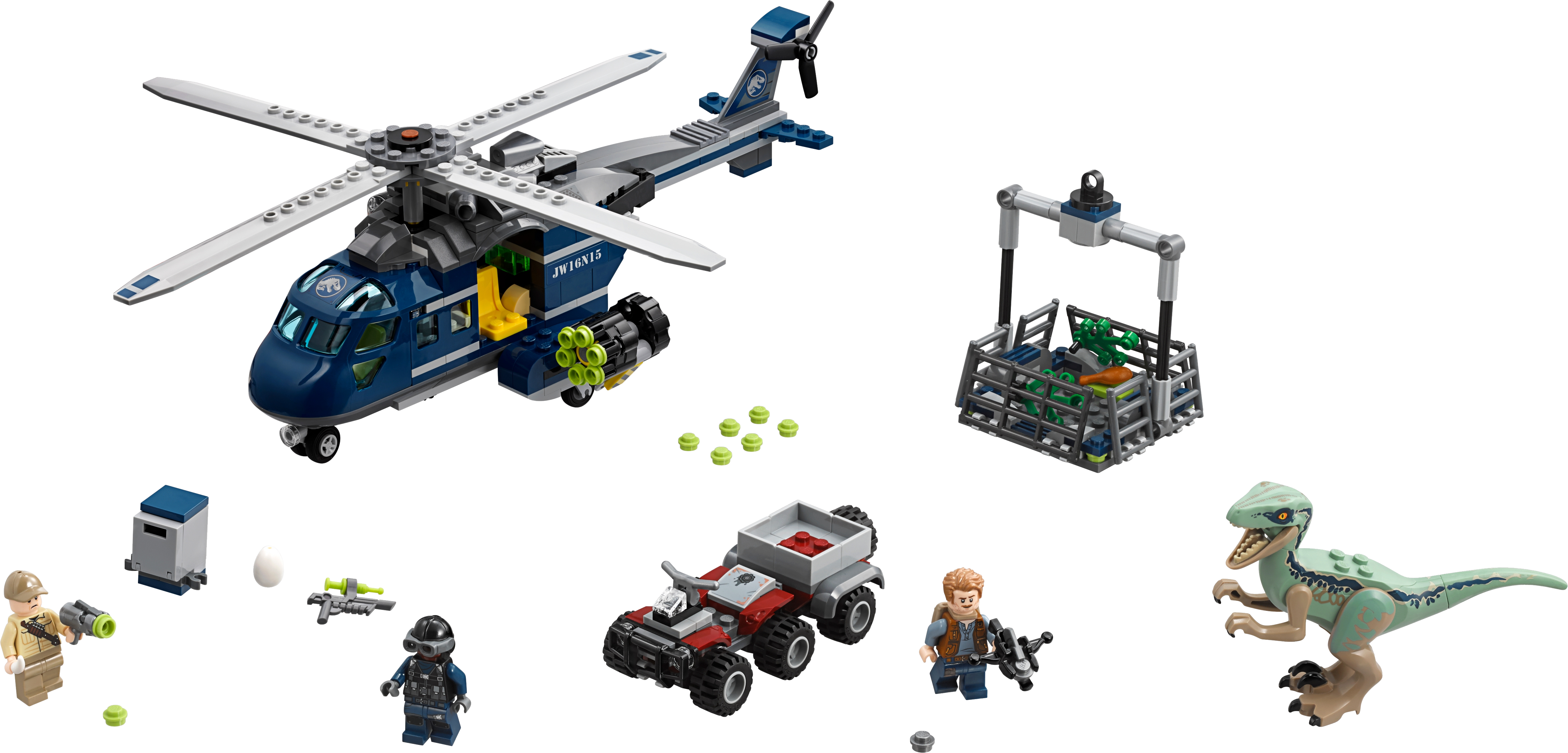 Unite Owen with the faithful Velociraptor in this thrilling Blue’s Helicopter Rescue set, inspired by Jurassic World™. Wheatley has trapped Blue in a cage and attached it to his helicopter, featuring rotating blades, 6-stud shooter and dual searchlights. Set off in the quad bike with trailer and fire the crossbow, rescue the dinosaur and retrieve the dinosaur eggs. This cool toy for kids includes 3 minifigures and a Velociraptor figure. Includes 3 minifigures: Owen, Wheatley and a pilot, plus a Blue the Velociraptor figure. Features an open-door helicopter with rotating blades, belly hook, 6-stud shooter, dual searchlights and space for a storage chest, plus a cage with folding sides and frame with attachment for helicopter cable, and a quad bike with a spare tire. Velociraptor features posable limbs and snapping jaws. Turn the handle to set the helicopter blades spinning! Place the Velociraptor in the trap, fold up the sides and then lift it up using the helicopter’s belly hook and fly off. Shoot Owen’s crossbow stud shooter at the helicopter to make it land, then release Blue from the cage and retrieve the stolen dinosaur eggs. Weapons include a tranquilizer gun with a syringe, a handgun stud shooter and a crossbow stud shooter. Accessory elements include Owen's backpack, dinosaur tooth, chicken leg and a dinosaur egg. This cool toy for kids is suitable for ages 7-12. Helicopter measures over 4” (11cm) high, 10” (27cm) long and 7” (20cm) wide. Quad bike with trailer measures over 1” (4cm) high, 3” (10cm) long and 1” (4cm) wide. Trap/cage measures over 3” (10cm) high, 4” (12cm) wide and 4” (12cm) deep when open, and 2” (7cm) wide and 2” (7cm) deep when closed. Velociraptor stands over 2” (7cm) tall.