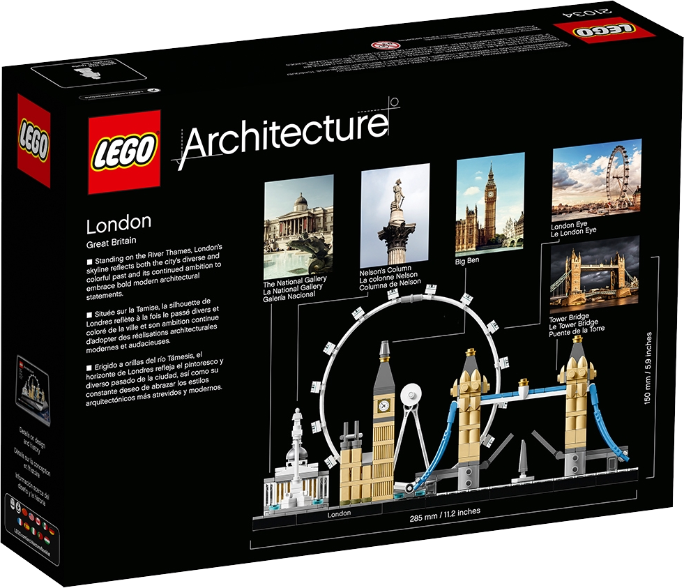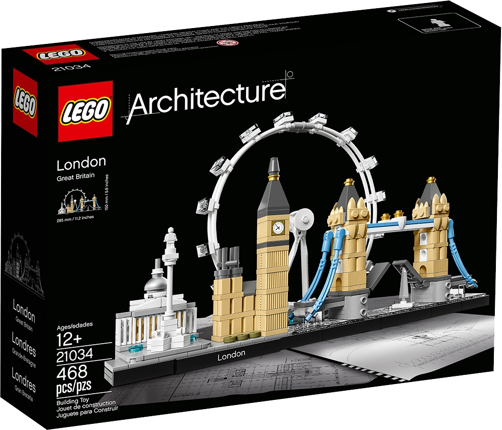 Celebrate the architectural diversity of London with this detailed LEGO® brick model. The LEGO Architecture Skyline Collection offers models suitable for display in the home and office, and has been developed for all with an interest in travel, architectural culture, history and design. Each set is scaled to give an accurate representation of the comparative size of each structure, with true-to-life color depiction. This set features the National Gallery, Nelson’s Column, London Eye, Big Ben (the Elizabeth Tower) and Tower Bridge, and is finished with a decorative “London” nameplate. LEGO® Architecture interpretation of London. Features the National Gallery, Nelson's Column, London Eye, Big Ben (the Elizabeth Tower) and Tower Bridge. London's Thames River is represented by transparent baseplate tiles. Tower Bridge opens to greet the incoming ship. The included booklet contains information about the designer, architecture and history of each building, as well as historical facts about London and its architectural heritage (English language only. Other languagesavailable for download at LEGO.com/architecture). Includes a 4x32 tiled base with a decorative “London” nameplate. Recreate the world's most beautiful cities with the LEGO® Architecture Skyline Collection. LEGO® Architecture celebrates the world of architecture through the medium of the LEGO brick, and is developed for all with an interest in travel, design, architecture and history. This set includes over 460 LEGO® pieces and offers an age-appropriate building experience for ages 12+. Measures over 5” (15cm) high, 11” (28cm) wide and 3” (8cm) deep