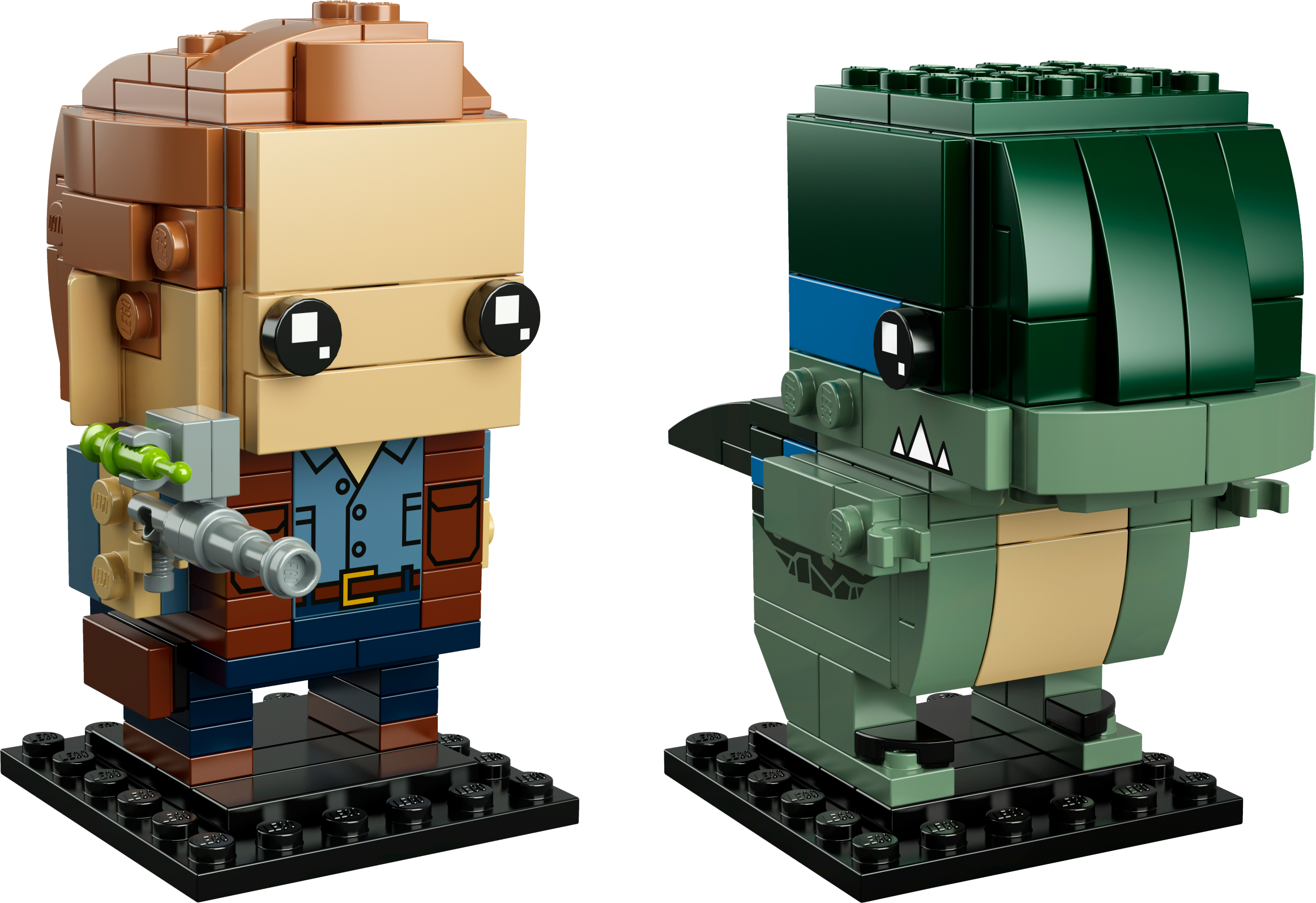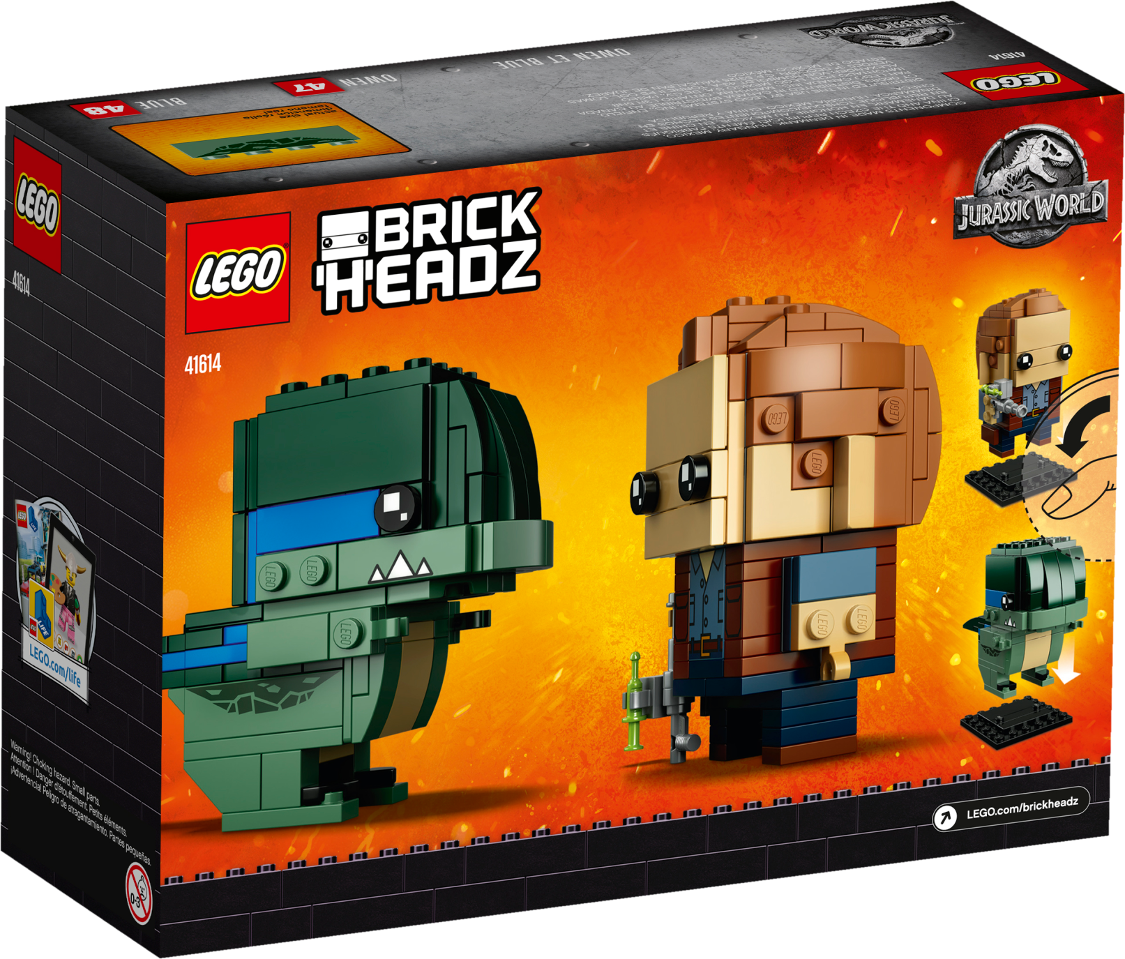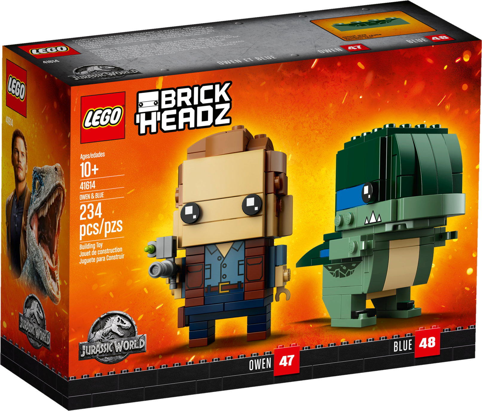 Buildable LEGO® BrickHeadz™ construction characters featuring Owen and Blue have BrickHeadz eyes and authentic details from the blockbuster Jurassic World: Fallen Kingdom movie, including Owen’s tranquilizer gun and velociraptor Blue’s white teeth.