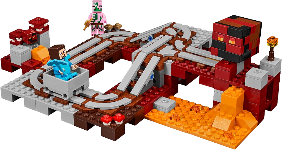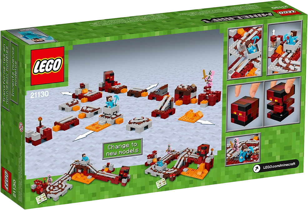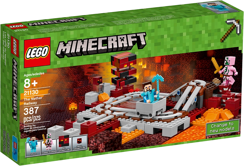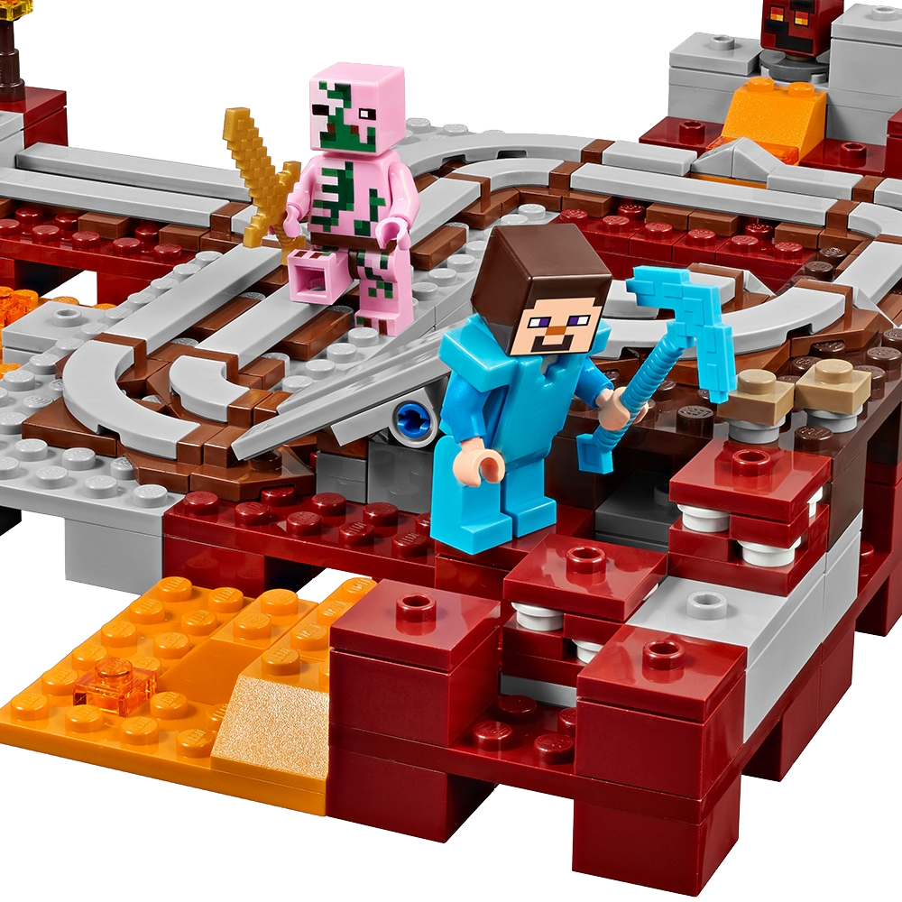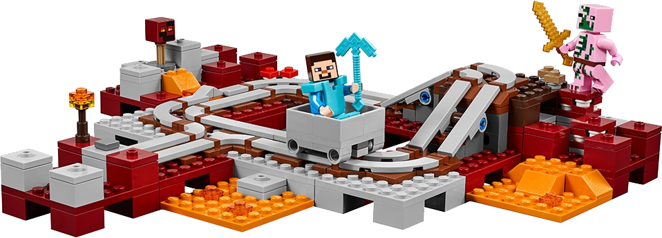 Build an awesome rail system and journey through the Nether. Avoid the soul sand, hopping magma cubes and the zombie pigman as you search for precious nether quartz ore. Enjoy hands-on Minecraft™ adventures featuring your favorite characters and objects with this easy-to-reconfigure, modular LEGO® Minecraft set—designed for young fans of the highly successful sandbox video game. Includes a Steve minifigure.Includes a Steve minifigure, plus a zombie pigman, big magma cube and a small magma cube.The Nether Railway features a minecart and a curved rail track with hopping magma cube function.Don your diamond armor, grab your diamond pickaxe and jump aboard the minecart to ride The Nether Railway!Race over the track to activate the hopping magma cube function.Accessory elements include a pickaxe, redstone torch and nether quartz ore.Also includes a sword.Easy-to-reconfigure modular design with three alternative model configurations.Set your imagination free—rebuild the set for more LEGO® Minecraft™ creations!This set includes over 380 pieces and offers an age-appropriate build and play experience for ages 8+.Measures over 1” (4cm) high, 11” (28cm) wide and 9” (24cm) deep.