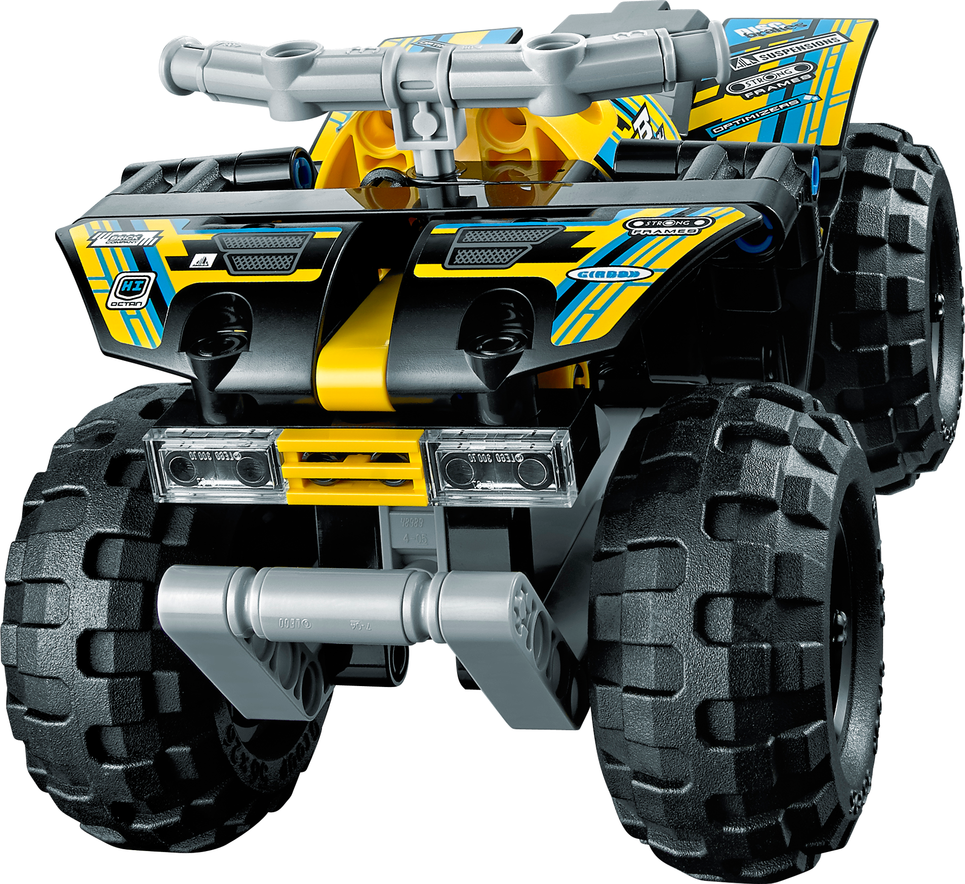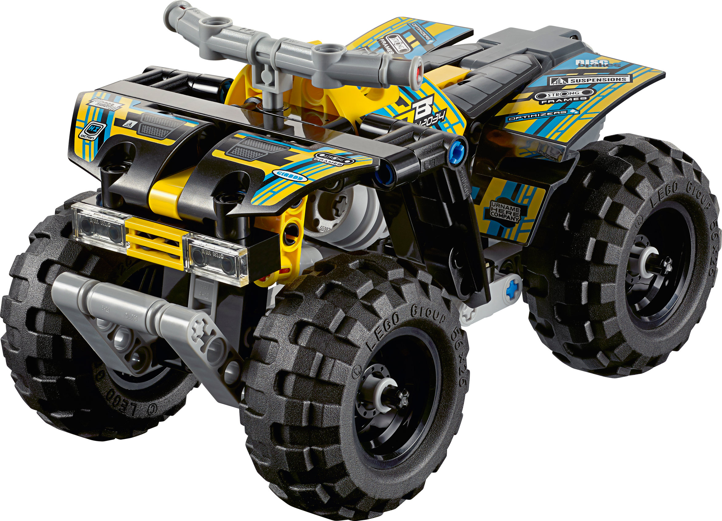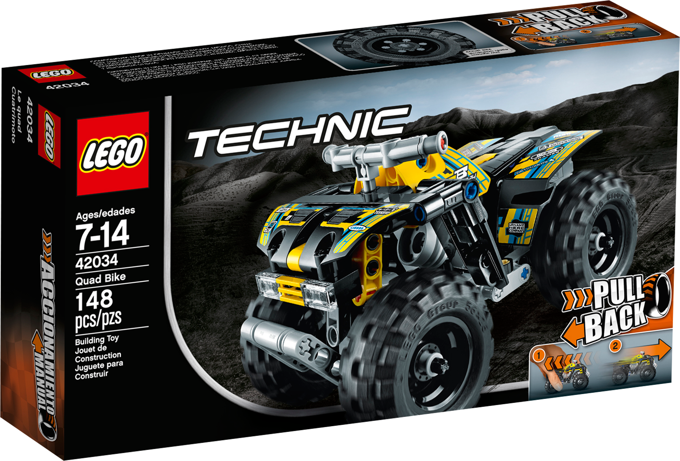 Power over the roughest terrain with the rugged LEGO® Technic Quad Bike! This robust, powerful machine features a yellow, black, blue and gray color scheme, supercool decals, huge deep-tread tires, durable chassis with ultra-high fenders, heavy-duty bull bar and a powerful, high-speed pull-back motor. Get ready for the ride of your life! Combine with the 42033 Record Breaker to create the mega-awesome Extreme Off Roader for even more high-speed action!