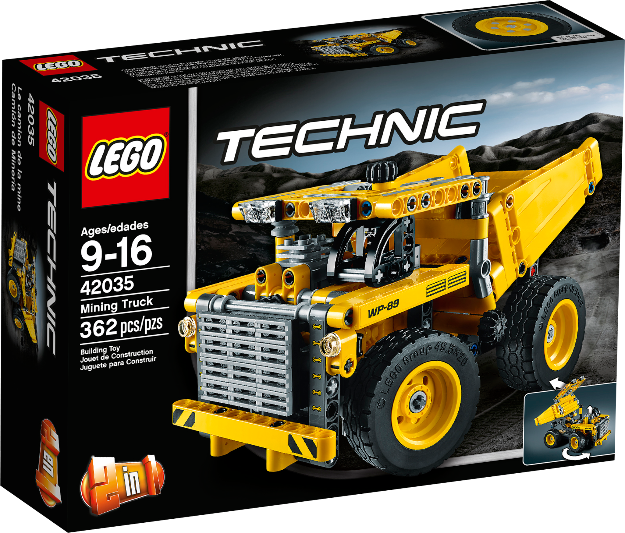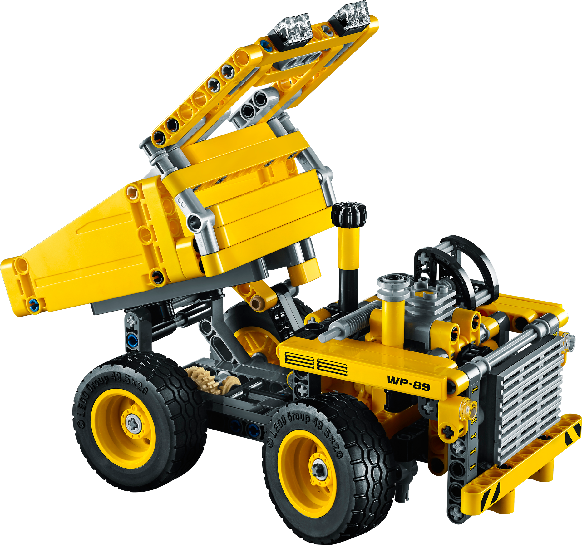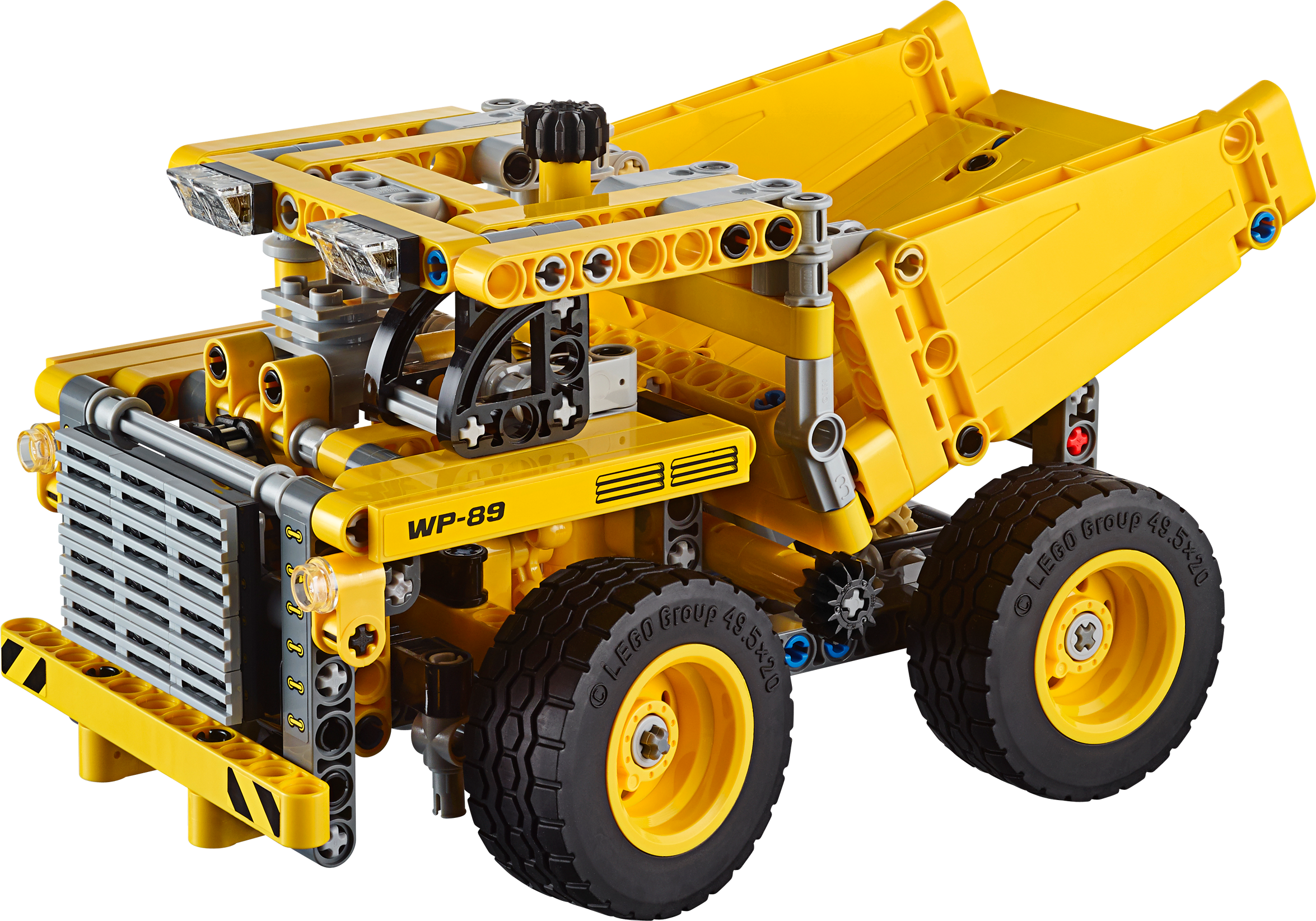 Climb aboard the gigantic Mining Truck! The awesome scale of this massive vehicle has been captured in this LEGO® Technic model, featuring huge wheels, detailed engine with moving piston and transmission belt, heavy-duty bumper and grill guard, tipping cargo bed, driver’s cab and working steering. Maneuver the mighty machine into position, then tip and lock the massive cargo bed to deliver the load! Features a cool yellow and black color scheme. This 2-in-1 model rebuilds into a rugged Wheel Dozer.