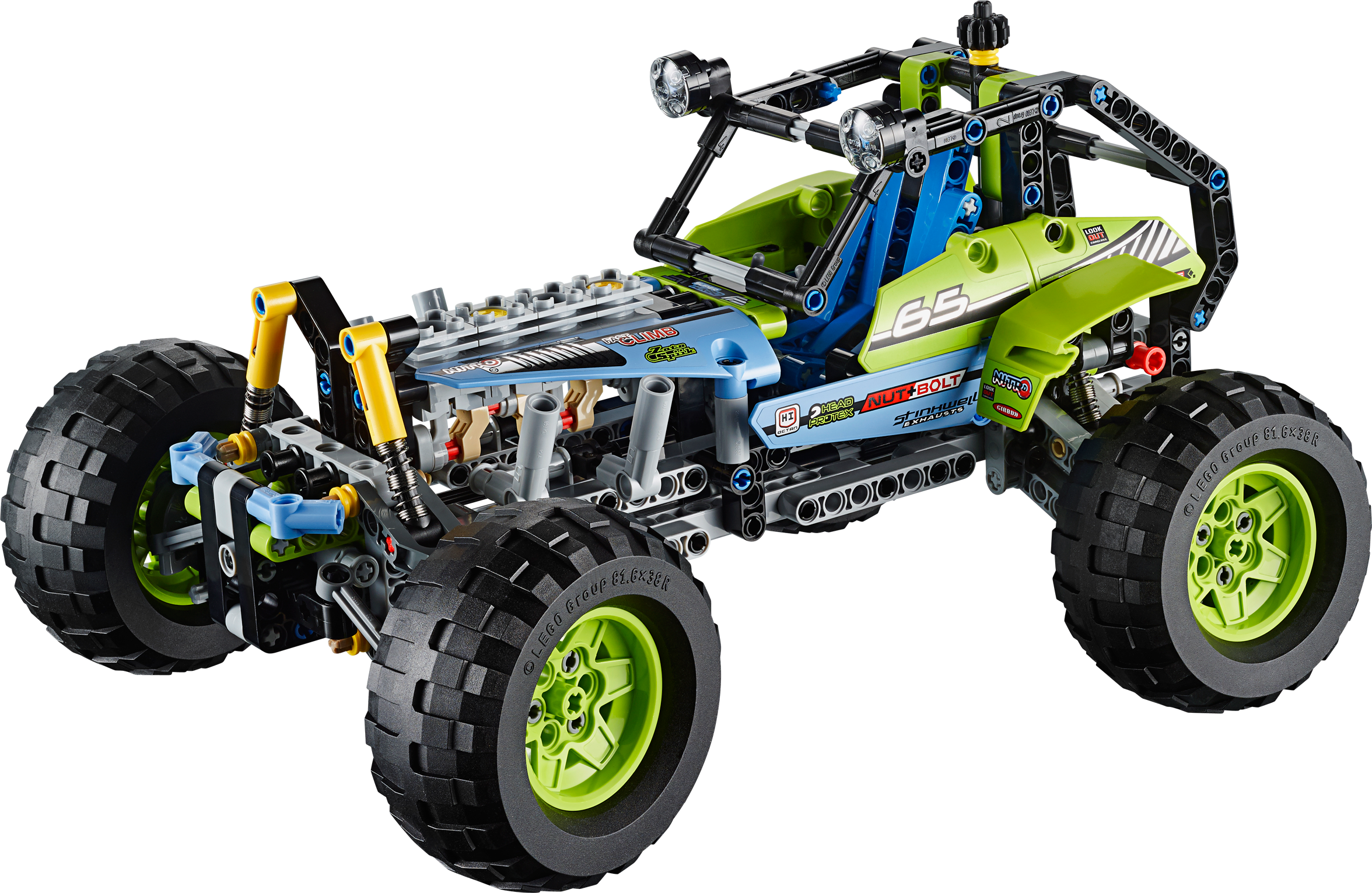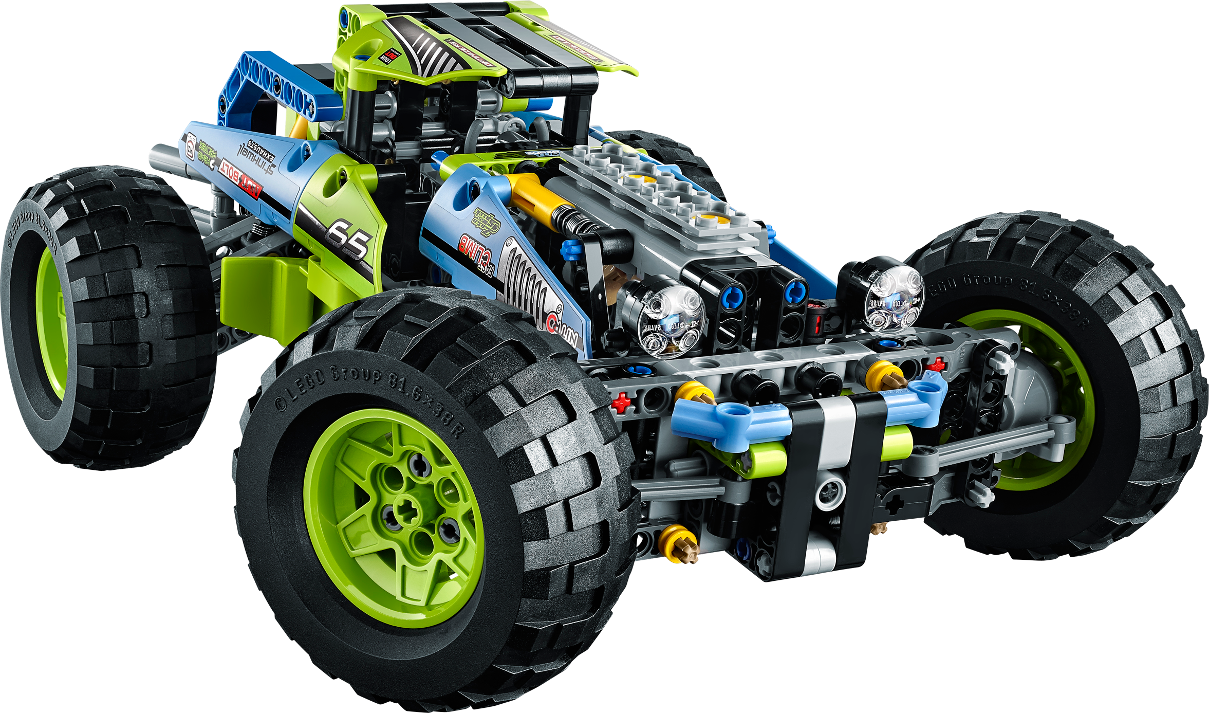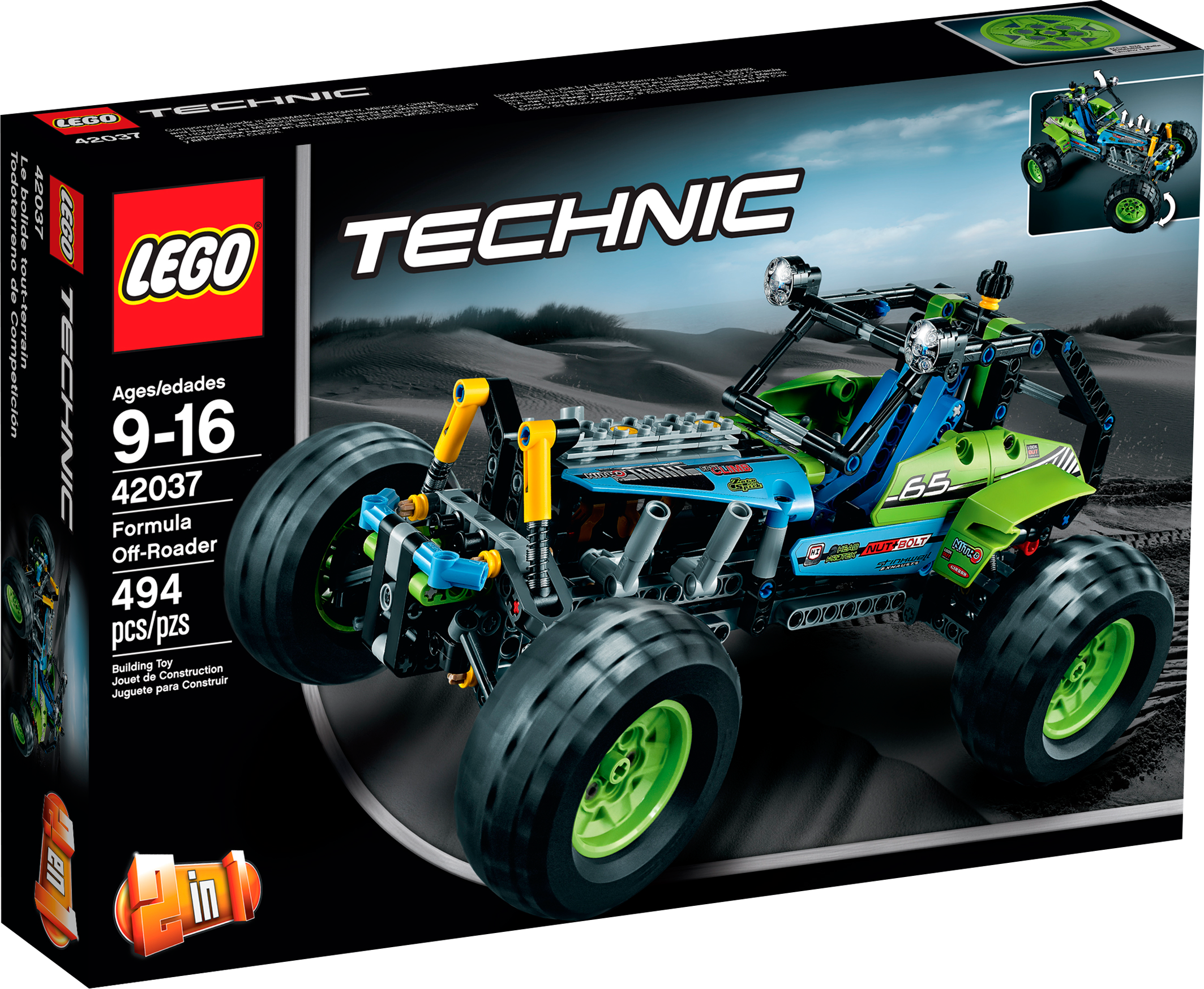 Power over mountainous terrain with the sturdy LEGO® Technic Formula Off-Roader! Featuring a fresh lime green and blue color scheme, huge deep-tread tires mounted on cool lime green rims, working steering, robust chassis, hinged cab cage, large roof-mounted spotlights and a detailed 4-cylinder engine with moving pistons. This realistic model with super-rugged suspension is geared up for the toughest off-road action! Rebuilds into a high-speed Muscle Racer.