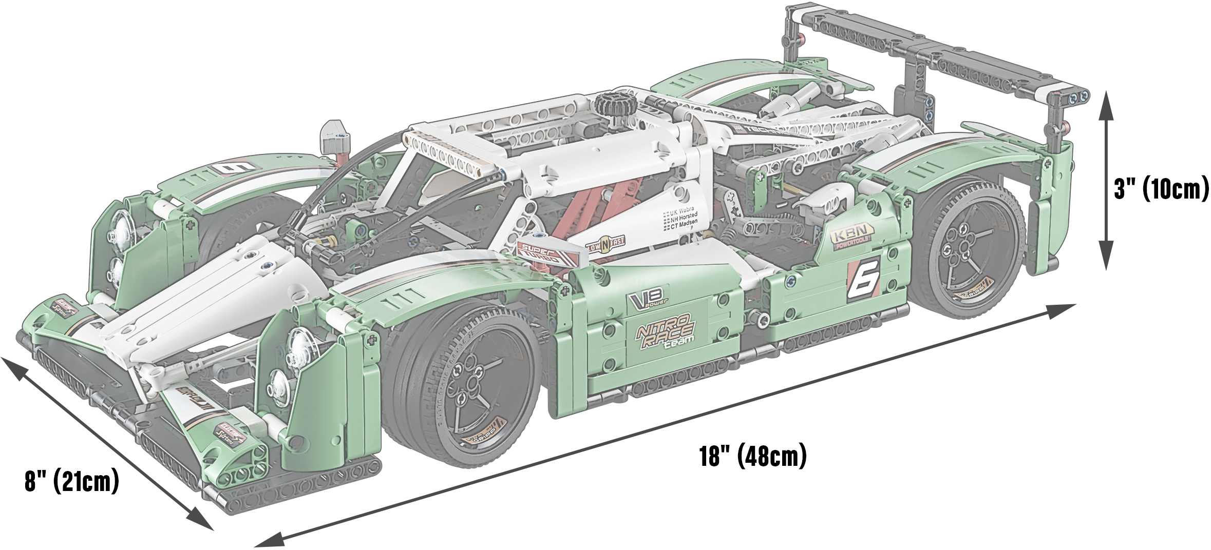 24 Hours Race Car measures over 3” (10cm) high, 18” (48cm) long and 8” (21cm) wide