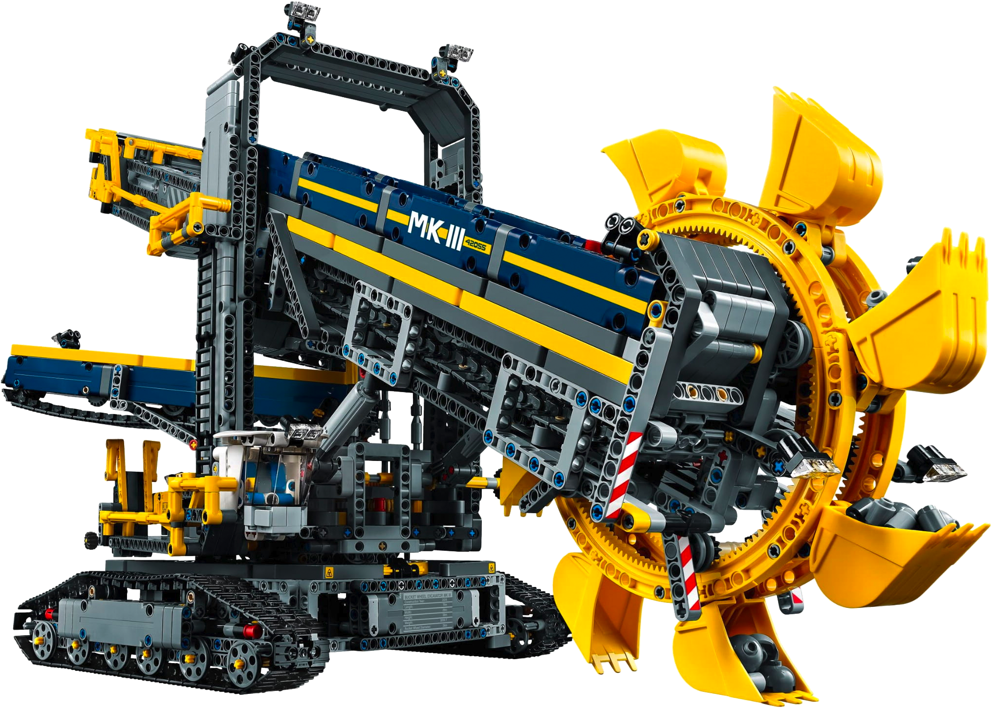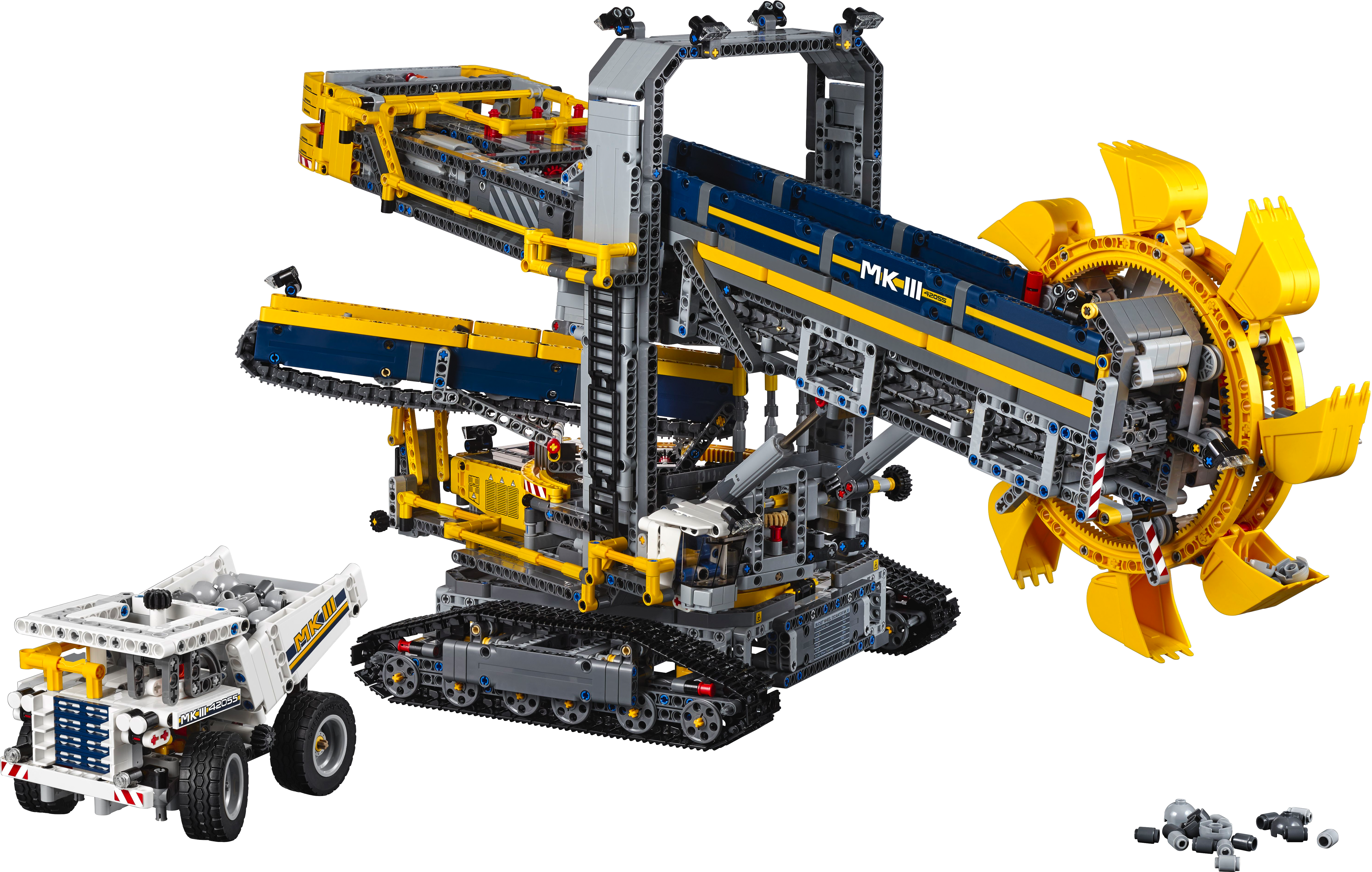 Enjoy building and operating this massive 2-in-1 Bucket Wheel Excavator, the largest LEGO® Technic set to date! This awesome, meticulously detailed reproduction of a real-life mining excavator comes with a cool dark-blue and yellow color scheme and an array of authentic features and functions, including hand-railed walkways, huge tracks and a detailed cab. Switch on the included Power Functions motor and you can activate the conveyor belts, rotate the massive superstructure and maneuver the colossal machine into position. Then activate the boom to lower the gigantic, digging bucket wheel and convey the mined material to the waiting mine truck. When you feel like another building challenge, rebuild it into a Mobile Aggregate Processing Plant.