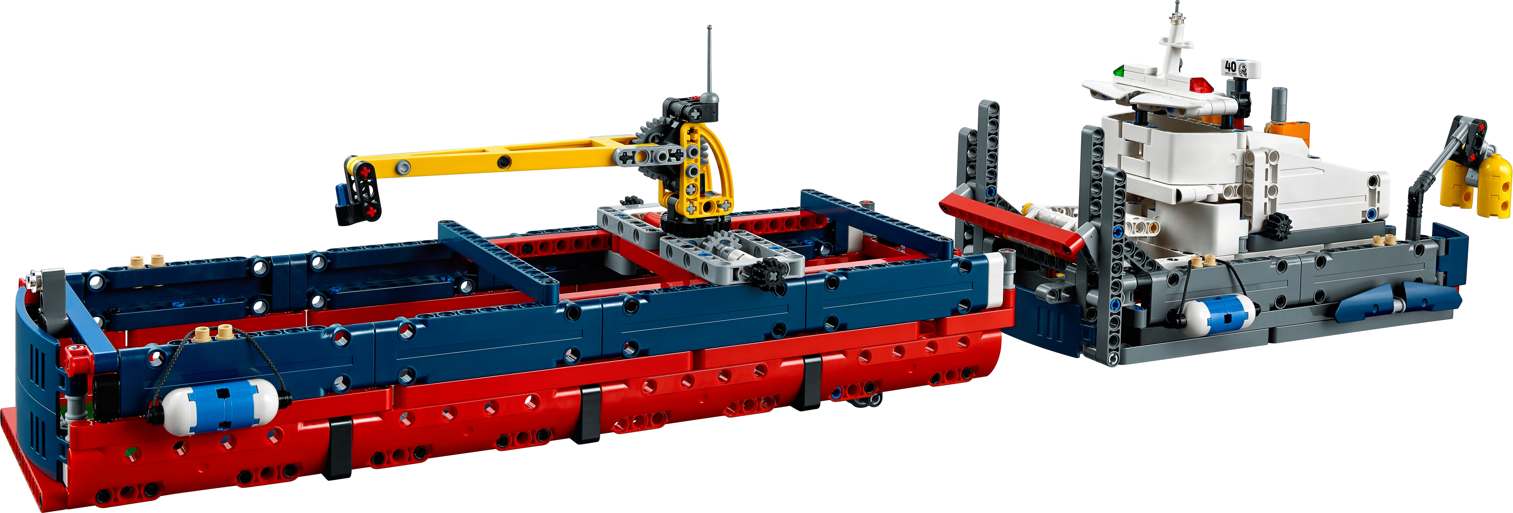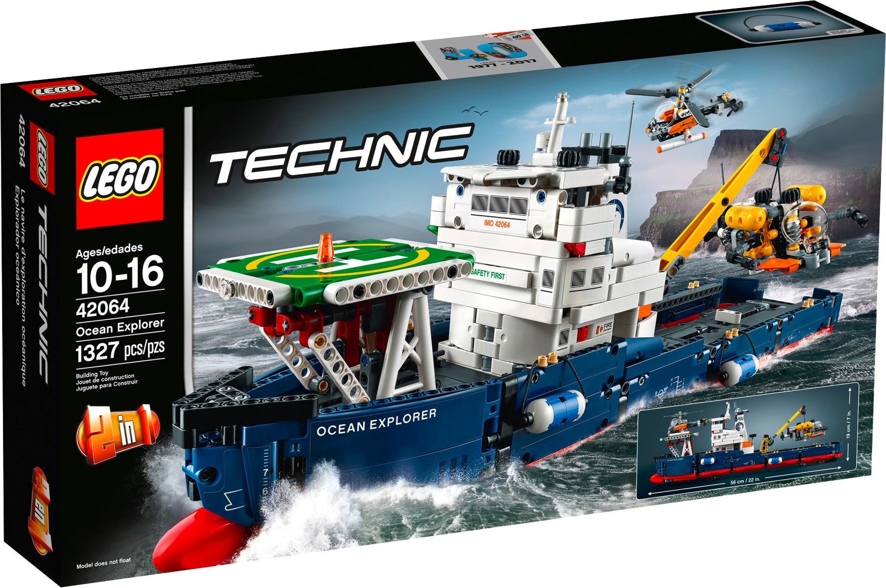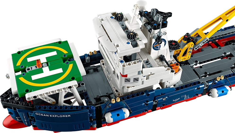 Enjoy seafaring adventures with this LEGO® Technic Ocean Explorer set, featuring a ship with a dark-blue, red and white color scheme, plus a buildable submarine with movable arms and spinning propeller, and a buildable helicopter with spinning rotors. The ship features a large captain’s bridge with radar and funnel detailing, plus a landing pad, working crane and an opening deck hatch for access to the ship’s hull, complete with bulbous bow and two fenders. This detailed 2-in-1 set has been designed to provide an immersive and rewarding building experience and can be rebuilt to create a Push Boat and Barge. Features a ship with a bulbous bow, large captain’s bridge with radar and funnel detailing, landing pad and a working crane, plus a buildable submarine and helicopter. Check out the ship’s authentic dark-blue, red and white color scheme. Submarine features a bubble cockpit, movable arms, spinning propeller and a yellow and black color scheme. Helicopter features a bubble cockpit, spinning rotors and an orange, gray and white color scheme. Practice takeoffs and landings from the ship's landing pad. Use the submarine’s movable arms to carry out underwater investigations. Turn the ship’s steering to adjust the rudders. Open the deck hatch to access the ship’s hull. A uniquely decorated LEGO® Technic 40th Anniversary brick is included with this model. This LEGO® Technic model is designed to provide an immersive and rewarding building experience. This set includes over 1,300 pieces and offers an age-appropriate building experience for ages 10-16. 2-in-1 set: rebuilds into a Push Boat and Barge. Ship with crane boom extended to the side measures over 7” (20cm) high, 22” (56cm) long and 9” (23cm) wide, and over 7” (19cm) high and 4” (12cm) wide with crane boom retracted. Submarine measures over 2” (7cm) high, 5” (15cm) long and 2” (6cm) wide. Helicopter measures over 2” (6cm) high, 5” (14cm) long and 4” (11cm) wide. Push Boat measures over 6” (16cm) high, 9” (24cm) long and 5” (13cm) wide. Barge measures over 3” (8cm) high, 15” (39cm) long and 5” (13cm) wide.