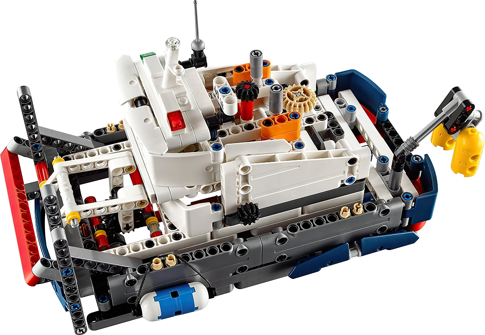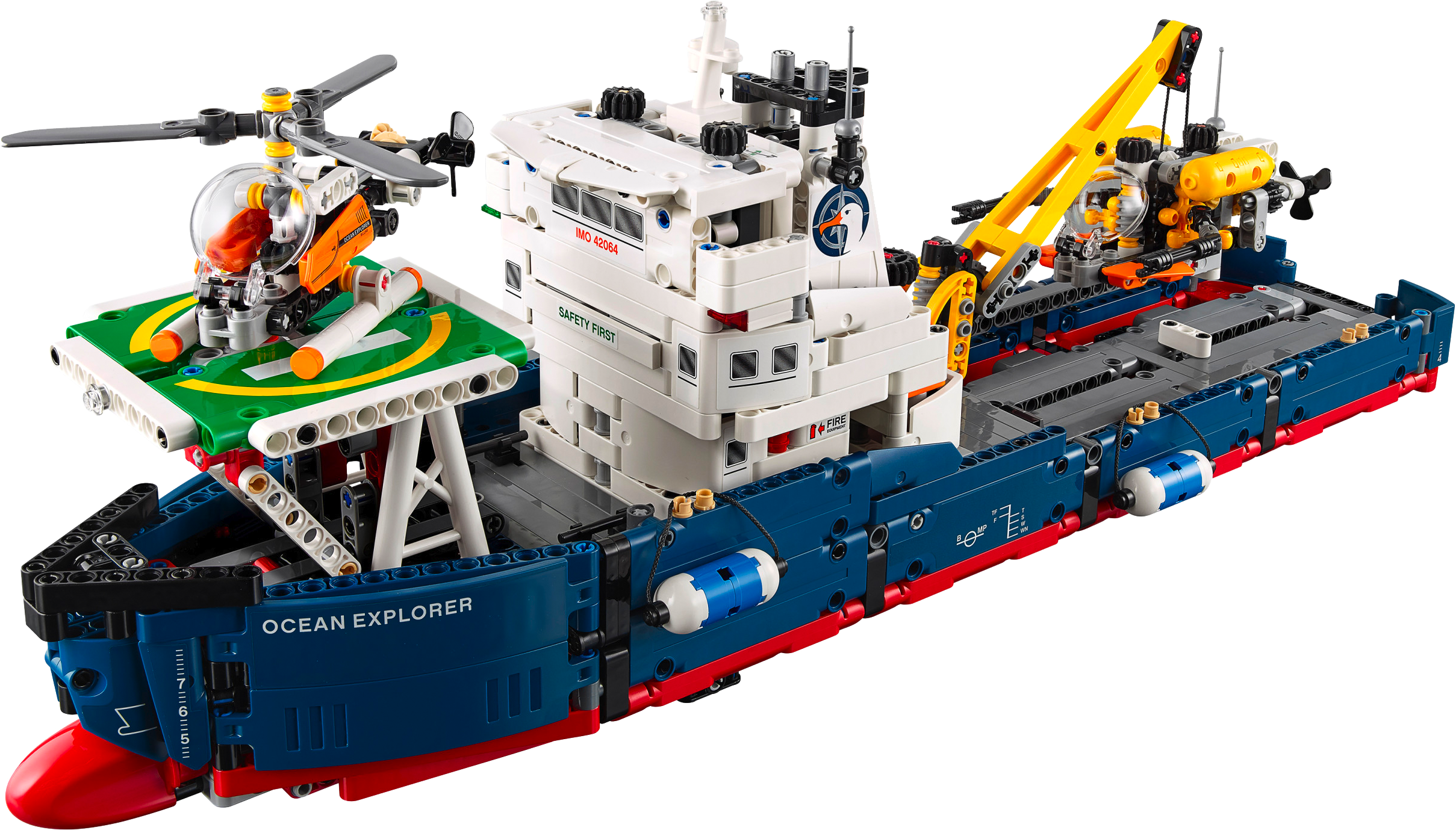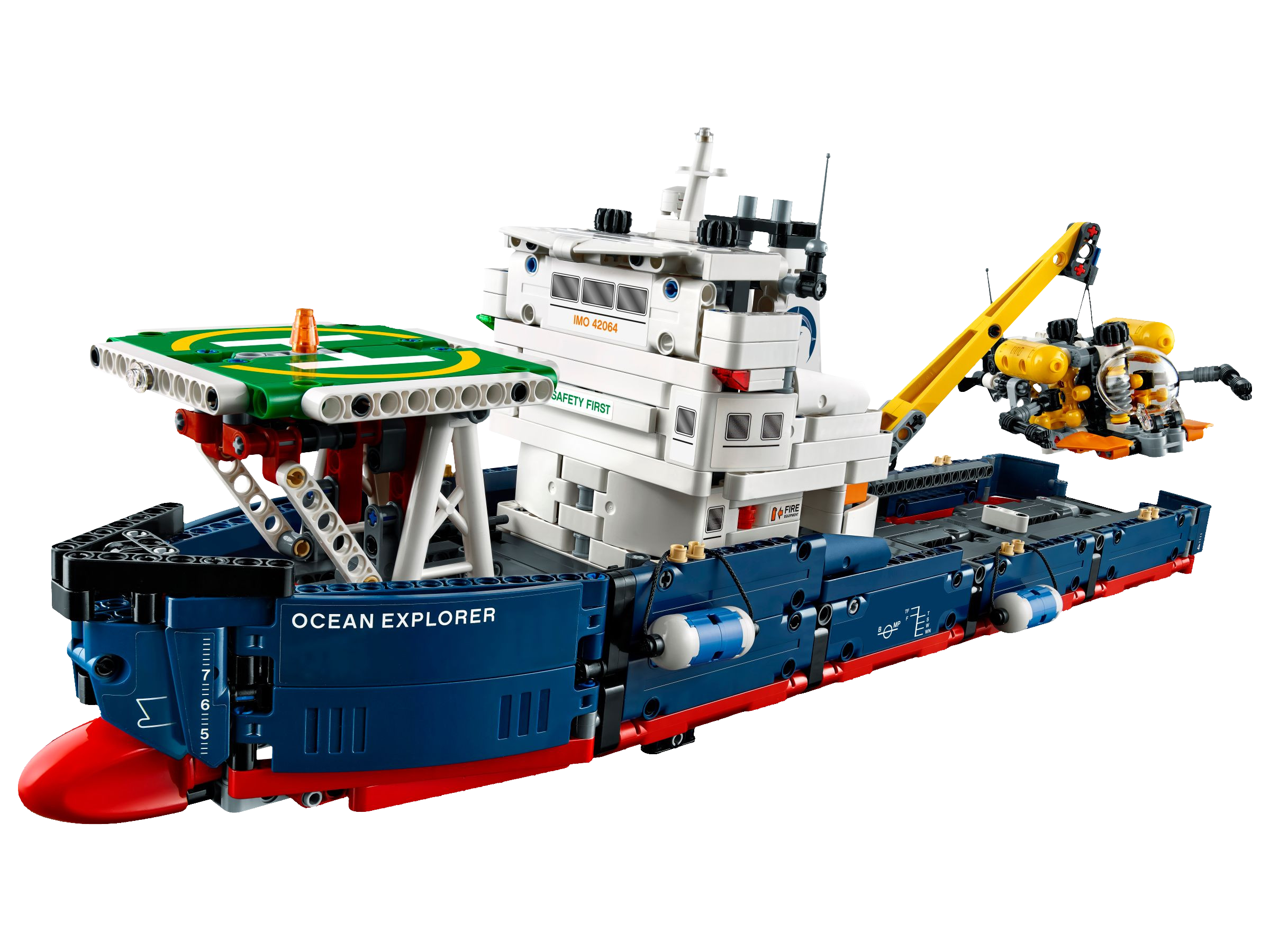 Enjoy seafaring adventures with this LEGO® Technic Ocean Explorer set, featuring a ship with a dark-blue, red and white color scheme, plus a buildable submarine with movable arms and spinning propeller, and a buildable helicopter with spinning rotors. The ship features a large captain’s bridge with radar and funnel detailing, plus a landing pad, working crane and an opening deck hatch for access to the ship’s hull, complete with bulbous bow and two fenders. This detailed 2-in-1 set has been designed to provide an immersive and rewarding building experience and can be rebuilt to create a Push Boat and Barge. Features a ship with a bulbous bow, large captain’s bridge with radar and funnel detailing, landing pad and a working crane, plus a buildable submarine and helicopter. Check out the ship’s authentic dark-blue, red and white color scheme. Submarine features a bubble cockpit, movable arms, spinning propeller and a yellow and black color scheme. Helicopter features a bubble cockpit, spinning rotors and an orange, gray and white color scheme. Practice takeoffs and landings from the ship's landing pad. Use the submarine’s movable arms to carry out underwater investigations. Turn the ship’s steering to adjust the rudders. Open the deck hatch to access the ship’s hull. A uniquely decorated LEGO® Technic 40th Anniversary brick is included with this model. This LEGO® Technic model is designed to provide an immersive and rewarding building experience. This set includes over 1,300 pieces and offers an age-appropriate building experience for ages 10-16. 2-in-1 set: rebuilds into a Push Boat and Barge. Ship with crane boom extended to the side measures over 7” (20cm) high, 22” (56cm) long and 9” (23cm) wide, and over 7” (19cm) high and 4” (12cm) wide with crane boom retracted. Submarine measures over 2” (7cm) high, 5” (15cm) long and 2” (6cm) wide. Helicopter measures over 2” (6cm) high, 5” (14cm) long and 4” (11cm) wide. Push Boat measures over 6” (16cm) high, 9” (24cm) long and 5” (13cm) wide. Barge measures over 3” (8cm) high, 15” (39cm) long and 5” (13cm) wide.