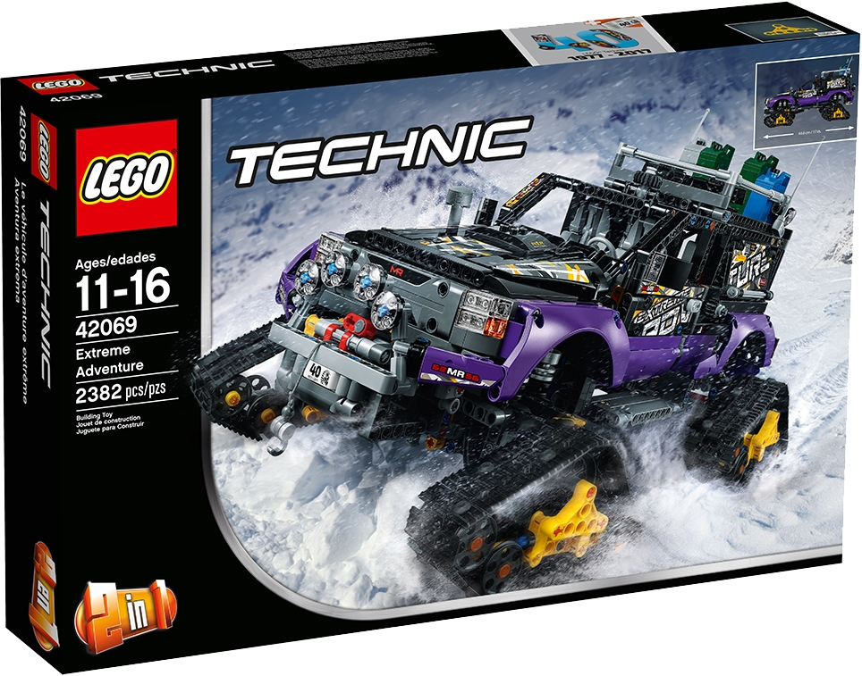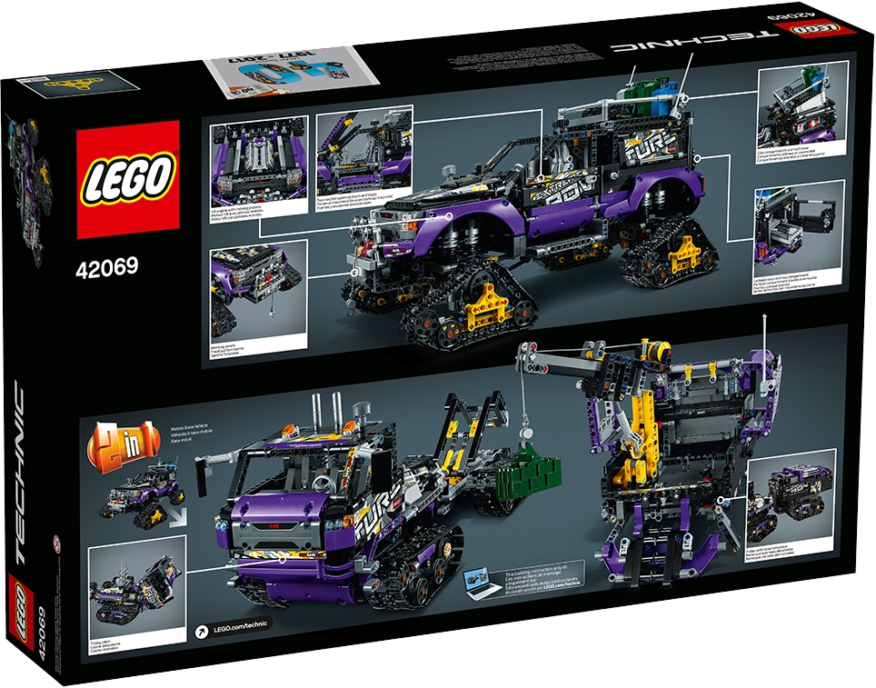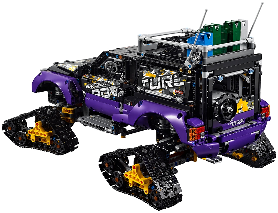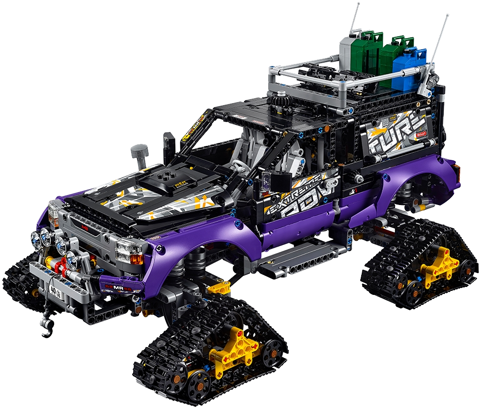 Experience the ultimate in traction and maneuverability with the Extreme Adventure vehicle, featuring 4 high-grip tracks with working suspension, upswing doors with lowering running board function, raisable roof tent, working winch, front steering, opening hood, detailed V8 engine with moving pistons and a lockable tailgate. Also includes a sliding storage drawer, side storage compartment with a first aid kit and 2 fire extinguishers, and a roof rack with 2 jerry cans in a rare dark-green color. This 2-in-1 LEGO® Technic model comes in a yellow, black and purple color scheme with decorative sticker detailing, and can be rebuilt to create a Mobile Base Vehicle.Features 4 high-grip tracks with working suspension, upswing doors with lowering running board function, a raisable roof tent, lockable tailgate, working winch, front steering, opening hood, detailed V8 engine with moving pistons, sliding storage drawer with shovel, opening side storage compartment with a first aid kit and 2 fire extinguishers, and a roof rack with 2 dark-green jerry cans.Check out the yellow, black and purple color scheme with decorative sticker detailing.Maneuver the Extreme Adventure to rotate the high-grip tracks.Turn the crank to raise the integrated roof tent.Open the upswing doors and see the running boards lower into place.Load the jerry cans onto the roof rack, open the side storage compartment to access the first aid kit and 2 fire extinguishers, and slide out the drawer to access the shovel.A uniquely decorated LEGO® Technic 40th Anniversary brick is included with this model.This LEGO® Technic model is designed to provide an immersive and rewarding building experience.Designed for indoor use only.2-in-1 model: rebuilds into a Mobile Base Vehicle. Extreme Adventure (with roof tent raised and doors open) measures over 11” (30cm) high, 17” (44cm) long and 9” (25cm) wide, and 10” (26cm) high and 9” (24cm) wide with roof tent lowered and doors closed.Mobile Base Vehicle measures over 7” (19cm) high, 18” (47cm) long and 7” (20cm) wide.