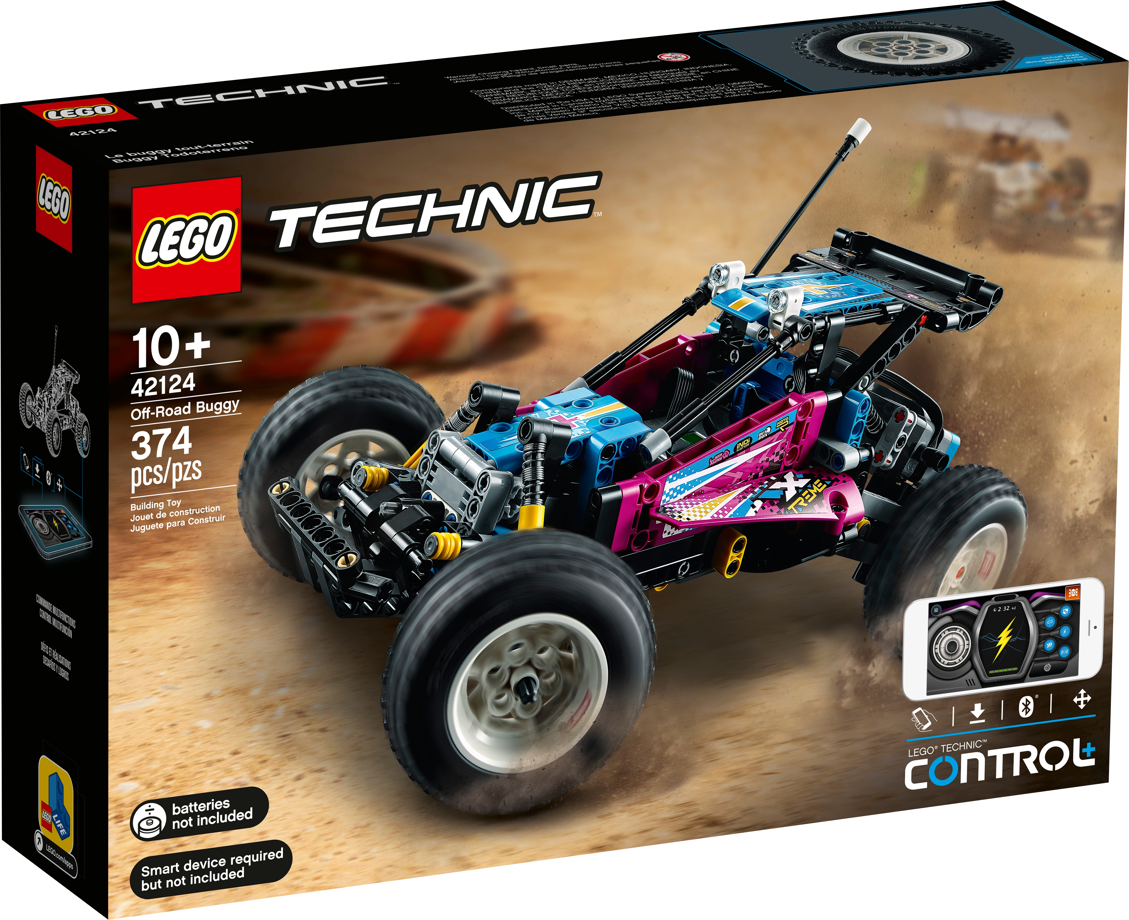 Travel back to the 1980s with this LEGO® Technic™ Off-Road Buggy (42124) – it’s fun for all ages from 10 and up. After creating the model, bring it to life using the free CONTROL+ app. The buggy is angled at the front to give stability when jumping and performing tricks, just like classic RC toy cars. With front and back suspension (a first for LEGO Technic), plus huge tires, an opening hood, antenna and retro stickers, this car is packed with attitude.Unleash epic stunts with the appDownload the free CONTROL+ app to really put this Off-Road Buggy car to the test. Use the app to drive forwards and backwards, steer and perform stunts. With different controls, sound effects, challenges, achievements and more, there’s so much to explore.A rewarding buildLEGO Technic sets feature realistic movement and mechanisms that introduce LEGO builders to the universe of engineering in an approachable and realistic way.Unleash hours of fun with the LEGO® Off-Road Buggy (42124) building kit. This RC Off-Road Buggy car is packed with features inspired by the original 1980s RC toy cars.Amazing tricks are easy to perform thanks to the car’s front and rear suspension, massive tires and angled front.Download the free CONTROL+ app to add a new dimension to this remote-control buggy. Use the app to control the car, perform stunts and unlock challenges, sound effects and more.This Off-Road Buggy is an awesome gift for kids aged 10 and up. Adults who remember the classic 1980s RC toy cars will love it too, making it a fun experience for all generations to enjoy together.Check out the retro color scheme, complete with 1980s-inspired sticker details.The RC Off-Road Buggy model measures over 5 in. (13 cm) high to roof, 7.5 in. (19 cm) high including antenna, 11 in. (28 cm) long and 6.5 in. (16 cm) wide.To enjoy all the features of this app-controlled toy you'll need to add 6 x LR6/AA batteries (not included).The LEGO® Technic™ universe offers advanced building toys for LEGO fans who are ready for their next building challenge.LEGO® Technic™ components meet stringent industry standards to ensure they are consistent, compatible and connect reliably every time – it's been that way since 1958.LEGO® Technic™ components are dropped, heated, crushed, twisted and analyzed to make sure they meet stringent global safety standards.