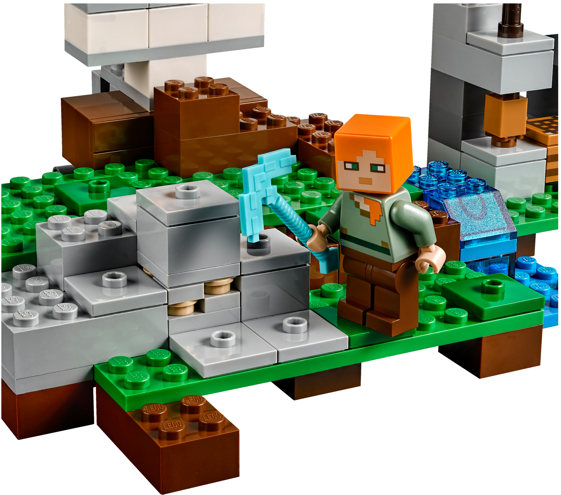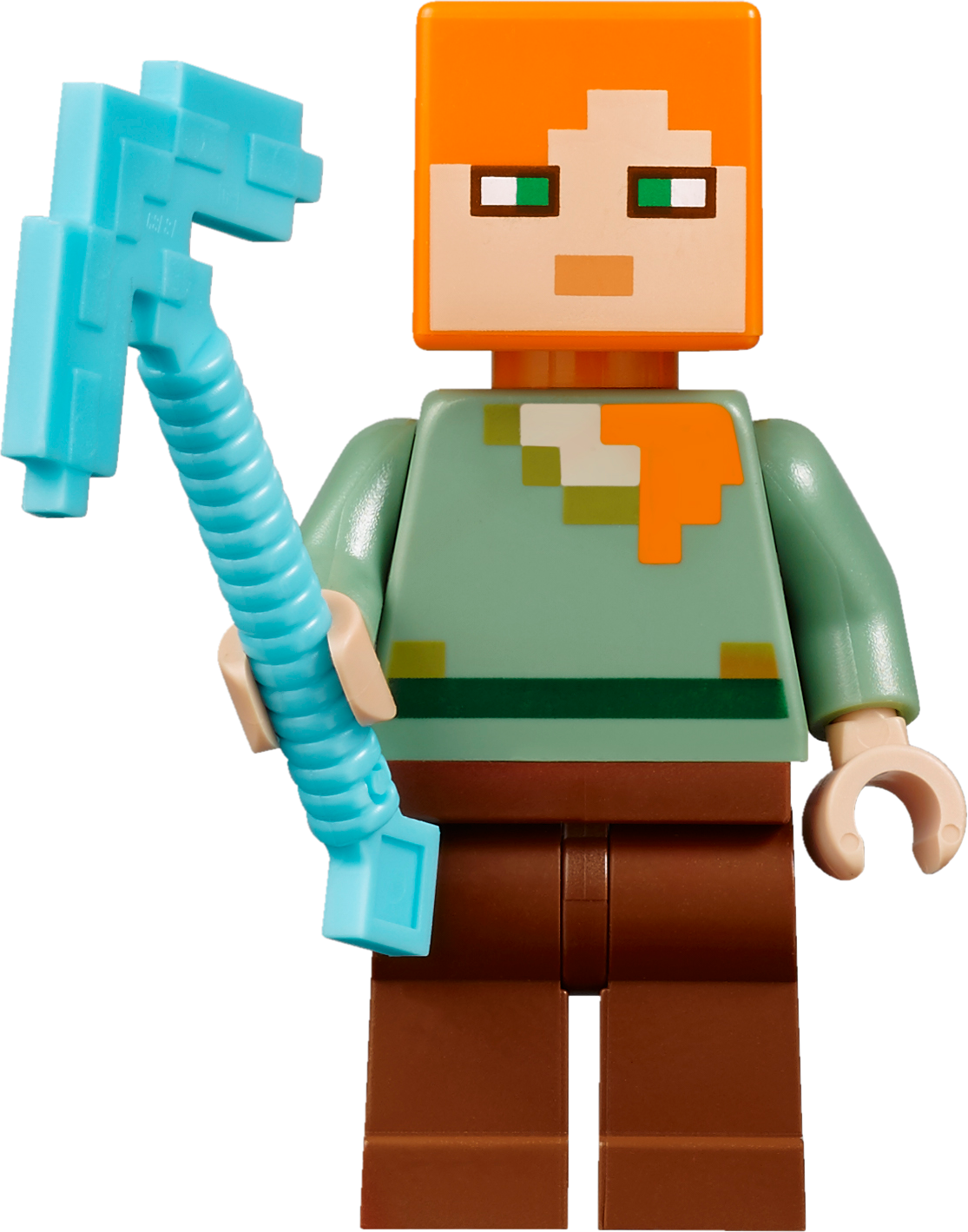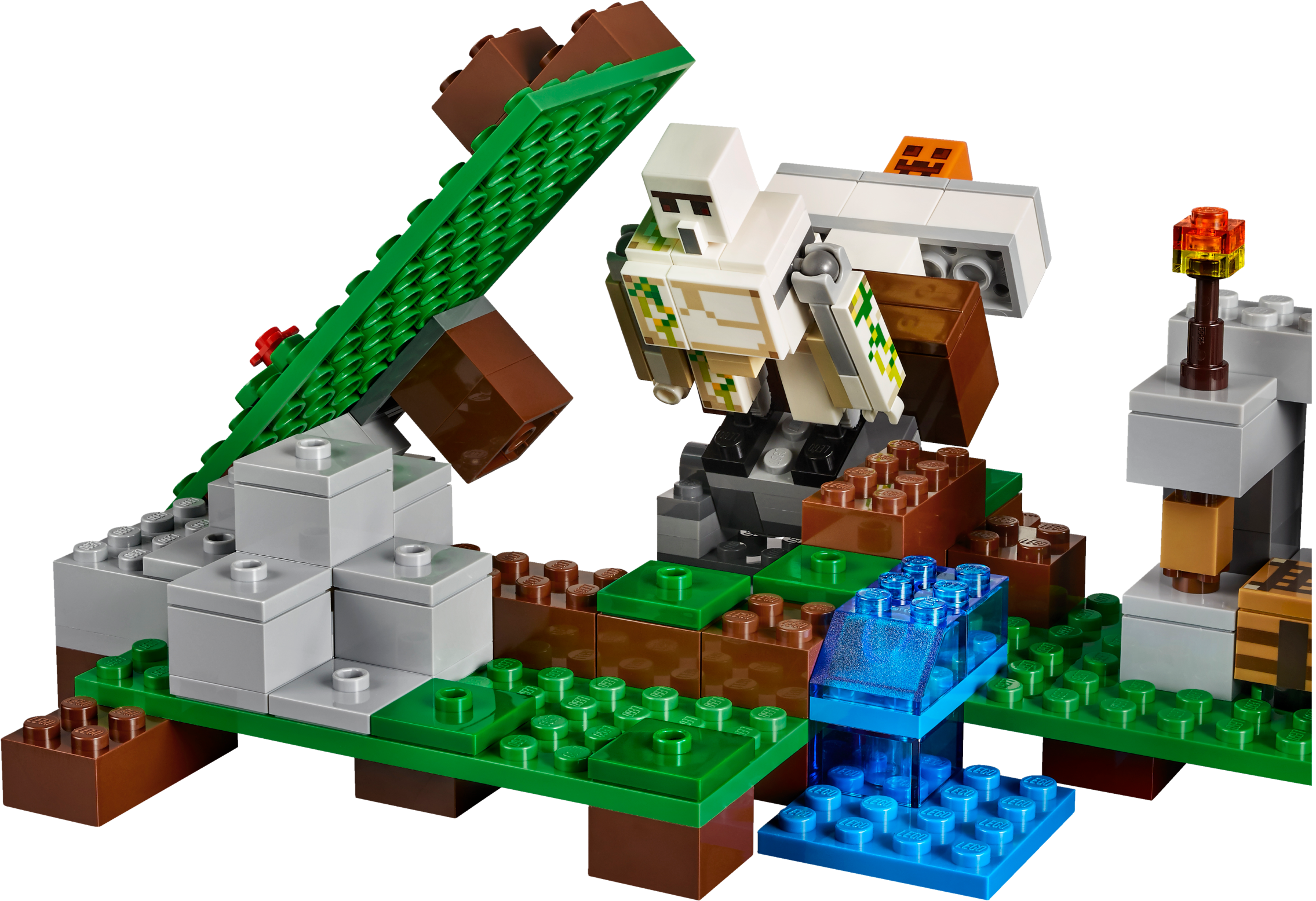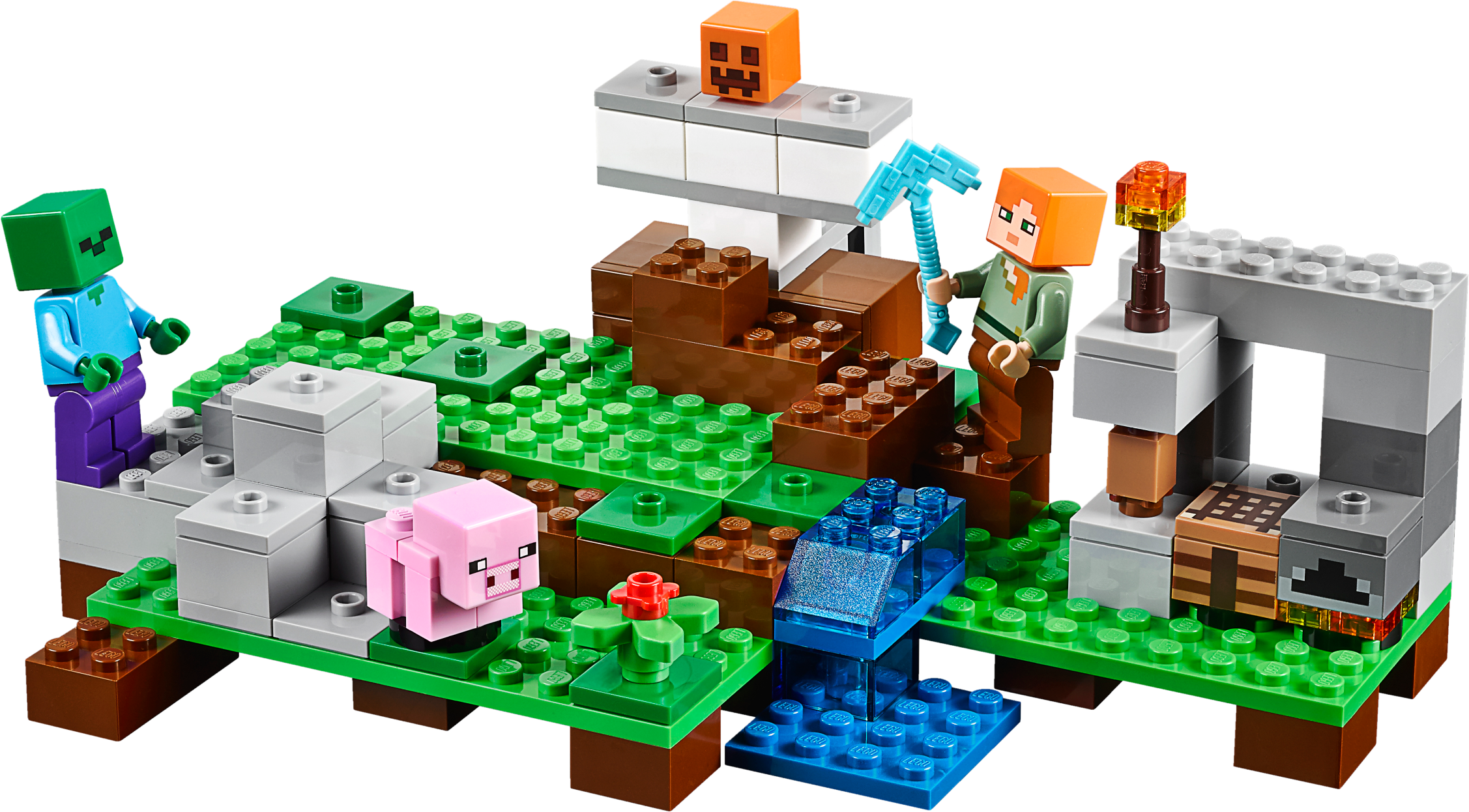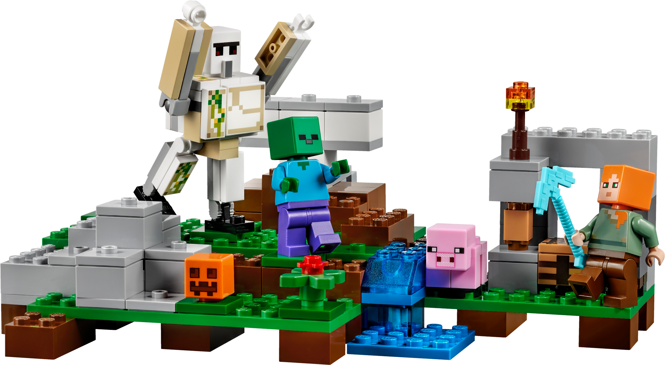 Spring a surprise attack with The Iron Golem! The sun is heading for the horizon and hostile mobs will soon be roaming the Minecraft™ landscape. You’ll need to protect yourself and your baby pig! Mine the iron ore with your diamond pickaxe, smelt iron ingots in the furnace and craft iron blocks using the crafting table. Then use the pumpkin head to create the iron golem, and spring a surprise attack on the zombie! Includes 2 minifigures: Alex and a zombie, plus an iron golem and a baby pig. Launch a surprise attack on the zombie with the secret iron golem pop-up function! Mine iron ore with your diamond pickaxe, smelt it in the furnace and use the crafting table to create iron blocks. Stack the blocks and add the pumpkin head to create the iron golem. Accessory elements include a buildable torch and pumpkin. Tool elements includes Alex’s pickaxe. Set your imagination free—rebuild the set for more LEGO® Minecraft™ creations! Includes more than 200 LEGO® bricks. Measures over 3” (8cm) high, 7” (19cm) wide and 5” (15cm) deep.