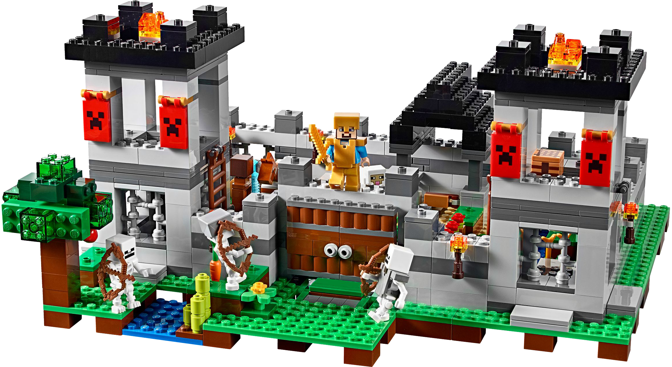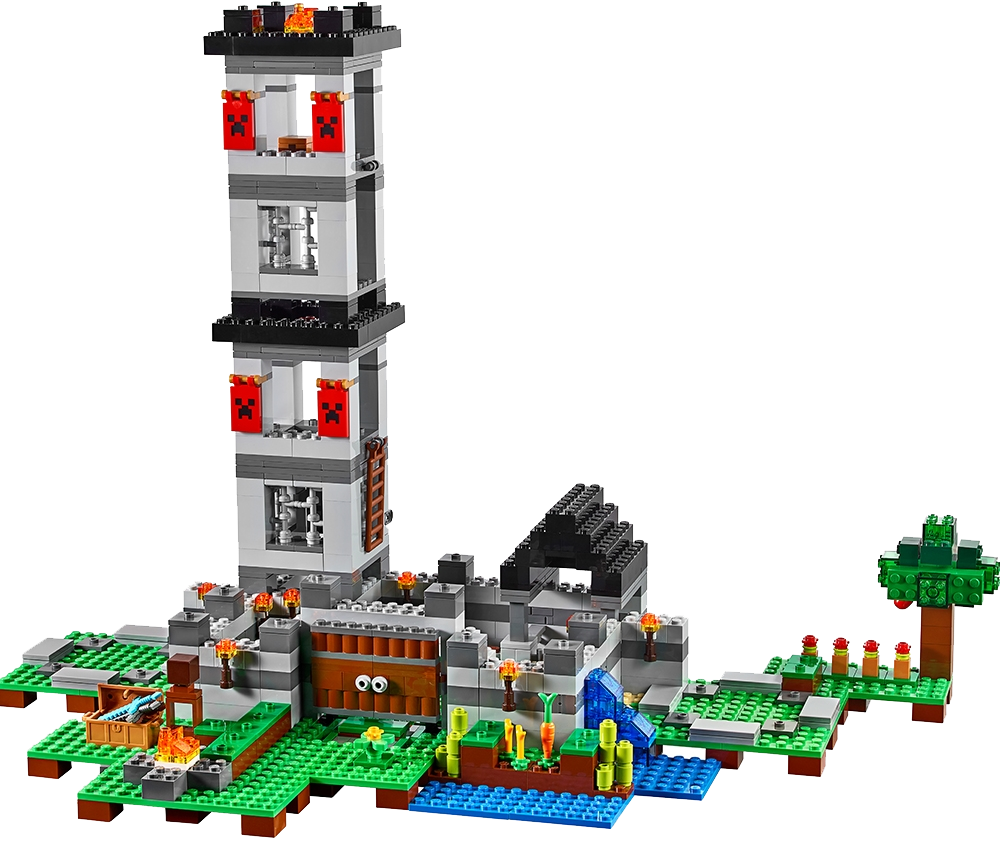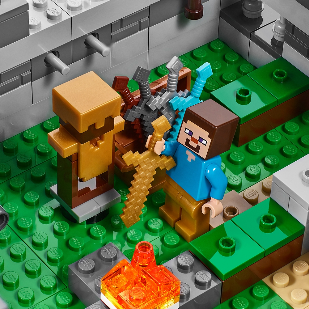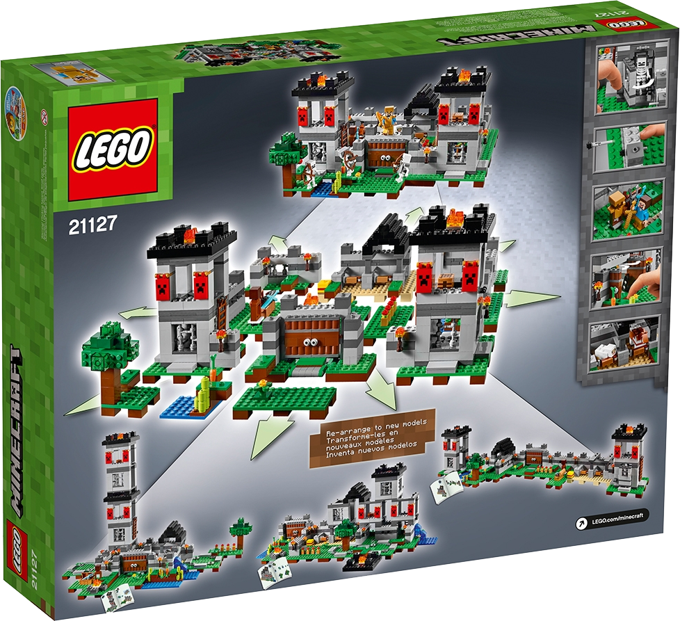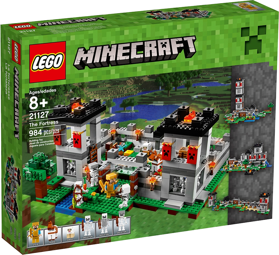 Protect your livestock and defend the awesome fortress against the ensuing skeleton army! Enjoy hands-on Minecraft™ adventures featuring your favorite characters and objects with this easy-to-rebuild, modular LEGO® Minecraft set—designed for young fans of the highly successful sandbox video game. Includes a Steve minifigure, plus a horse, sheep and 3 skeletons. Includes a Steve minifigure, plus a horse, sheep and 3 skeletons. Features a Minecraft™ fortress with large pressure-plate doors, lookout towers, decorative Creeper™ banners, barred windows, water and farm areas and a prison with door-opening function. Press the pressure plate to open the fortress doors. Light the fires and torches to ward off the approaching skeleton army. Load up the cannons and defend The Fortress. Accessory elements include Steve's golden armor and golden helmet, armor stand, armor, helmet, crafting table, weapons chest and a hay bale. Weapons include 5 swords and 3 skeleton bows. Easy-to-rebuild modular design with 3 alternative model configurations. Set your imagination free—rebuild the set for more LEGO® Minecraft™ creations! This set includes over 900 pieces. This set offers an age-appropriate building experience for ages 8+. Measures over 6” (16cm) high, 13” (33cm) wide and 13” (34cm) deep.