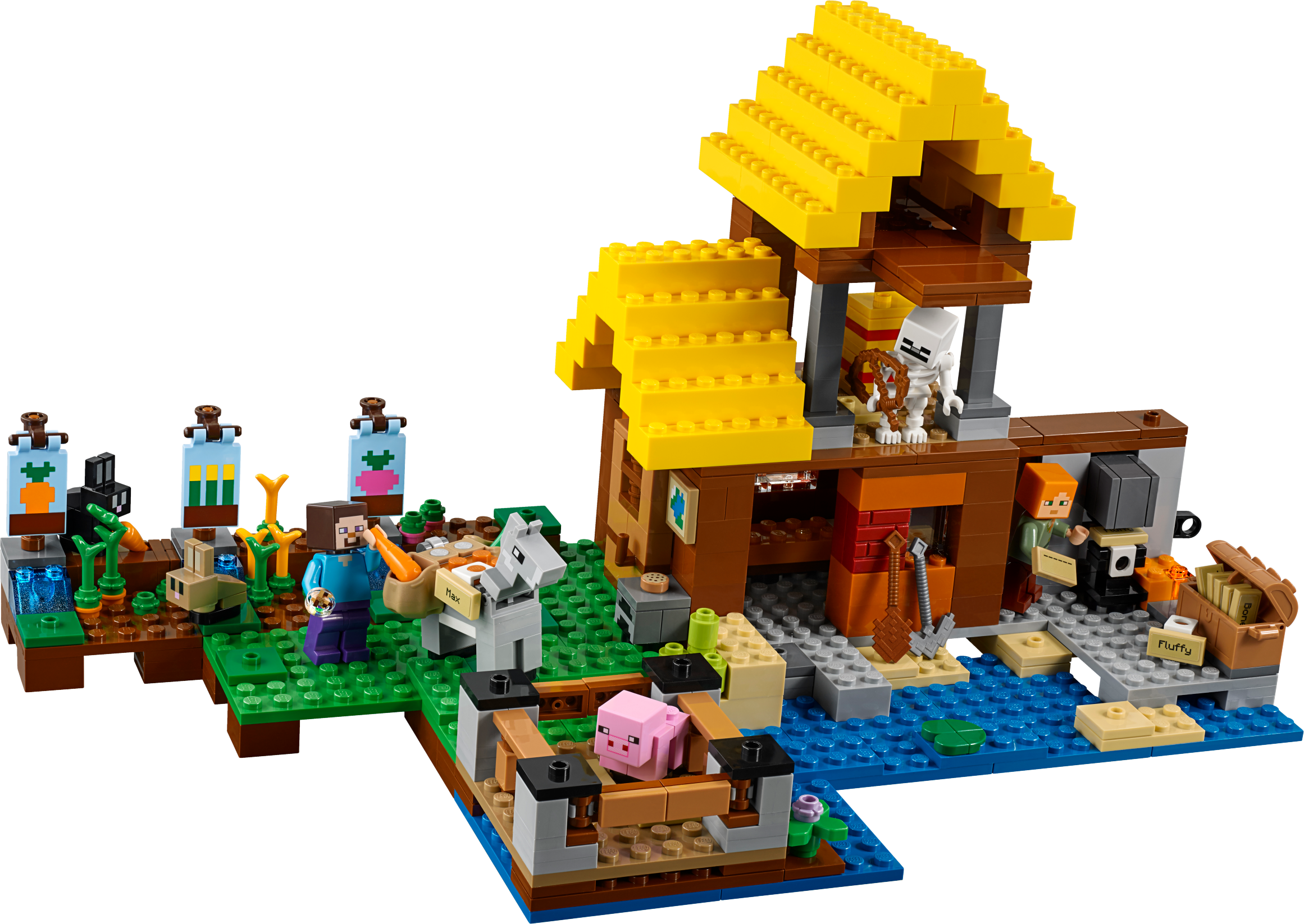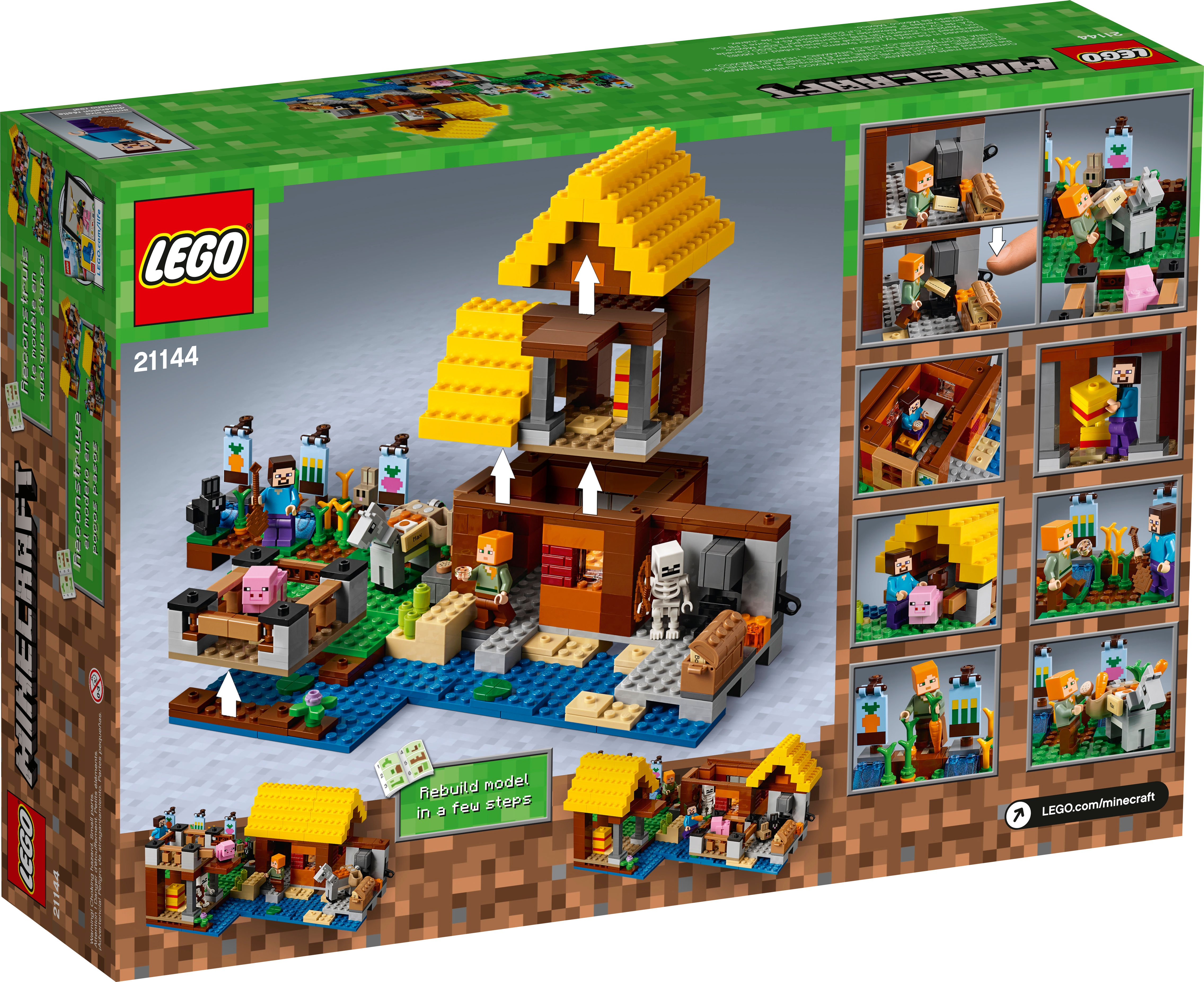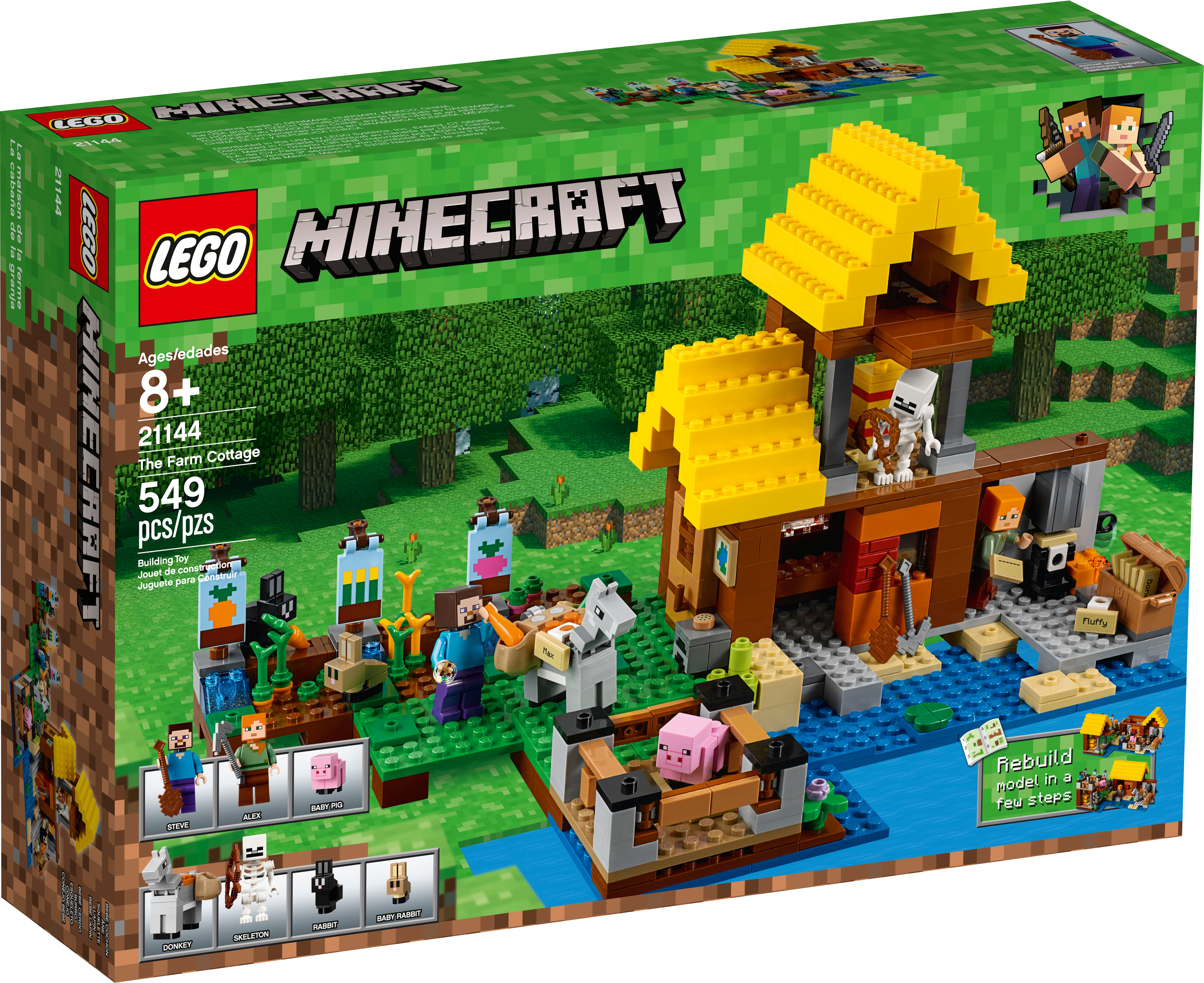 Use your LEGO® Minecraft™ creativity to build this exciting 2-level waterside Farm Cottage, featuring a detailed interior and a host of exterior features. Harvest wheat, carrots and beetroot, care for the baby pig and donkey, and protect your crops from the rabbits—and yourself from the skeleton! Enjoy hands-on Minecraft adventures with this easy-to-reconfigure, modular LEGO® Minecraft set; designed for young fans of the highly successful sandbox video game. Also includes Steve and Alex LEGO Minecraft minifigures. Includes 2 LEGO® Minecraft™ minifigures: Steve and Alex, plus donkey, baby pig, rabbit, baby rabbit and skeleton figures. Features a buildable Minecraft™ farm, including a 2-level house with a detailed interior, plus carrot, wheat and beetroot patches, animal pen, and grass and water areas. Harvest carrots, wheat and beetroot and transport them in the donkey's saddlebags. Use the nametags and the anvil to name the mobs. Watch out for the roaming skeleton after nightfall! Weapons include a pickaxe and a bow. Also includes a wooden shovel element. Easy-to-reconfigure modular design with 2 alternative model configurations. Set your imagination free—rebuild the set for more LEGO® Minecraft™ creations! This children's toy includes over 545 pieces and is suitable for ages 8+. Measures over 6” (17cm) high, 13” (34cm) wide and 7” (19cm) deep.
