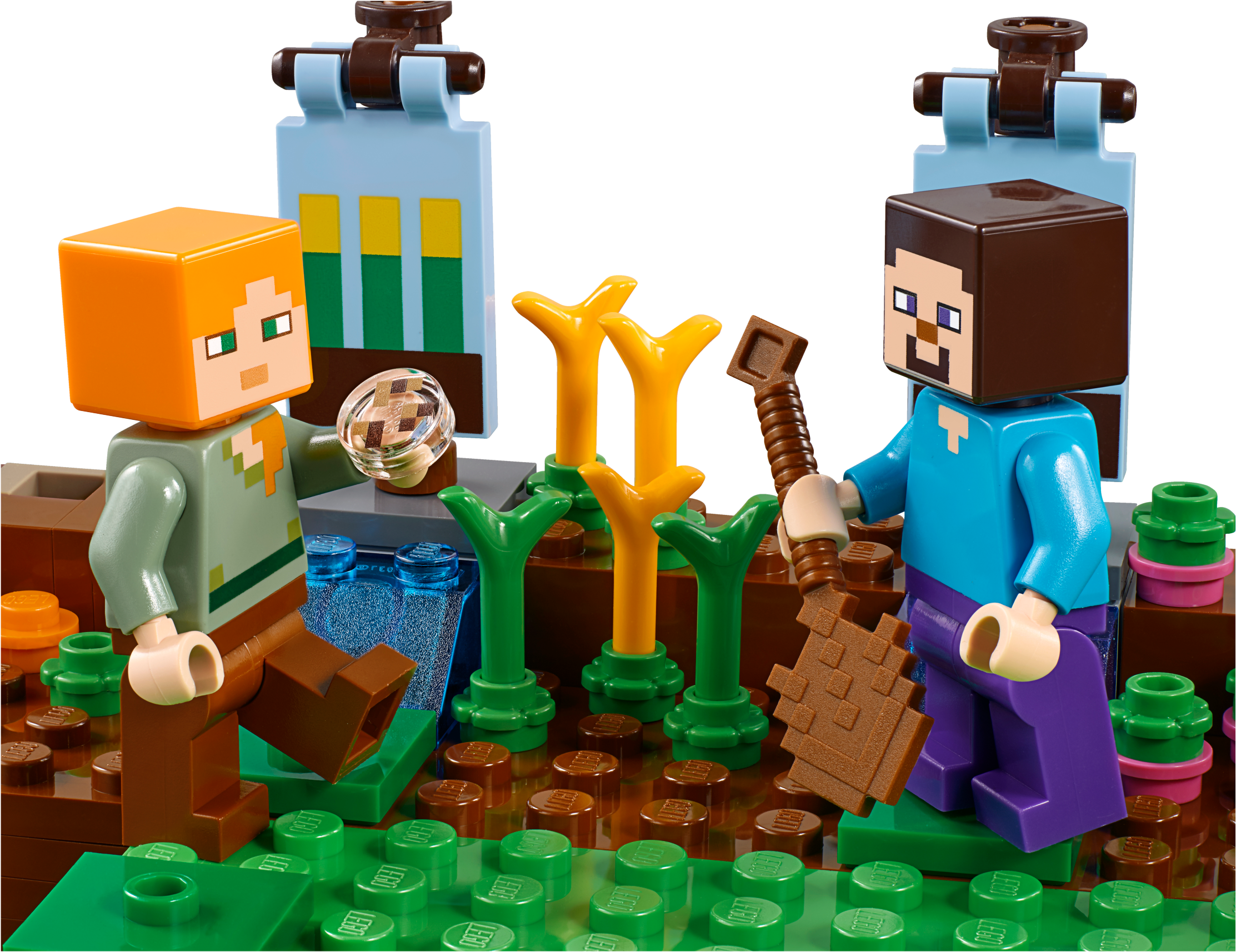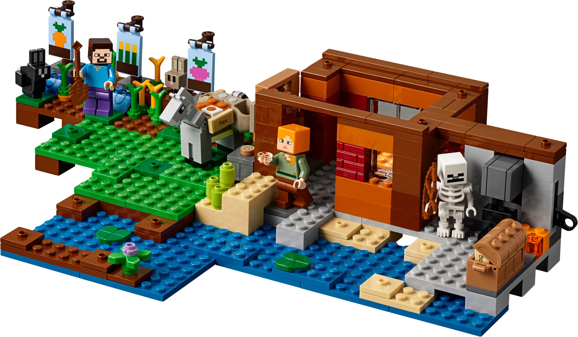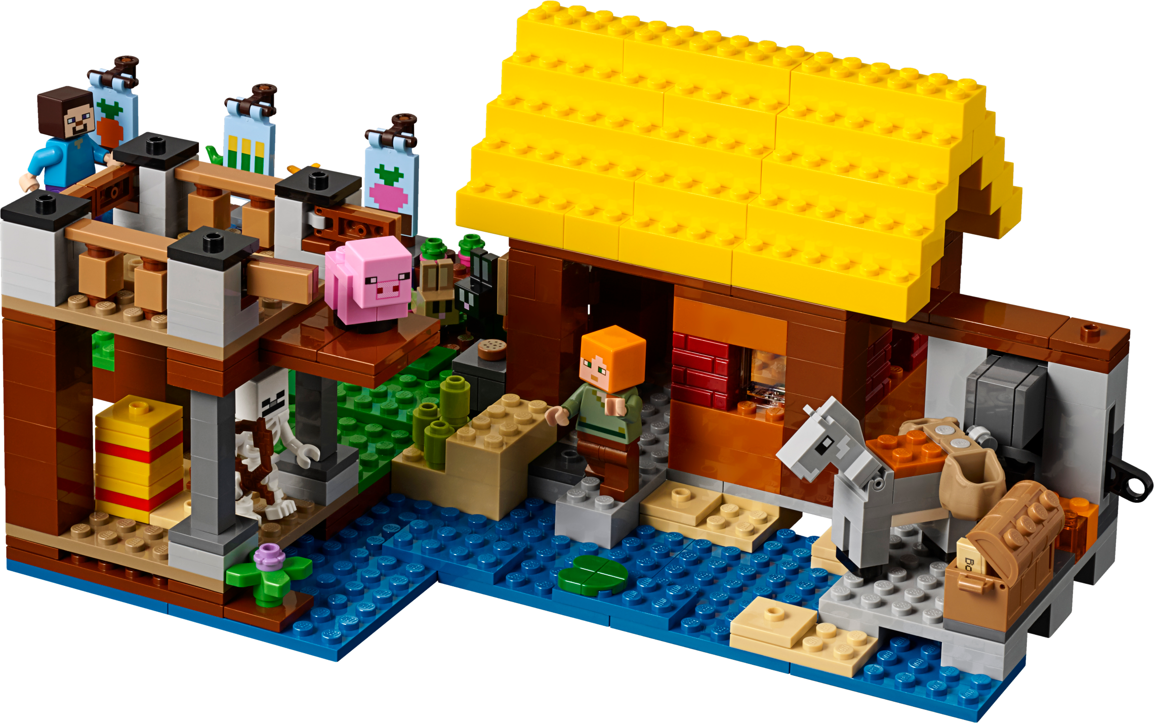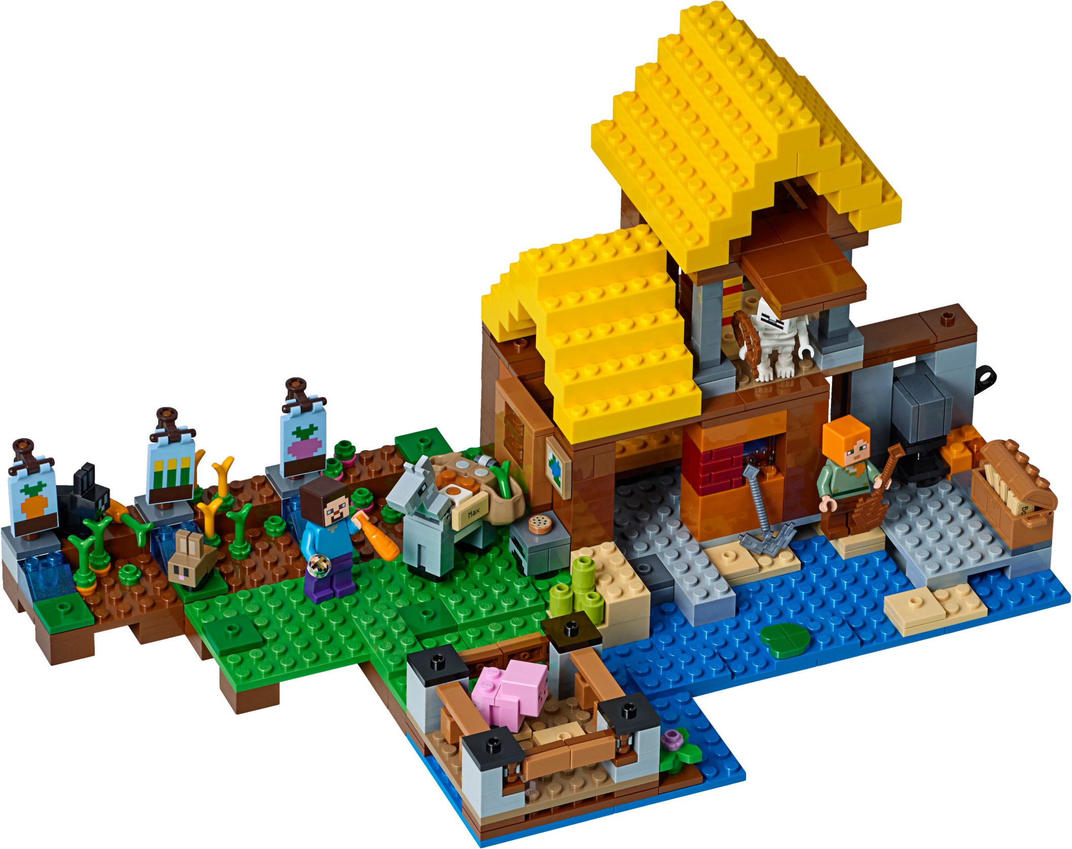 Use your LEGO® Minecraft™ creativity to build this exciting 2-level waterside Farm Cottage, featuring a detailed interior and a host of exterior features. Harvest wheat, carrots and beetroot, care for the baby pig and donkey, and protect your crops from the rabbits—and yourself from the skeleton! Enjoy hands-on Minecraft adventures with this easy-to-reconfigure, modular LEGO® Minecraft set; designed for young fans of the highly successful sandbox video game. Also includes Steve and Alex LEGO Minecraft minifigures. Includes 2 LEGO® Minecraft™ minifigures: Steve and Alex, plus donkey, baby pig, rabbit, baby rabbit and skeleton figures. Features a buildable Minecraft™ farm, including a 2-level house with a detailed interior, plus carrot, wheat and beetroot patches, animal pen, and grass and water areas. Harvest carrots, wheat and beetroot and transport them in the donkey's saddlebags. Use the nametags and the anvil to name the mobs. Watch out for the roaming skeleton after nightfall! Weapons include a pickaxe and a bow. Also includes a wooden shovel element. Easy-to-reconfigure modular design with 2 alternative model configurations. Set your imagination free—rebuild the set for more LEGO® Minecraft™ creations! This children's toy includes over 545 pieces and is suitable for ages 8+. Measures over 6” (17cm) high, 13” (34cm) wide and 7” (19cm) deep.
