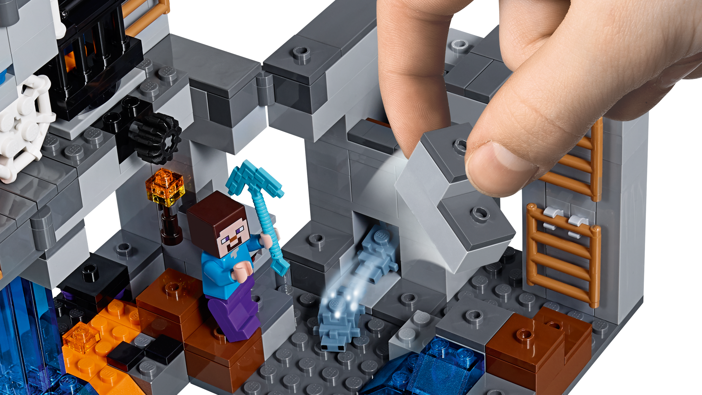 Descend the ladders to the depths of the Minecraft™ Overworld with this LEGO® Minecraft 21147 The Bedrock Adventures set. Use the diamond pickaxe or activate the TNT function to mine obsidian and 7 types of ore, and venture through caves and mines with water and lavafalls. Battle an array of hostile mobs, including a cave spider, zombie, Creeper™ and silverfish that spawn when you mine the rock face! Enjoy hands-on adventures with this LEGO Minecraft set—designed for fans of the highly successful video game. Easily swap the modular sections to redesign the model, and combine it with other sets to create your own unique LEGO Minecraft universe. Also includes Alex and Steve minifigures, plus a bat figure.