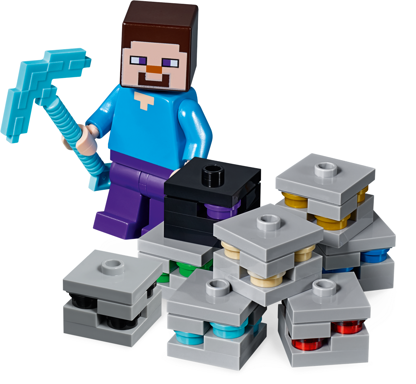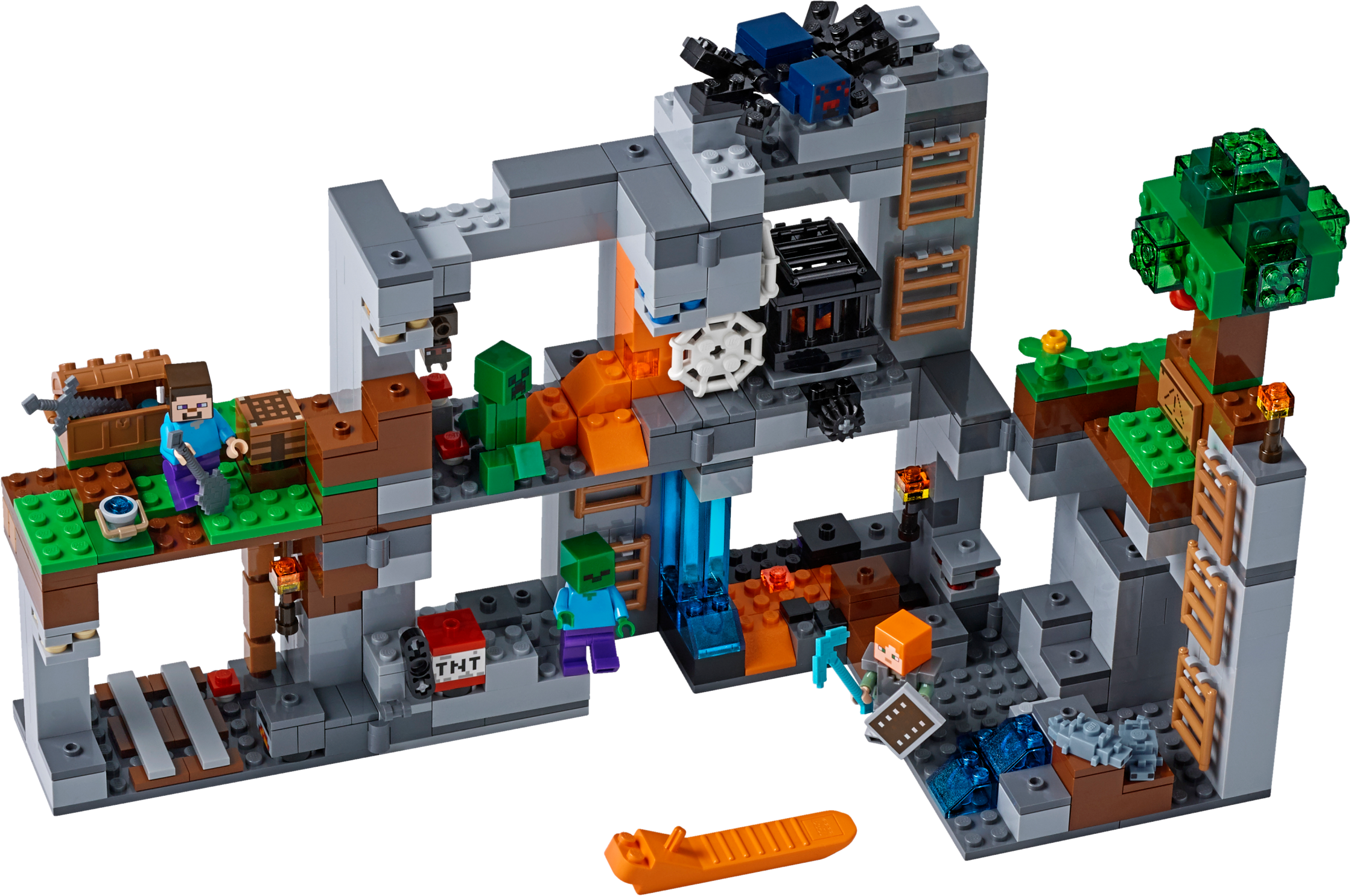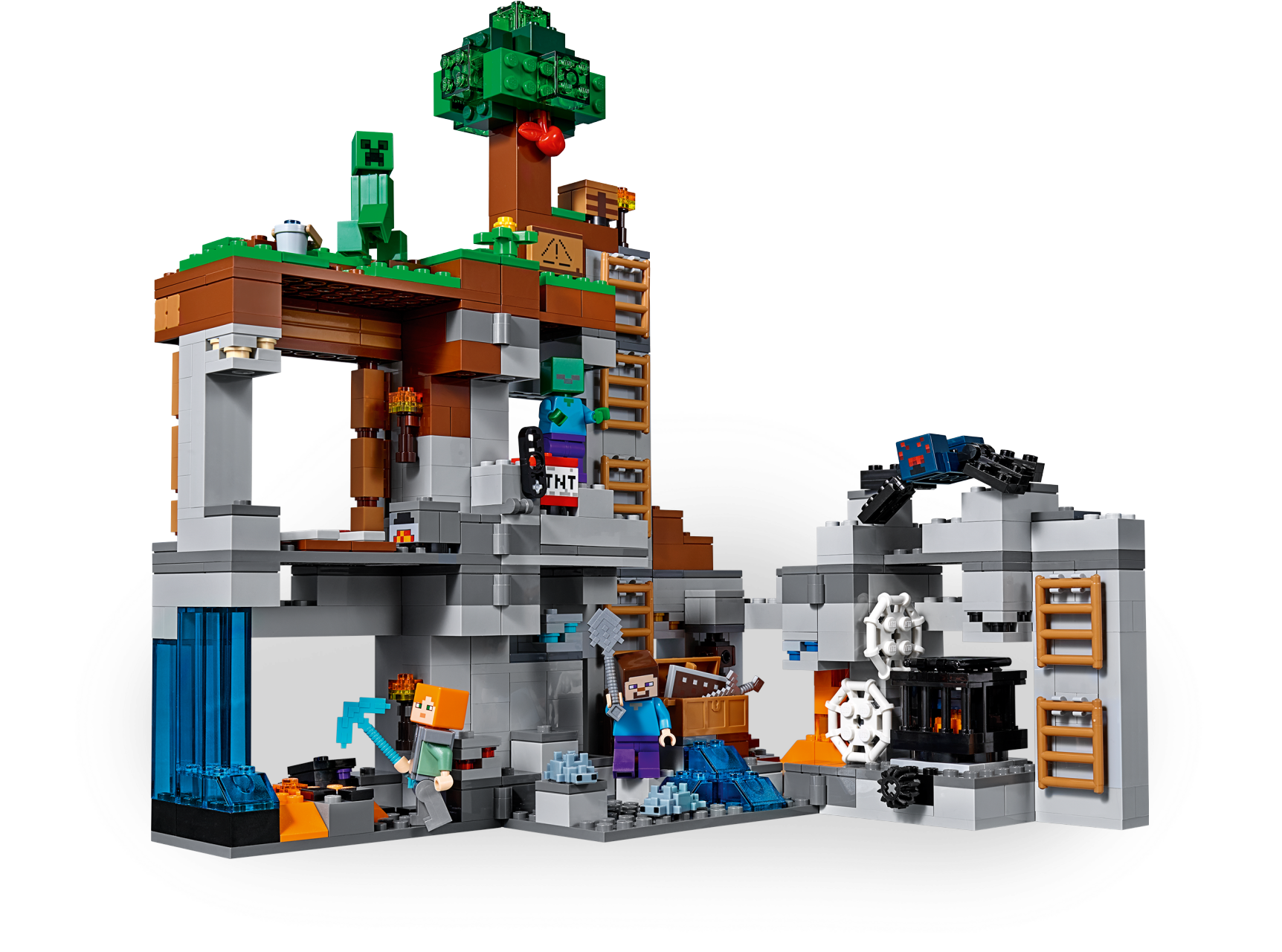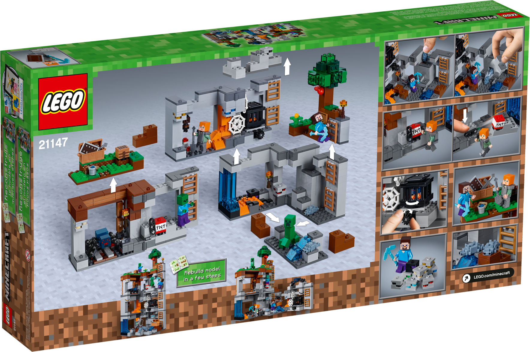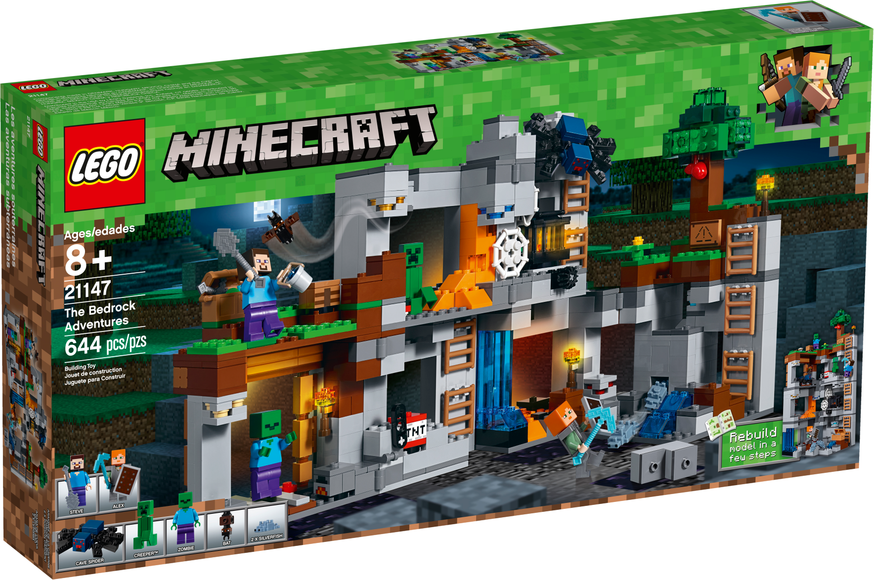 Includes 2 minifigures: Steve and Alex, plus a Creeper™, cave spider, zombie, bat and 2 silverfish figures.? Features a buildable LEGO® Minecraft™ setting with Overworld, mine and bedrock levels connected by a series of ladders, plus a rotating cave spider spawner, TNT blasting function, silverfish spawning function, tree, cobwebs, mushrooms, obsidian, lava and waterfalls, and 7 different ores.? Pluck the red apple from the tree to increase your food supplies.? Descend the series of ladders that lead from the Overworld to the bedrock.? Don your iron armor, grab your iron sword and prepare to battle the cave spider.? Look out for the roaming Creeper™ and lurking zombie.? Activate the TNT blast function to blast out the rock.? Mine obsidian and 7 types of ore with your diamond pickaxe, but look out for monster-egg blocks that spawn hostile silverfish!? Weapons include a sword and a pickaxe.? Accessory elements include a shield, armor, shovel, bucket, torches, crafting table, furnace and chest.? Easy-to-reconfigure modular design with 2 alternative model configurations.? Set your imagination free—rebuild the set for more LEGO® Minecraft™ creations!? This set includes over 640 pieces.? The Bedrock Adventures set measures over 7” (20cm) high, 13” (35cm) wide and 5” (14cm) deep.