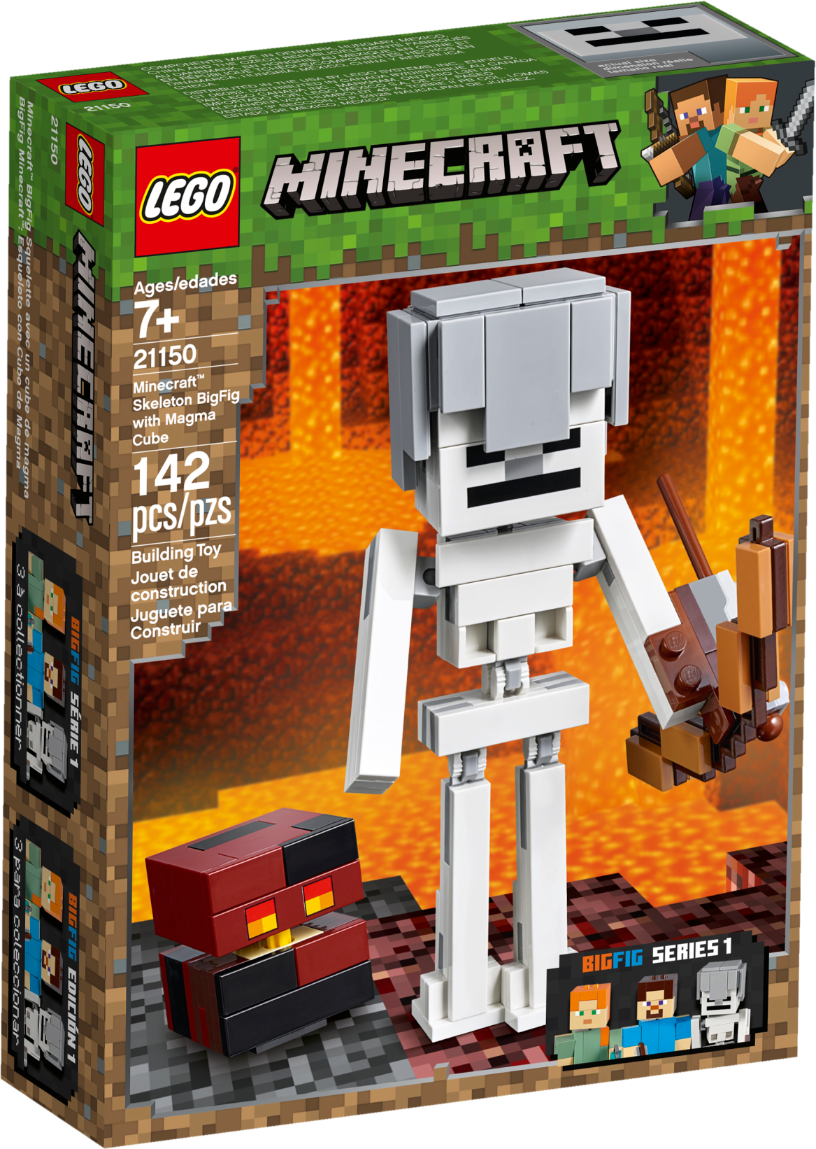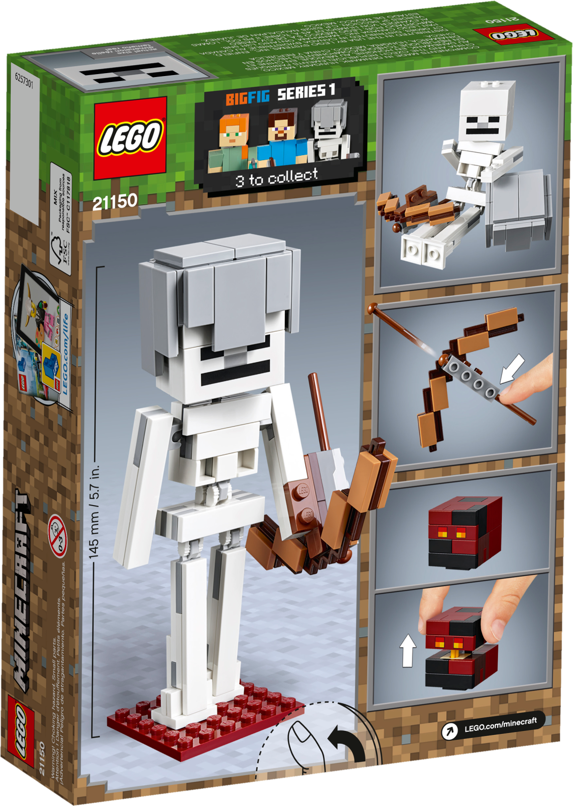 Buildable large-scale LEGO® Minecraft™ Skeleton action figure with posable joints, removable helmet and Minecraft bow that fires arrow elements. Also includes a buildable magma cube.