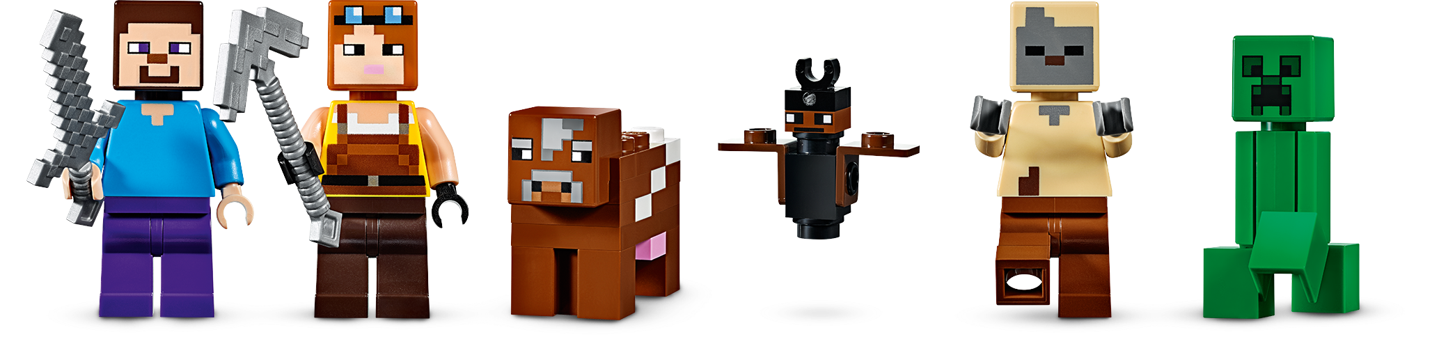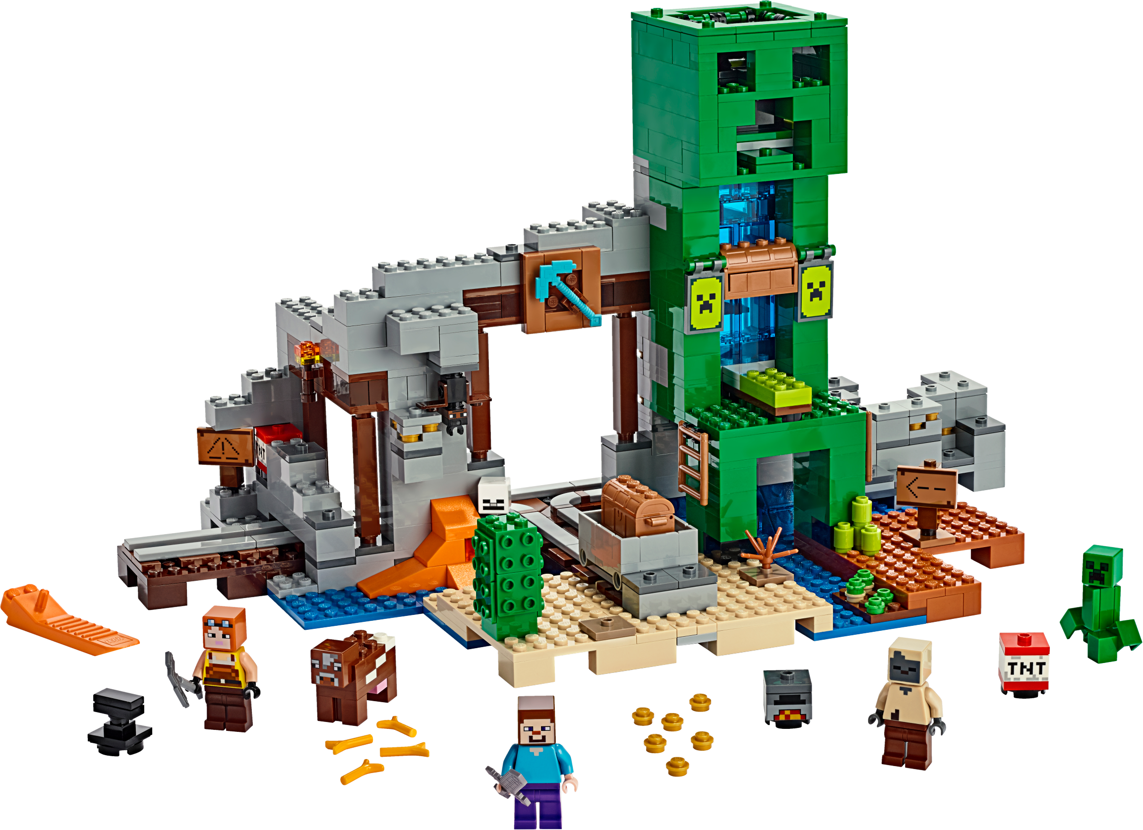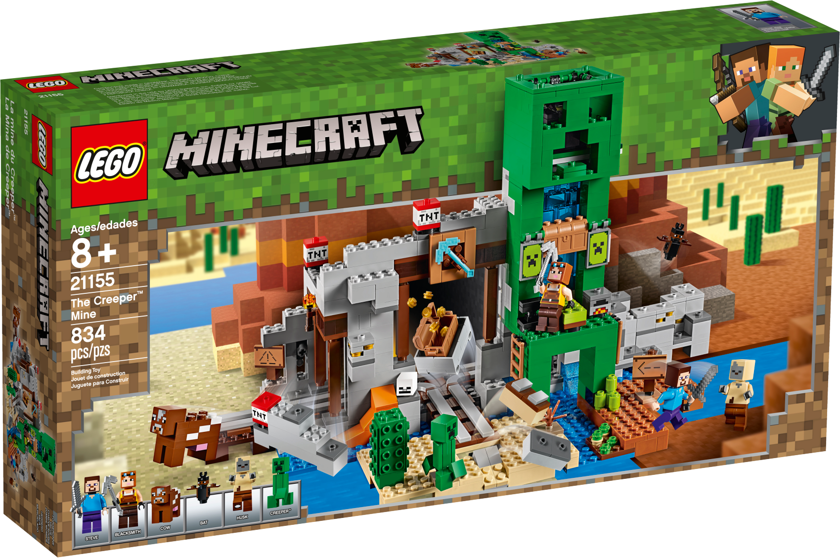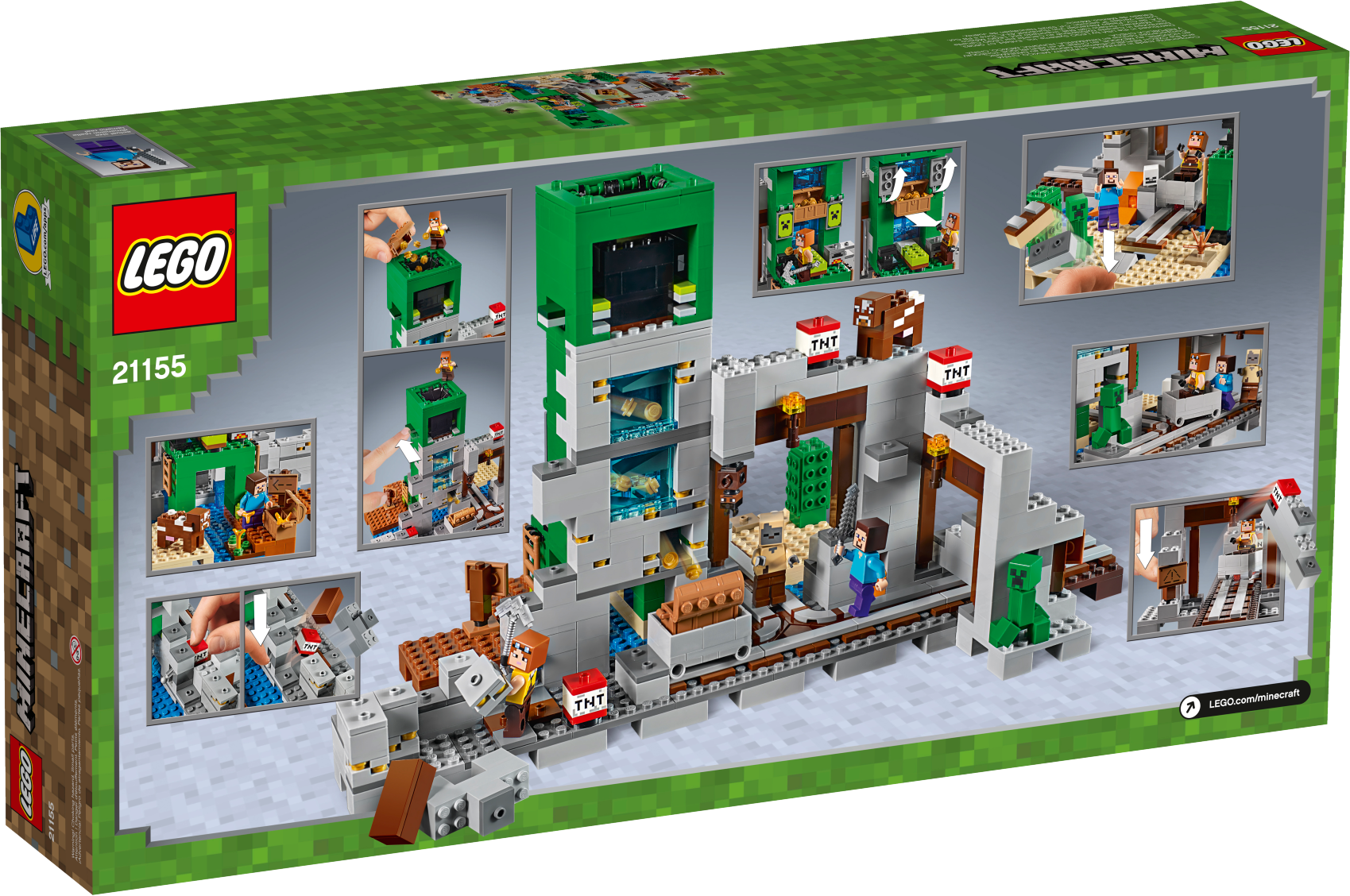 Enjoy action-packed Minecraft™ adventures with the LEGO® Minecraft 21155 The Creeper™ Mine set. Designed for fans of the record-breaking video game, this model is packed with exciting new-for-August-2019 features and functions. Kids can battle the Creeper and husk, blast out stone with the TNT and store mined gold in a giant Creeper statue that delivers it direct to a chest at the pull of a lever. This collectible Minecraft toy also features a working rail track with minecart and a detailed Minecraft shelter with a bed, anvil, oven, chest and a vegetable patch. It can be combined with other playsets to create a unique LEGO Minecraft universe for both play and display. Includes 3 minifigures: Steve, blacksmith and a husk, plus Creeper, cow and bat figures. Includes 3 minifigures: Steve, a new-for-August-2019 Minecraft™ blacksmith and a husk, plus Creeper™, cow and bat figures. Features a mine with rail track, minecart and 3 explosion functions; shelter with a large Creeper™ statue, 2 Creeper banners, ladders, bed, anvil and an oven; desert and mesa setting with 2 signs, cactus and irrigated vegetable patch. Use the Minecraft™ TNT to blast out the stone and clear the blocked rail track. Battle the husk with your iron sword. Hop aboard the minecart and head into the gold-rich Creeper™ Mine. Collect your treasure in the huge Creeper™ statue and then pull the lever to deliver it to the chest. Weapons include 2 pickaxes and a sword. Accessories include 3 TNT blocks, 2 chests and 4 golden ore elements. Set your imagination free—rebuild the set for more LEGO® Minecraft™ creations! This set includes over 830 pieces. Mine measures over 8” (22cm) high, 14” (38cm) wide and 8” (22cm) deep.