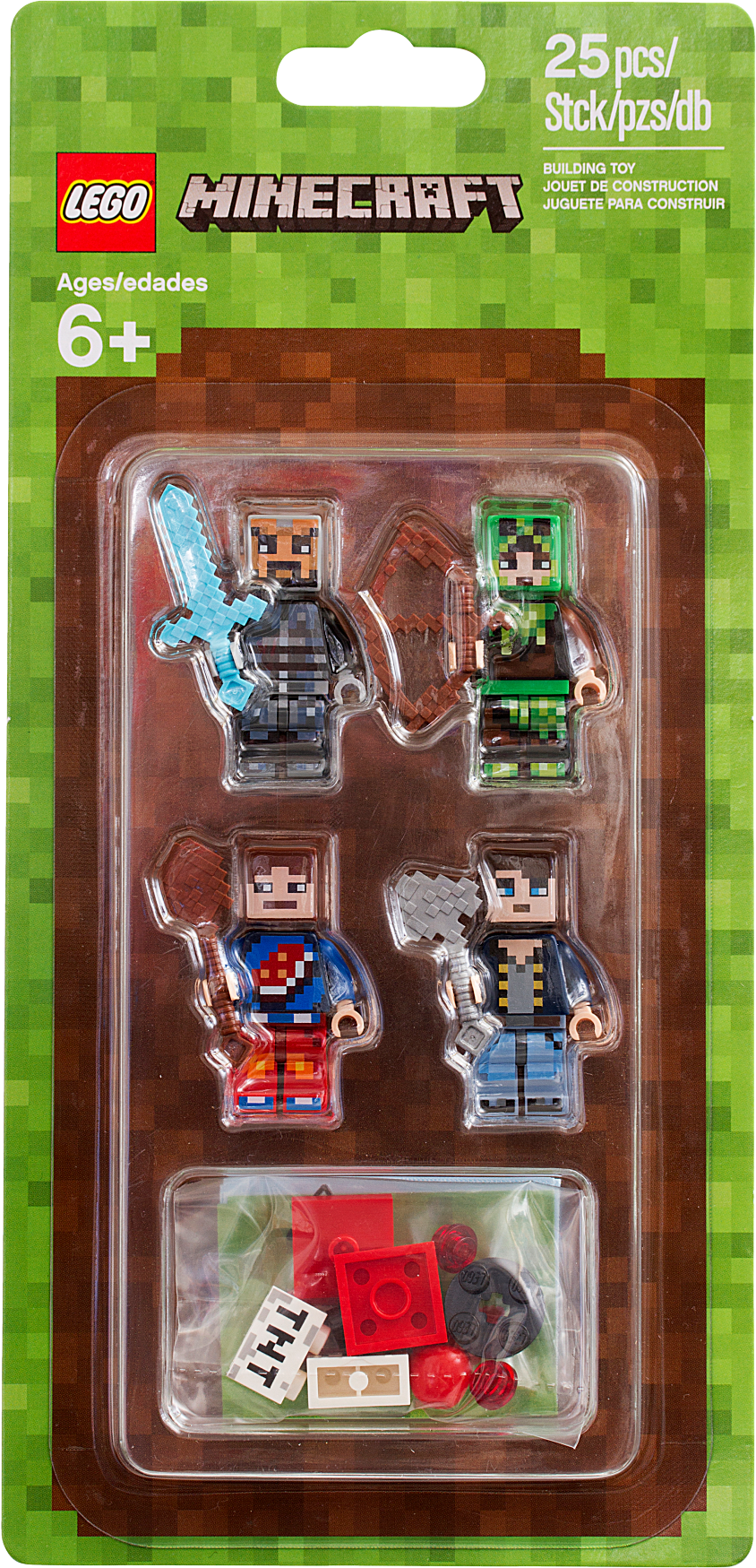 Expand your LEGO® Minecraft™ universe with these 4 awesome minifigures, each with a unique Minecraft skin. Rebuild the minifigures to create your own skin designs and take your pick from a stash of tools and weapons, including a sword, bow, shovel and an axe. A great gift for LEGO Minecraft builders. Includes 4 minifigures, each with a unique Minecraft skin, plus assorted tool and weapon elements. Rebuild the minifigures to create your own skin designs. Weapon and tool elements include a sword, bow, shovel and an axe. Expand your LEGO® Minecraft™ universe. Makes a great gift for LEGO® Minecraft™ builders. This set offers an age-appropriate play experience for ages 6 and over.