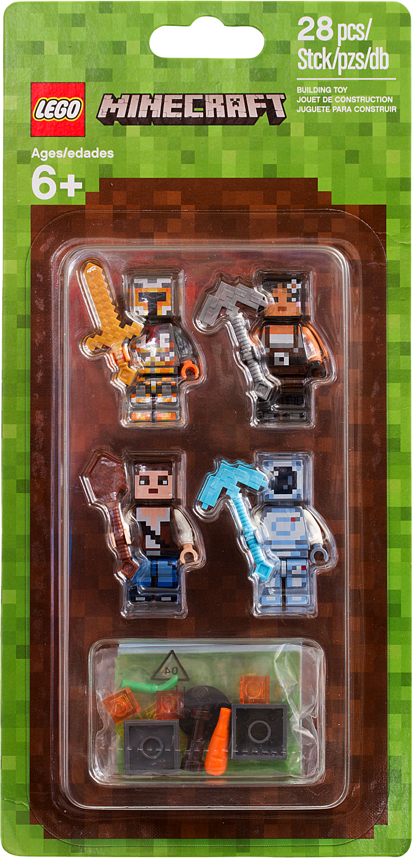 Expand your LEGO® Minecraft™ universe with these 4 awesome minifigures, each with a unique Minecraft skin. Rebuild the minifigures to create your own skin designs and take your pick from a stash of tools and weapons, including a sword, shovel and 2 pickaxes. A great gift for LEGO Minecraft builders. Includes 4 minifigures, each with a different Minecraft skin, plus assorted tool and weapon elements. Rebuild the minifigures to create your own skin designs. Weapon and tool elements include a sword, shovel and 2 pickaxes. Expand your LEGO® Minecraft™ universe. Makes a great gift for LEGO® Minecraft™ builders. This set offers an age-appropriate play experience for ages 6 and over.